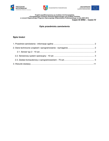WOJEWÓDZTWO PODKARPACKIE Projekt współfinansowany ze środków Unii Europejskiej z Europejskiego Funduszu Rozwoju Regionalnego oraz budŜetu Państwa w ramach Regionalnego Programu Operacyjnego Województwa Podkarpackiego na lata 2007-2013 Część B SIWZ – Cześć IV Opis przedmiotu zamówienia Spis treści 1. Przedmiot zamówienia - informacje ogólne ....................................................................... 2 2. Dane techniczne urządzeń i oprogramowania - wymagania .............................................. 2 2.1. Serwer typ 2 - 10 szt................................................................................................ 2 2.2. Serwerowy system operacyjny - 10 szt. ...................................................................... 3 2.3. Zestaw komputerowy z oprogramowaniem - 75 szt..................................................... 5 3. Warunki dostawy ..............................................................................................................11 1. Przedmiot zamówienia - informacje ogólne W ramach zamówienia w części IV zostaną zakupione: 1. Serwer typ 2 - 10 szt. 2. Serwerowy system operacyjny - 10 szt. 3. Zestaw komputerowy z oprogramowaniem - 75 szt. Wykonawca dostarczy we wskazane poniŜej lokalizacje urządzenia wraz ze sterownikami, dokumentacją oraz oprogramowanie wraz z licencjami. 2. Dane techniczne urządzeń i oprogramowania - wymagania 2.1. Serwer typ 2 - 10 szt. • Serwer fabrycznie nowy • Obudowa o wysokości 1U lub 2U, dedykowana do zamontowania w szafie rack 19” z zestawem szyn do mocowania w szafie i wysuwania w celach serwisowych. • Procesor który w rankingu umieszczonym pod adresem http://www.cpubenchmark.net/ (Search for your CPU Model -> CPU list -> Single CPU Systems -> Passmark CPU Mark) osiąga wynik min. 8 485 pkt. Zamawiający informuje, Ŝe zaoferowany procesor musi co najmniej 1 raz - w okresie od momentu wszczęcia postępowania do momentu upływu terminu składania ofert osiągnąć w rankingu wynik min. 8 485 pkt. Do oferty musi zostać dołączony i potwierdzony przez Wykonawcę wydruk z ww. strony internetowej. • Pamięć RAM: 32 GB z moŜliwością rozbudowy do minimum 144 GB. • MoŜliwość konfiguracji pamięci z ochroną memory mirror. • Płyta główna: dedykowana do pracy w serwerach. • Porty Minimum: - 2 porty RJ-45 sieciowe 1Gb Ethernet, - 1 port RJ-45 dedykowany do interfejsu zdalnego zarządzania, - 4 porty USB (w tym co najmniej jeden wewnętrzny), - 1 port VGA (15-pin video), - 1 port szeregowy, - porty do podłączenia klawiatury i myszy (PS/2), OA-XVI.272.4.2013 Str. 2 z 13 - 1 wbudowany slot na karty SD (Secure Digital), - min. dwa sloty PCI-Express, minimum jeden slot pozwalający na instalację karty pełnowymiarowej. • Nagrywarka DVD z oprogramowaniem do nagrywania. • Wbudowany kontroler RAID SAS obsługujący poziomy RAID 0/1/1+0, z podtrzymaniem bateryjnym. • MoŜliwość instalacji min. 8 dysków SAS, • 2 dyski po 300 GB o prędkości obrotowej minimum 10 000 rpm, interfejsie SAS, HotPlug. • Redundantne zasilacze Hot-Plug o minimalnej mocy 750W. • Wiatraki: Ilość wiatraków wymagana do zapewnienia redundancji N+1. Redundantne wentylatory wewnątrz obudowy serwera. • Serwer musi być wyposaŜony w kartę zdalnego zarządzania (konsoli) pozwalającej na: włączenie, wyłączenie i restart serwera, podgląd logów sprzętowych serwera i karty, przejęcie pełnej konsoli tekstowej serwera niezaleŜnie od jego stanu (takŜe podczas startu, restartu OS) oraz moŜliwości podłączenia wirtualnych napędów DVD i FDD jak równieŜ moŜliwość bootowania systemu z tych napędów. • Musi być dostępna moŜliwość wykonania upgradu karty zarządzającej. Wszystkie powyŜsze funkcjonalności muszą być dostępne bez konieczności dokładania dodatkowych kart sprzętowych w sloty PCI-X/PCI-Express. • Pozostałe wymagania: panel serwisowy, prezentujący poprawność pracy poszczególnych elementów serwera. • Systemy operacyjne: serwer musi posiadać wsparcie dla następujących systemów operacyjnych: MS Windows Server 2003, MS Windows Server 2008, MS Windows Server 2012, Linux RedHat, Linux SuSE, VMware ESX w wersji co najmniej 5, • Gwarancja i serwis 3 lata gwarancji na części, z naprawą w miejscu instalacji serwera, czas reakcji: następny dzień roboczy od zgłoszenia awarii. W przypadku awarii dysku twardego uszkodzony dysk nie będzie oddawany do serwisu w celu naprawy i po wymianie na nowy zostanie u Zamawiającego. 2.2. Serwerowy system operacyjny - 10 szt. Windows SRV 2012 standard OLP NL Gov 2Proc. wraz z 10 licencjami CAL per User lub równowaŜny. Przez produkt równowaŜny w takim przypadku naleŜy rozumieć oprogramowanie, które spełnia następujące parametry: OA-XVI.272.4.2013 Str. 3 z 13 1. Wbudowana zapora internetowa (firewall) z obsługą definiowanych reguł dla ochrony połączeń internetowych i intranetowych. 2. Zlokalizowane w języku polskim, co najmniej następujące elementy: menu, przeglądarka internetowa, pomoc, komunikaty systemowe. 3. Wsparcie dla większości powszechnie uŜywanych urządzeń peryferyjnych (drukarek, urządzeń sieciowych, standardów USB, Plug&Play) 4. Graficzny interfejs uŜytkownika. 5. Obsługa systemów wieloprocesorowych. 6. Obsługa platform sprzętowych x86, x64. 7. MoŜliwość zdalnej konfiguracji, administrowania oraz aktualizowania systemu. 8. MoŜliwość implementacji następujących funkcjonalności bez potrzeby instalowania dodatkowych produktów (oprogramowania): a. podstawowe usługi sieciowe: DNS, DHCP b. usługi katalogowe pozwalające na zarządzanie zasobami w sieci (uŜytkownicy, komputery, drukarki, udziały sieciowe) c. zdalna dystrybucja oprogramowania na stacje robocze d. praca zdalna na serwerze z wykorzystaniem terminala (cienkiego klienta) lub odpowiednio skonfigurowanej stacji roboczej e. PKI (Centrum Certyfikatów, obsługa klucza publicznego i pry