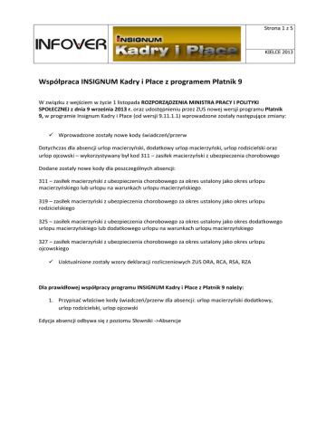 Strona 1 z 5 KIELCE 2013 Współpraca INSIGNUM Kadry i Płace z programem Płatnik 9 W związku z wejściem w życie 1 listopada ROZPORZĄDZENIA MINISTRA PRACY I POLITYKI SPOŁECZNEJ z dnia 9 września 2013 r. oraz udostępnieniu przez ZUS nowej wersji programu Płatnik 9, w programie Insignum Kadry i Płace (od wersji 9.11.1.1) wprowadzone zostały następujące zmiany: Wprowadzone zostały nowe kody świadczeń/przerw Dotychczas dla absencji urlop macierzyński, dodatkowy urlop macierzyński, urlop rodzicielski oraz urlop ojcowski – wykorzystywany był kod 311 – zasiłek macierzyński z ubezpieczenia chorobowego Dodane zostały nowe kody dla poszczególnych absencji: 311 – zasiłek macierzyński z ubezpieczenia chorobowego za okres ustalony jako okres urlopu macierzyńskiego lub urlopu na warunkach urlopu macierzyńskiego 319 – zasiłek macierzyński z ubezpieczenia chorobowego za okres ustalony jako okres urlopu rodzicielskiego 325 – zasiłek macierzyński z ubezpieczenia chorobowego za okres ustalony jako okres dodatkowego urlopu macierzyńskiego lub dodatkowego urlopu na warunkach urlopu macierzyńskiego 327 – zasiłek macierzyński z ubezpieczenia chorobowego za okres ustalony jako okres urlopu ojcowskiego Uaktualnione zostały wzory deklaracji rozliczeniowych ZUS DRA, RCA, RSA, RZA Dla prawidłowej współpracy programu INSIGNUM Kadry i Płace z Płatnik 9 należy: 1. Przypisać właściwe kody świadczeń/przerw dla absencji: urlop macierzyński dodatkowy, urlop rodzicielski, urlop ojcowski Edycja absencji odbywa się z poziomu Słowniki ->Absencje Strona 2 z 5 KIELCE 2013 2. Zmodyfikować sposoby wynagrodzenia dla składników, które przy wyliczaniu wykorzystują funkcję pobierania danych z kartoteki świadczeń przerw (f.SPDni(), f.SPKwota()). UWAGA: konfiguracja zależy od ustawień składników w firmie, sposoby wynagrodzenia konfiguruje administrator Przykładowa konfiguracja składnika Zasiłek macierzyński: Strona 3 z 5 KIELCE 2013 3. Skonfigurować deklaracje ZUS w zakresie nowych pól dodanych do deklaracji Eksport/Import -> Program Płatnik -> Konfiguracja Nowe pola dodane do konfiguracji: ZUS DRA blok IV: - p25 Kwota składek na ubezpieczenie chorobowe finansowana przez płatnika - p28 Kwota składek na ubezpieczenie chorobowe finansowana przez budżet państwa - p29 Kwota składek na ubezpieczenie wypadkowe finansowana przez budżet państwa - p34 Kwota składek na ubezpieczenie chorobowe finansowana przez Fundusz Kościelny blok VII: - p1 Kwota należnych składek finansowana przez płatnika - p2 Kwota należnych składek finansowana przez ubezpieczonych dawne p1 Strona 4 z 5 KIELCE 2013 ZUS RCA blok III.B: - p10 Kwota składki na ubezpieczenie wypadkowe finansowana przez ubezpieczonego - p13 Kwota składki na ubezpieczenie chorobowe finansowana przez płatnika - p15 Kwota składki na ubezpieczenie emerytalne finansowana przez budżet państwa - p16 Kwota składki na ubezpieczenie rentowe finansowana przez budżet państwa - p17 Kwota składki na ubezpieczenie chorobowe finansowana przez budżet państwa - p18 Kwota składki na ubezpieczenie wypadkowe finansowana przez budżet państwa - p23 Kwota składki na ubezpieczenie emerytalne finansowana przez Fundusz Kościelny - p24 Kwota składki na ubezpieczenie rentowe finansowana przez Fundusz Kościelny - p25 Kwota składki na ubezpieczenie chorobowe finansowana Fundusz Kościelny - p26 Kwota składki na ubezpieczenie wypadkowe finansowana Fundusz Kościelny blok III.C: - p2 Kwota należnej składki finansowana przez płatnika - p3 Kwota należnej składki finansowana z budżetu państwa bezpośrednio do ZUS - p5 Kwota należnej składki finansowana przez Fundusz Kościelny ZUS RZA blok III.B: - p3 Kwota należnej składki finansowana przez płatnika - p4 Kwota należnej składki finansowana z budżetu państwa bezpośrednio do ZUS - p5 Kwota należnej składki finansowana przez ubezpieczonego to co było p3 - p6 Kwota należnej składki finansowana przez Fundusz Kościelny UWAGA: Domyślnie podczas dodawania zestawów Kedu i generowania deklaracji rozliczeniowych ustawione jest generowanie wg specyfikacji we/wy 2.2 (Płatnik 9). Istnieje możliwość wygenerowania deklaracji dla Płatnika 8. W tym celu podczas dodawania zestawienia należy ustawić odpowiednią wersję Eksport/Import -> Program Płatnik-> Zestawy XML – wersja dla Płatnika 8 XML wersja 2.2 – wersja dla Płatnika 9 Strona 5 z 5 KIELCE 2013