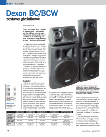 TEST Dexon BC/BCW Dexon BC/BCW zestawy g³oœnikowe Tomasz Wróblewski Dexon jest czesk¹ firm¹ zajmuj¹ c¹ siê produkcj¹ i dystrybucj¹ szeroko pojêtego sprzêtu nag³o œnieniowego. Zestawy g³oœnikowe z serii BC to jej najnowszy pro dukt, zwracaj¹cy uwagê atrakcyj n¹ cen¹ i solidnym wykonaniem. W skład serii wchodzi sześć modeli głośników produkowanych w wersji pasywnej i aktywnej (w sumie dwanaście modeli). Mamy więc dwa modele subwooferów: z głośnikiem 15-calowym oraz 12-calowym i cztery modele szerokopasmowych zestawów dwudrożnych wyposażonych w głośniki niskotonowe o średnicy membrany 8, 10, 12 i 15 cali. Do testów otrzymaliśmy wszystkie zestawy wchodzące w skład serii BC, za wyjątkiem subwoofera z głośnikiem 12-calowym. Do porównań wykorzystałem zestaw Pol-Audio DS300 Active charakteryzujący się wyjątkowo wyrównaną charakterystyką częstotliwościową, dzięki czemu doskonale sprawdza się jako wiarygodny punkt odniesienia przy tego typu testach. Opis budowy Obudowy wszystkich testowanych zestawów wykonane są z tworzywa sztucznego o wysokim stopniu twardości i wytrzymałości na uszkodzenia mechaniczne. Zestawy mogą pracować ustawione na ziemi, na statywie głośnikowym oraz podwieszone (punkty do przykręcenia zawiesi znajdują się w każdym zestawie). Modele szerokopasmowe mogą pracować również w pozycji poziomej, w charakterze odsłuchów podłogowych, ale wówczas trzeba zamontować dostarczone w zestawie płozy stabilizujące ich pozycję. W przypadku pracy w poziomie dużym ułatwieniem Ceny BC800 – 590 z³ BC800A – 890 z³ BC1000 – 890 z³ BC1000A – 1.290 z³ BC1200 – 1.290 z³ BC1200A – 1.790 z³ BC1500 – 1.590 z³ BC1500A – 2.190 z³ subwoofer pasywny BCW1500 – 1.390 z³ subwoofer aktywny BCW1500A – 1.890 z³ Dostarczy³ Dexon Poland, Wrzeœnia tel. (061) 438-91-23, www.dexon.pl Przetworniki Moc RMS Efektywnoœæ/ maks. SPL Pasmo przenoszenia (-3dB) Wymiary Waga 74 jest możliwość przekręcania tuby drivera wysokotonowego o kąt 90 stopni. Subwoofer wyposażony jest w górne gniazdo dla statywu, na którym można ustawić zestaw szerokopasmowy. Na spodzie każdej kolumny znajdują się solidne gumowe nóżki, a na górze odpowiadające im gniazda pozwalające na postawienie na niej kolumny tego samego typu. W subwooferze oraz zestawach szeroko- BC800/BC800A BC1000/BC1000A BC1200/BC1200A BC1500/BC1500A BCW1500/BCW1500A 8” + driver 34mm 100W/120W 92dB/113dB 10” + driver 34mm 250W/120W 95dB/116dB 12” + driver 44mm 300W/300W 97dB/121dB 15” + driver 44mm 300W/300W 98dB/122dB 15” 500W/400W 97dB/122dB 65Hz-18kHz 55Hz-18kHz 50Hz-18kHz 40Hz-18kHz 277×400×257 6,5kg/8,6kg 321×464×321 10kg/10,5kg 415×620×391 18kg/23kg 485×700×460 26kg/30,5kg 40Hz-1,5kHz/ 45Hz-(80-25)Hz 485×700×460 25,2kg/28,5kg Cztery modele zestawów szerokopasmowych wchodz¹cych w sk³ad serii BC (od góry i od lewej): BC800, BC1200, BC1500 i BC1200. Œrednica membrany g³oœnika niskotonowego zakodowana jest w oznaczeniu liczbowym po odrzuceniu zer. Ka¿dy z tych zestawów wystêpuje w wersji pasywnej i aktywnej (z liter¹ A na koñcu). pasmowych z głośnikiem 15-calowym zainstalowano dwa boczne uchwyty. Ich ustawienie jest jednak niefortunne (w pionie zamiast w poziomie) co skutkuje tym, że kolumny są dość niewygodne do przenoszenia. W zestawach z głośnikiem 12 i 10-calowym mamy już tylko jeden uchwyt boczny, a w zestawach z głośnikiem 8-calowym nie znajdziemy go wcale. Wszystkie zestawy to konstrukcje typu bass-reflex z efektownie wyprofilowanymi wylotami znajdującymi się na przedniej ścianie, tuż obok tuby przetwornika wysokotonowego. Membrana głośnika niskotonowego zasłonięta Estrada i Studio • grudzieñ 2004 Dexon BC/BCW jest solidną, stalową siatką. Znacznie drobniejsza siateczka chroni też wylot drivera. Modele pasywne wyposażone są w dwa równoległe gniazda speakon, ale bez możliwości pracy w trybie bi-wire. W przypadku zestawów szerokopasmowych modele aktywne posiadają równolegle połączone ze sobą wejście i wyjście XLR, które może współpracować z sygnałem o poziomie liniowym lub mikrofonowym. Z powodu braku załączanego napięcia fantom nie ma niestety możliwości współpracy z mikrofonami pojemnościowymi oraz aktywnymi DI-boxami. Wejście mikrofonowe może więc współpracować tylko z mikrofonami dynamicznymi i mikrofonami pojemnościowymi z własnym zasilaniem. Można je też wykorzystać w sytuacji, gdy wejście liniowe okaże się zbyt mało czułe. Inteligentnie rozwiązano kwestię przełącznika czułości MIC/LINE, którego nie można przez przypadek wcisnąć. Tylny panel zestawów aktywnych stanowi jednocześnie radiator chłodzący stopnia mocy. Podczas pracy potrafi on dość mocno się nagrzać, ale nie do tego stopnia, by nie można było dotknąć go dłonią. Zestawy szerokopasmowe posiadają dwudrożny korektor niskich i wysokich tonów, a subwoofer filtr dolnoprzepustowy o regulowanej częstotliwości odcięcia, pozwalający od góry ograniczyć przenoszone pasmo (od 80Hz do 250Hz). Wyjście z subwoofera, które podłączamy do zestawów szerokopasmowych, jest wyprowadzone przed tym filtrem, więc sygnał podawany dalej jest pełnopasmowy. Wadą tego rozwiązania jest fakt, że te same częstotliwości są przetwarzane jednocześnie przez subwoofer jak i zestaw szerokopasmowy. Można wprawdzie skorzystać z funkcji odwrócenia polaryzacji sygnału w subwooferze (przycisk INV), ale nie eliminuje to do końca ewentualnych problemów fazowych z przetwarzaniem najniższych tonów. Zestawy 12 i 15-calowe Zestawy z głośnikami o średnicy 12 i 15 cali różnią się od siebie jedynie gabarytami i wielkością zastosowanego przetwornika niskotonowego W obu przypadkach 44-milimetrowy driver i współpracująca z nim tuba są takie same. Zestaw aktywny z piętnastką przy głośnym słuchaniu zwraca uwagę dość wyraźnymi brakami w zakresie wyższego 