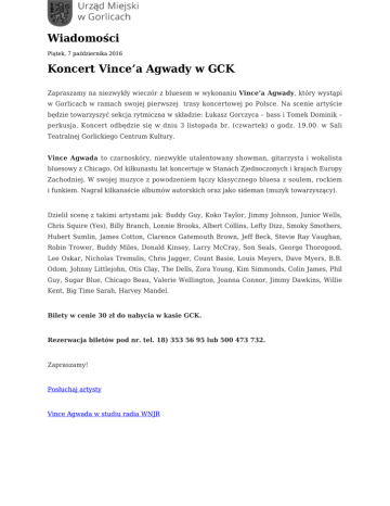 Wiadomości Piątek, 7 października 2016 Koncert Vince’a Agwady w GCK Zapraszamy na niezwykły wieczór z bluesem w wykonaniu Vince’a Agwady, który wystąpi w Gorlicach w ramach swojej pierwszej trasy koncertowej po Polsce. Na scenie artyście będzie towarzyszyć sekcja rytmiczna w składzie: Łukasz Gorczyca – bass i Tomek Dominik – perkusja. Koncert odbędzie się w dniu 3 listopada br. (czwartek) o godz. 19.00. w Sali Teatralnej Gorlickiego Centrum Kultury. Vince Agwada to czarnoskóry, niezwykle utalentowany showman, gitarzysta i wokalista bluesowy z Chicago. Od kilkunastu lat koncertuje w Stanach Zjednoczonych i krajach Europy Zachodniej. W swojej muzyce z powodzeniem łączy klasycznego bluesa z soulem, rockiem i funkiem. Nagrał kilkanaście albumów autorskich oraz jako sideman (muzyk towarzyszący). Dzielił scenę z takimi artystami jak: Buddy Guy, Koko Taylor, Jimmy Johnson, Junior Wells, Chris Squire (Yes), Billy Branch, Lonnie Brooks, Albert Collins, Lefty Dizz, Smoky Smothers, Hubert Sumlin, James Cotton, Clarence Gatemouth Brown, Jeff Beck, Stevie Ray Vaughan, Robin Trower, Buddy Miles, Donald Kinsey, Larry McCray, Son Seals, George Thorogood, Lee Oskar, Nicholas Tremulis, Chris Jagger, Count Basie, Louis Meyers, Dave Myers, B.B. Odom, Johnny Littlejohn, Otis Clay, The Dells, Zora Young, Kim Simmonds, Colin James, Phil Guy, Sugar Blue, Chicago Beau, Valerie Wellington, Joanna Connor, Jimmy Dawkins, Willie Kent, Big Time Sarah, Harvey Mandel. Bilety w cenie 30 zł do nabycia w kasie GCK. Rezerwacja biletów pod nr. tel. 18) 353 56 95 lub 500 473 732. Zapraszamy! Posłuchaj artysty Vince Agwada w studiu radia WNJR