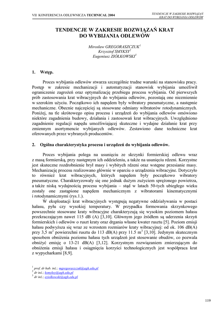 VII KONFERENCJA ODLEWNICZA TECHNICAL 2004 TENDENCJE W ZAKRESIE ROZWIĄZAŃ KRAT DO WYBIJANIA ODLEWÓW TENDENCJE W ZAKRESIE ROZWIĄZAŃ KRAT DO WYBIJANIA ODLEWÓW Mirosław GREGORASZCZUK1 Krzysztof SMYKSY2 Eugeniusz ZIÓŁKOWSKI3 1. Wstęp. Proces wybijania odlewów stwarza szczególnie trudne warunki na stanowisku pracy. Postęp w zakresie mechanizacji i automatyzacji stanowisk wybijania umożliwił ograniczenie zagrożeń oraz optymalizację przebiegu procesu wybijania. Od pierwszych prób zastosowania krat wibracyjnych do wybijania odlewów, pozostają one niezmiennie w szerokim użyciu. Początkowo ich napędem były wibratory pneumatyczne, a następnie mechaniczne. Obecnie najczęściej są stosowane odmiany wibratorów rotodynamicznych. Poniżej, na tle skrótowego opisu procesu i urządzeń do wybijania odlewów omówiono niektóre zagadnienia budowy, działania i zastosowań krat wibracyjnych. Uwzględniono zagadnienie regulacji napędu umożliwiającej skuteczne i wydajne działanie krat przy zmiennym asortymencie wybijanych odlewów. Zestawiono dane techniczne krat oferowanych przez wybranych producentów. 2. Ogólna charakterystyka procesu i urządzeń do wybijania odlewów. Proces wybijania polega na usunięciu ze skrzynki formierskiej odlewu wraz z masą formierską, przy następnym ich oddzieleniu, a także na usunięciu rdzeni. Korzystne jest skuteczne rozdrobnienie brył masy i wybitych rdzeni oraz wstępne przesianie masy. Mechanizację procesu realizowano głównie w oparciu o urządzenia wibracyjne. Dotyczyło to również krat wibracyjnych, których napędem były początkowo wibratory pneumatyczne. Charakteryzowały się one jednak dużym zużyciem sprężonego powietrza, a także niską wydajnością procesu wybijania – stąd w latach 50-tych ubiegłego wieku zostały one zastąpione napędem mechanicznym z wibratorami kinematycznymi i rotodynamicznymi (rys.1.). W eksploatacji krat wibracyjnych występują negatywne oddziaływania w postaci hałasu, pyłu czy wysokiej temperatury. W przypadku formowania skrzynkowego powszechnie stosowane kraty wibracyjne charakteryzują się wysokim poziomem hałasu przekraczającym nawet 115 dB (A) [3,10]. Głównym jego źródłem są uderzenia skrzyń formierskich i odlewów o ruszt kraty oraz drgania własne kwater rusztu [5]. Poziom emisji hałasu podwyższa się wraz ze wzrostem rozmiarów kraty wibracyjnej: od ok. 106 dB(A) przy 3,5 m2 powierzchni rusztu do 113 dB(A) przy 11.5 m3 [3,10]. Jedynym skutecznym sposobem obniżenia poziomu hałasu tych urządzeń jest stosowanie obudów, co pozwala obniżyć emisję o 13-21 dB(A) [3,12]. Korzystnym rozwiązaniem zmierzającym do obniżenia emisji hałasu i osiągnięcia korzyści technologicznych jest współpraca krat z wypycharkami [8,9]. 1 prof. dr hab. inż.; [email protected] dr inż.; [email protected] 3 dr inż.; [email protected] 2 119 VII KONFERENCJA ODLEWNICZA TECHNICAL 2004 Odlewnictwo XXI wieku technologie, maszyny i urządzenia odlewnicze W automatycznych liniach formowania bezskrzynkowego kraty są często zastępowane obrotowymi lub wibracyjnymi bębnami wieloczynnościowymi. Stosowanie urządzeń bębnowych poprawia warunki pracy. Przy poprawnym rozwiązaniu urządzenia, poziom emisji hałasu nie przekracza dopuszczalnych wartości. Ponadto stworzone są warunki do eliminacji dodatkowych emitorów hałasu (homogenizator, chłodziarka) [4,6,7]. Alternatywne rozwiązania dla krat i bębnów- pneumatyczne urządzenia impulsowe (niskoi wysokociśnieniowe), pozwalają osiągać bardzo niski poziom emisji hałasu na stanowiskach wybijania zapewniając przy tym hermetyzację procesu [8]. Metody te nie znalazły jednak szerokiego rozpowszechnienia. Nadal dominują, więc metody wibracyjnego wybijania, wykorzystujące głównie kraty wibracyjne. Udoskonalono znacząco ich konstrukcję oraz zastosowano nowoczesne układy sterowania. 3. Kraty wibracyjne i ich działanie. Przykładowe schematy krat wibracyjnych przedstawiono na rysunku 1. Kraty z napędem kinematycznym- rys.1a, zostały zastąpione przez napęd rotodynamiczny: jednomasowy (rys.1b, 1e, 1f) lub dwumasowy (rys.1c, 1d). Postępem mechanizacji procesu wybijania stały się tzw. kraty samorozładowcze (rys.1d i e). a) b) c) d) e) f) Rys. 1. Schematy krat wibracyjnych z różnymi rodzajami napędu: a– kinematycznym mimośrodowym, b– rotodynamicznym jednomasowym, c– rotodynamicznym dwumasowym, d– samorozładowcza z wibratorem dwumasowym, e– samorozładowcza z wibratorem jednomasowym, f– udarowa. Szczególnym rozwiązaniem, rzadziej stosowanym, jest krata udarowa (rys.1.f), w konstrukcji charakteryzująca się działaniem wibracyjnego bijaka, a w eksploatacji relatywnie mniejszym zużyciem energii napędowej. Ograniczeniem zastosowań krat udarowych jest rozmiar skrzyń formierskich, jakie mogą być wybijane przy danym rozstawie podpór. W procesie wybijania dużych i ciężkich odlewów, możliwe jest również zestawianie kilku krat wibracyjnych (z uwzględnieniem nośności poszczególnych krat). Rozwiązanie takie proponuje przykładowo FMO- Kraków dla typoszeregu krat- WKM [11]. Na rysunku 2 przedstawiono przykładowe rozwiązania krat wibracyjnych oferowanych przez różne firmy. 120 Nowa Sól 3-4.06.2004 r. VII KONFERENCJA ODLEWNICZA TECHNICAL 2004 TENDENCJE W ZAKRESIE ROZWIĄZAŃ KRAT DO WYBIJANIA ODLEWÓW a) b) c) d) Rys. 2. Rozwiązania krat wibracyjnych różnych firm [11,12]: a- Palmer (seria SD), bSCHENCK PROCESS GmbH, c- General Kinematics, d- Conveyor Dynamics Corporation. Jak wspomniano wcześniej zastosowanie obudowy krat umożliwia skuteczne ograniczenie emisji pyłów oraz hałasu [5,12]. W kraju obudowy oferuje FMO- Kraków (typu KWO oraz KWOP- rys.3) [11, 12] oraz Prodlew, Kraków- rys.4 [12]. Wymiary Typ obudowy KWO-4031 KWOP-4031 KWO-4740 Długość użyteczna 4000 mm 4700 mm Szerokość użyteczna 3100 mm 4200 mm Wysokość użyteczna 2250 mm Rys. 3. Kabina wytlumiająco odciągowa