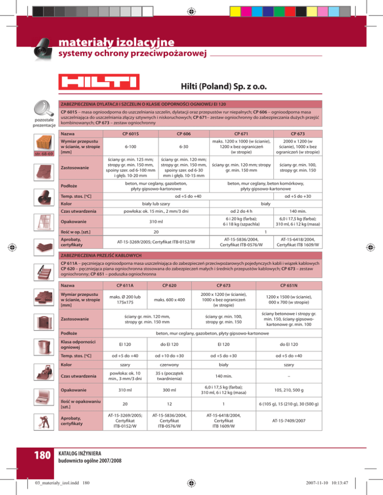 materiały izolacyjne systemy ochrony przeciwpożarowej Hilti (Poland) Sp. z o.o. ZABEZPIECZENIA DYLATACJI I SZCZELIN O KLASIE ODPORNOŚCI OGNIOWEJ EI 120 pozostałe prezentacje CP 601S – masa ognioodporna do uszczelniania szczelin, dylatacji oraz przepustów rur niepalnych; CP 606 – ognioodporna masa uszczelniająca do uszczelniania złączy sztywnych i niskoruchowych; CP 671– zestaw ogniochronny do zabezpieczania dużych przejść kombinowanych; CP 673 – zestaw ogniochronny Nazwa str. 68-69 CP 601S CP 606 CP 671 CP 673 6-100 6-30 maks. 1200 x 1000 (w ścianie), 1200 x bez ograniczeń (w stropie) 2000 x 1200 (w ścianie), 1000 x bez ograniczeń (w stropie) ściany gr. min. 125 mm; stropy gr. min. 150 mm, spoiny szer. od 6-100 mm i głęb. 10-20 mm ściany gr. min. 120 mm; stropy gr. min. 150 mm, spoiny szer. od 6-30 mm i głęb. 10-15 mm ściany gr. min. 120 mm; stropy gr. min. 150 mm ściany gr. min. 100, stropy gr. min. 150 Wymiar przepustu w ścianie, w stropie [mm] Zastosowanie beton, mur ceglany, gazobeton, płyty gipsowo-kartonowe Podłoże Temp. stos. [oC] beton, mur ceglany, beton komórkowy, płyty gipsowo-kartonowe od +5 do +40 Kolor od +5 do +30 biały lub szary Czas utwardzenia powłoka: ok. 15 min., 2 mm/3 dni od 2 do 4 h 140 min. 310 ml 6 i 20 kg (farba); 6 i 18 kg (szpachla) 6,0 i 17,5 kg (farba); 310 ml, 6 i 12 kg (masa) Opakowanie Ilość w op. [szt.] Aprobaty, certyfikaty biały 20 1 AT-15-3269/2005; Certyfikat ITB-0152/W AT-15-5836/2004, Certyfikat ITB-0576/W AT-15-6418/2004, Certyfikat ITB 1609/W ZABEZPIECZENIA PRZEJŚĆ KABLOWYCH CP 611A – pęczniejąca ognioodporna masa uszczelniająca do zabezpieczeń przeciwpożarowych pojedynczych kabli i wiązek kablowych CP 620 – pęczniejąca piana ogniochronna stosowana do zabezpieczeń małych i średnich przepustów kablowych; CP 673 – zestaw ogniochronny; CP 651 – poduszka ogniochronna Nazwa CP 611A Wymiar przepustu w ścianie, w stropie [mm] maks. Ø 200 lub 175x175 CP 673 CP 651N maks. 600 x 400 2000 x 1200 (w ścianie), 1000 x bez ograniczeń (w stropie) 1200 x 1500 (w ścianie), 000 x 700 (w stropie) ściany gr. min. 100, stropy gr. min. 150 ściany betonowe i stropy gr. min. 150, ściany gipsowokartonowe gr. min. 100 ściany gr. min. 120 mm, stropy gr. min. 150 mm Zastosowanie Podłoże beton, mur ceglany, gazobeton, płyty gipsowo-kartonowe Klasa odporności ogniowej o Temp. stos. [ C] Kolor Czas utwardzenia Opakowanie EI 120 do EI 120 EI 120 do EI 120 od +5 do +40 od +10 do +30 od +5 do +30 od +5 do +40 szary czerwony biały szary powłoka: ok. 10 min., 3 mm/3 dni 35 s (początek twardnienia) 140 min. – 310 ml 300 ml 6,0 i 17,5 kg (farba); 310 ml, 6 i 12 kg (masa) 105, 210, 500 g 20 12 1 6 (105 g), 15 (210 g), 30 (500 g) AT-15-3269/2005; Certyfikat ITB-0152/W AT-15-5836/2004, Certyfikat ITB-0576/W AT-15-6418/2004, Certyfikat ITB 1609/W AT-15-7409/2007 Ilość w opakowaniu [szt.] Aprobaty, certyfikaty 180 CP 620 KATALOG INŻYNIERA budownicto ogólne 2007/2008 03_materiały_izol.indd 180 2007-11-10 10:13:47