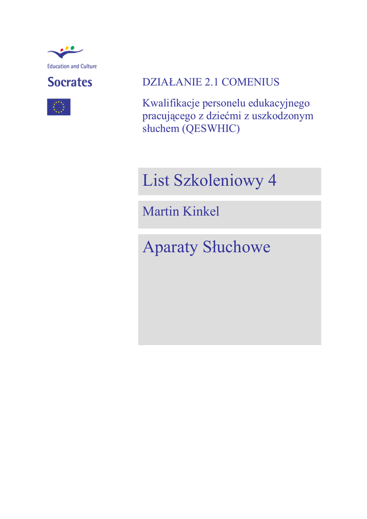 DZIAŁANIE 2.1 COMENIUS Kwalifikacje personelu edukacyjnego pracującego z dziećmi z uszkodzonym słuchem (QESWHIC) List Szkoleniowy 4 Martin Kinkel Aparaty Słuchowe Projekt QESWHIC – List 4 Aparaty słuchowe 2 Spis treści Wstęp.......................................................................................................................................... 3 Cel noszenia aparatów słuchowych........................................................................................ 3 Technologie aparatów słuchowych ............................................................................................ 6 Podstawowe ustawienia aparatów słuchowych...................................................................... 7 Sposoby przetwarzania sygnału ............................................................................................. 7 Podstawowe technologie .................................................................................................... 7 Regulacja wzmocnienia i dynamiki ................................................................................... 9 Regulacja charakterystyki częstotliwościowej................................................................. 10 Strategie poprawy współczynnika sygnału względem hałasu.......................................... 11 Dalsze metody .................................................................................................................. 13 Typy aparatów słuchowych.................................................................................................. 14 Podstawowe typy aparatów słuchowych.......................................................................... 14 Specjalne typy aparatów słuchowych .................................................................................. 16 Okularowe aparaty słuchowe ........................................................................................... 16 Droga dźwiękowa i wkładki uszne........................................................................................... 19 Akcesoria i urządzenia wspomagające słuchanie..................................................................... 20 Metody dopasowywania aparatów słuchowych....................................................................... 21 Podstawowe strategie ........................................................................................................... 21 Określanie celów .............................................................................................................. 21 Metody oparte na progach................................................................................................ 21 Metody nadprogowe......................................................................................................... 23 Dostrajanie ....................................................................................................................... 24 Ocena rezultatów.................................................................................................................. 25 Pomiar w uchu rzeczywistym .......................................................................................... 25 Ocena progu i skalowanie głośności ................................................................................ 26 Audiometria mowy dla kontroli aparatów słuchowych ................................................... 27 Ocena subiektywna .......................................................................................................... 28 Praktyczne procedury ustawiania aparatów słuchowych ..................................................... 28 Ustawianie aparatów słuchowych u dorosłych ................................................................ 28 Ustawianie aparatów słuchowych u dzieci....................................................................... 29 Wskazania audiologiczne i procedura organizacyjna ...................................................... 31 Streszczenie.............................................................................................................................. 32 Projekt QESWHIC – List 4 Aparaty słuchowe 3 Wstęp Dla większości chorych z uszkodzeniami słuchu aparaty słuchowe oznaczają odpowiedni sposób rekompensaty utraty słuchu, ponieważ nawet niewielki procent utraty słuchu, uszkadzający zdolności komunikacyjne, może być skutecznie poprawiany lub nawet leczony farmakologicznie lub operacyjnie. Niemniej jednak jedynie mała część wszystkich chorych z uszkodzeniami słuchu którzy mogą skorzystać z aparatów słuchowych ma je rzeczywiście dopasowane. W związku z tym wiele osób cierpi z powodu niemożności komunikacji, która mogłaby być lepsza dzięki odpowiednim aparatom słuchowym. Dotyczy to zwłaszcza urządzeń dwustronnych. Rozważając znaczenie słyszenia obuusznego dla słyszenia przestrzennego i zrozumiałości mowy w hałaśliwych sytuacjach, wydaje się oczywiste, że przy obustronnej utracie słuchu powinny być zastosowane obustronne aparaty słuchowe. Jednak chociaż większość chorych z uszkodzeniami słuchu cierpi z powodu zwykle symetrycznej, bilateralnej utraty słuchu, w większości krajów jedynie mniejszość pacjentów korzysta z urządzeń bilateralnych. Oznacza to, że generalnie znaczna część osób z uszkodzeniami słuchu nie odnosi optymalnych korzyści. Cel noszenia aparatów słuchowych Cel noszenia aparatów słuchowych nie może być dobrze sformułowany ze względu na różne rodzaje uszkodzeń słuchu z jednej, a różne indywidualne potrzeby i oczekiwania odnośnie słyszenia z drugiej strony. Poza tym, najlepsze możliwe odtworzenie możliwości komunikacyjnych chorego z uszkodzonym słuchem może być z pewnością uznane za główny cel. Aby zrekompensować wszystkie patologiczne aspekty uszkodzenia słuchu, aparaty słuchowe powinny być w stanie przetwarzać sygnały w taki spo