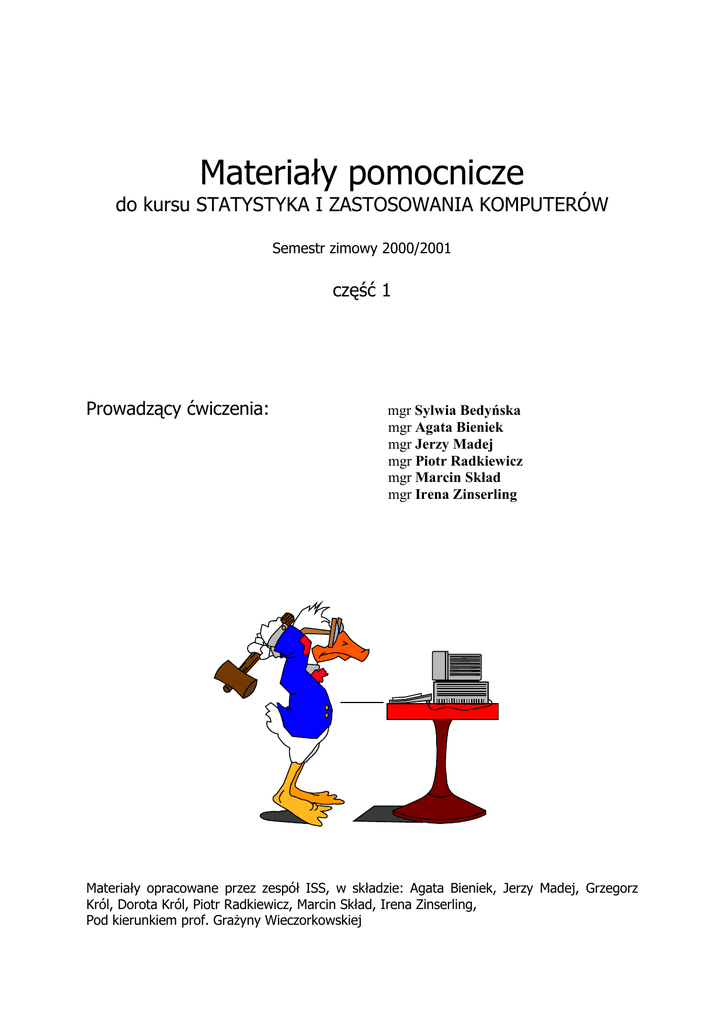 Materiały pomocnicze do kursu STATYSTYKA I ZASTOSOWANIA KOMPUTERÓW Semestr zimowy 2000/2001 część 1 Prowadzący ćwiczenia: mgr Sylwia Bedyńska mgr Agata Bieniek mgr Jerzy Madej mgr Piotr Radkiewicz mgr Marcin Skład mgr Irena Zinserling Materiały opracowane przez zespół ISS, w składzie: Agata Bieniek, Jerzy Madej, Grzegorz Król, Dorota Król, Piotr Radkiewicz, Marcin Skład, Irena Zinserling, Pod kierunkiem prof. Grażyny Wieczorkowskiej 1 Materiały do kursu STATYSTYKA I ZASTOSOWANIA KOMPUTERÓW - semestr zimowy 2000/2001. PAKIET STATYSTYCZNY SPSS Analiza statystyczna danych eksperymentalnych czy też sondażowych jest sztuką, której będziemy się uczyć w tym semestrze. W dzisiejszych czasach jest to dużo łatwiejsze niż kiedyś, ponieważ dysponujemy komputerami wyposażonymi w dobry pakiet statystyczny. Najpopularniejszym w świecie pakietem statystycznym, stosowanym w badaniach marketingowych, społecznych i ekonomicznych, jest SPSS, program charakteryzujący się wszechstronnością i łatwością użytkowania. Jest to rozbudowany system analizy danych zdolny do współpracy z wieloma rodzajami danych i potrafiący korzystać z różnych formatów plików arkuszy kalkulacyjnych i baz danych. Jest on wyposażony w procedury generujące zarówno proste statystyki opisowe jak i złożone analizy statystyczne. Jego niekwestionowaną zaletą są bogate i urozmaicone możliwości prezentacji danych (tabele, tabelaryczne raporty, wykresy, rozkłady, trendy). SPSS posiada okienkowy interfejs i możliwości uruchamiania większości procedur przez kliknięcie myszką na odpowiednią pozycję menu. Z łatwością współpracuje także przy pomocy OLE z innymi aplikacjami1, co bardzo często ułatwia przygotowywanie raportów. ”Okienkowa” forma programu jest swego rodzaju nadbudówką nad językiem poleceń SPSS. Na język ten składają się procedury statystycznej analizy danych oraz procedury służące do obróbki, transformacji i selekcji danych. Polecenia mogą być bezpośrednio wykonywane w okienkach, przenoszone do specjalnego okienka i dopiero tam wykonywane, lub wpisywane z klawiatury i dopiero wykonywane. Daje to potencjalną możliwość budowania z poszczególnych poleceń całych programów transformacji i analizy danych, które można następnie wielokrotnie wykonywać i modyfikować, korzystając z funkcji edytorskich. SPSS jest pakietem składającym się z podstawowego modułu Base (obróbka, transformacje, selekcja i graficzna prezentacja danych, statystyki opisowe i proste analizy statystyczne) oraz z dodatkowych modułów, nabywanych opcjonalnie i wykorzystywanych według zindywidualizowanych potrzeb. Wyłącznym dystrybutorem pakietu SPSS na Polskę jest krakowska firma COMPANION, która prowadzi również szkolenia w zakresie obsługi i analiz z wykorzystaniem tego pakietu. 1 Znanym nam wyjątkiem jest MS Word 7.0/8.0, który nie przyjmuje obiektów graficznych SPSS. 2 Materiały do kursu STATYSTYKA I ZASTOSOWANIA KOMPUTERÓW - semestr zimowy 2000/2001. ŚCIĄGAWKA Z SPSS OKNA SPSS: Po uruchomieniu programu widoczne są 2 lub 3 okna: Edytor Raportów - okienko z wynikami analiz [ albo *.SPO] Edytor Danych - okienko z tabelą danych [ albo *.SAV] i czasami: Edytor Poleceń - okienko komend [ albo *.SPS] Jeśli nie ma okienka Edytor Poleceń, należy je uruchomić przez menu: Plik > Nowy > Polecenia Między okienkami można przechodzić przez menu: Okno - należy wybrać 1, 2 lub 3. ---------------------------------------------------------------------------------------------------------------------------------------- OPIS MENU: (każde wcięcie oznacza wejście głębiej w menu) PLIK NOWY DANE POLECENIA RAPORT OTWÓRZ dane okienko komend (stare nie jest kasowane, nowe ma numer np.2) okienko wyników (stare nie jest kasowane, nowe ma numer np.2) otwórz zbiór zapisany na dysku. W zależności od tego, czy chcemy otworzyć zbiór danych, polecenia, czy raport, należy w dolnym pasku pojawiającego się okienka wybrać odpowiednie rozszerzenie pliku oraz podać lokalizację (w dużym górnym oknie). CZYTAJ DANE W ASCII – tu wczytujemy dane zapisane np. w pliku tekstowym Z SEPARATORAMI PÓL DANYCH – gdy wpisane zmienne są rozdzielone (np. spacjami) O ZADANEJ SZEROKOŚCI KOLUMN – gdy sami opisujemy w jakich kolumnach mieszczą się kolejne zmienne ZAPISZ zapisz pod bieżącą nazwą ZAPISZ JAKO... zapisz pod nową nazwą i lokalizacją DRUKUJ wydrukuj okienko które jest na wierzchu ZATRZYMAJ OBLICZENIA zatrzymaj analizy w toku (np. jeśli się pomyliłe(a)ś) ZAKOŃCZ koniec pracy z SPSS EDYCJA edycja, jak w każdym edytorze (trochę się różni zależnie od okna) COFNIJ cofnij to co przed chwilą zrobiłeś WYTNIJ wytnij do pamięci KOPIUJ skopiuj do pamięci WKLEJ wstaw z pamięci USUŃ usuń zaznaczony fragment ZNAJDŹ znajdź np. określone słowo, liczbę itp. ZAZNACZ WSZYSTKO zaznacz wszystko co się znajduje w otwartym oknie/dokumencie SZUKAJ szukaj, znajdź ZAMIEŃ szukaj i zamień OPCJE ustawianie preferencji użytkownika DANE dane, operacje na zbiorze danych DEFINIUJ ZMIENNĄ definiowanie zmiennych (etykiety, wartości, braki danych) WSTAW ZMIENNĄ wstaw zmienną (nową kolumnę) w środek, przed kursorem WSTAW OBSERWACJĘ – gdy chcemy dodać kolejną osobę (linijkę) do danych SORTUJ OBSERWACJE sortuj dane według podanego kryterium TRANSPONUJ transpozycja, czyli zamiana rzędów na kolumny i na odwrót POŁĄCZ DANE połącz zbiory, dodając przypadki lub zmienne AGREGUJ agregowanie danych PODZIEL NA PODZBIORY podziel plik na podgrupy (np. do zrobienia korelacji w grupach) WYBIERZ OBSERWACJE wybierz przypadki z całego zbioru PRZEKSZTAŁCENIA przekształcenia danych OBLICZ WARTOŚCI oblicz, utwórz nową zmienną, zmień istniejącą ZLICZ WYSTĄPIENIA zlicz ile razy wystąpiła dana wartość (np. ile razy OB. zaznaczyła 7 na skali) 3 Materiały do kursu STATYSTYKA I ZASTOSOWANIA KOMPUTERÓW - semestr zimowy 2000/2001. REKODUJ p