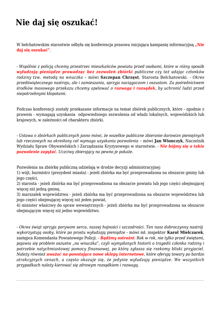 Nie daj się oszukać! W bełchatowskim starostwie odbyła się konferencja prasowa inicjująca kampanię informacyjną „Nie daj się oszukać”. - Wspólnie z policją chcemy przestrzec mieszkańców powiatu przed osobami, które w różny sposób wyłudzają pieniądze prowadząc bez zezwoleń zbiórki publiczne czy też udając członków rodziny tzw. metodą na wnuczka – mówi Szczepan Chrzęst, Starosta Bełchatowski. - Okres przedświątecznego nastroju, ale i zamieszania, sprzyja naciągaczom i oszustom. Za pośrednictwem środków masowego przekazu chcemy apelować o rozwagę i rozsądek, by uchronić ludzi przed niepotrzebnymi kłopotami. Podczas konferencji zostały przekazane informacje na temat zbiórek publicznych, które - zgodnie z prawem - wymagają uzyskania odpowiedniego zezwolenia od władz lokalnych, wojewódzkich lub krajowych, w zależności od charakteru zbiórki. - Ustawa o zbiórkach publicznych jasno mówi, że wszelkie publiczne zbieranie darowizn pieniężnych lub rzeczowych na określony cel wymaga uzyskania pozwolenia – mówi Jan Wionczyk, Naczelnik Wydziału Spraw Obywatelskich i Zarządzania Kryzysowego w starostwie. - Nie bójmy się o takie pozwolenie zapytać. Uczciwy zbierający na pewno je pokaże. Pozwolenia na zbiórkę publiczną udzielają w drodze decyzji administracyjnej: 1) wójt, burmistrz (prezydent miasta) - jeżeli zbiórka ma być przeprowadzona na obszarze gminy lub jego części, 2) starosta - jeżeli zbiórka ma być przeprowadzona na obszarze powiatu lub jego części obejmującej więcej niż jedną gminę, 3) marszałek województwa - jeżeli zbiórka ma być przeprowadzona na obszarze województwa lub jego części obejmującej więcej niż jeden powiat, 4) minister właściwy do spraw wewnętrznych - jeżeli zbiórka ma być przeprowadzona na obszarze obejmującym więcej niż jedno województwo. - Okres świąt sprzyja porywom serca, naszej hojności i szczodrości. Ten nasz dobroczynny nastrój wykorzystują osoby, które po prostu wyłudzają pieniądze - mówi mł. inspektor Karol Mielczarek, zastępca Komendanta Powiatowego Policji. - Bądźmy ostrożni. Rok w rok, nie tylko przed świętami, pojawia się problem oszustw „na wnuczka”, czyli wymyślanych historii o tragedii członka rodziny i potrzebie natychmiastowej pomocy finansowej, po którą zgłasza się rzekomy bliski przyjaciel. Należy również uważać na powstające nowe sklepy internetowe, które oferują towary po bardzo atrakcyjnych cenach, a często okazuje się, że jedynie wyłudzają pieniądze. We wszystkich przypadkach należy kierować się zdrowym rozsądkiem i rozwagą. Krzysztof Borowski Rzecznik prasowy Starostwo Powiatowe w Bełchatowie