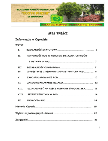 SPIS TREŚCI Informacja o Ogrodzie WSTĘP I. DZIALANOŚĆ STATUTOWA…………………………………………......…………… 3 II. AKTYWNOŚĆ ROD W OBRONIE ZWIĄZKU, OGRODÓW I USTAWY O ROD………………………………………………………….……….……….. 7 III. DZIAŁALNOŚĆ OŚWIATOWA…………………………………………………………. 7 IV. INWESTYCJE I REMONTY INFRASTRUKTURY ROD………….…… 8 V. ZAGOSPODAROWANIE ROD……………………………………………………….…… 10 VI. ZAGOSPODAROWANIE DZIAŁEK……………………………………….…..….. 12 VII. DZIAŁALNOŚĆ NA RZECZ OCHRONY ŚRODOWISKA……..…… 13 VIII. BEZPIECZEŃSTWO W ROD…………………………………………………….….…. 14 IX. PROMOCJA ROD……………………………………………………………………….….……. 14 Historia Ogrodu………………………………………………………..…………………….…… 15 Wykaz najładniejszych działek ……………………………..………………..…... 22 Załączniki……………………………………………………………………….…………………….…. 23 2 Informacja o Ogrodzie. WSTĘP Rodzinny Ogród Działkowy „Złote Piaski” w Siedlcach położony jest pomiędzy ulicami Piaskowa i Przymiarki. Ogród powstał z połączenia trzech ROD „Relax”, „Zdrowie” i „Złote Piaski”. Ze względu na to że ROD „Złote Piaski” posiadał powierzchnię równą pozostałym dwóm ogrodom Nadzwyczajna Konferencja odbyta w dniu 6 grudnia 2013 roku przyjęła nazwę Ogrodu „Złote Piaski”. Przesłanką decydującą o konieczności połączenia ogrodów był fakt, że ogrody te korzystały ze wspólnej sieci wodociągowej i energetycznej, posiadały wspólny system dróg wewnątrzogrodowych. Ogród „Zdrowie” swego czasu odłączył się od ówczesnego 3 POD „Złote Piaski”, stąd też ta wspólna infrastruktura. Ponadto ogrody te położone były na dwóch wspólnych działkach geodezyjnych, co w świetle wchodzącej w życie nowej ustawy o rod mogło doprowadzić w przyszłości do niezgodności prawnych. Rodzinny Ogród Działkowy „Relax” powstał w 1978 roku i posiadał 199 działek, natomiast ROD „Zdrowie” posiada 390 działek. Obecnie Rodzinny Ogród Działkowy „Złote Piaski” posiada powierzchnię 49,0497ha, w tym powierzchnia użytkowa 40,5405 ha, na której wytyczono 1271 działek o średniej powierzchni 300 m2. Łączna ilość członków PZD wynosi 1609 osób. Zarząd Rodzinnego Ogrodu Działkowego „Złote Piaski” w 2013 roku po rezygnacji z pracy Prezesa ogrodu i dużej części Zarządu, aż od Nadzwyczajnej Konferencji w połączeniowej czteroosobowym odbytej składzie w Zarządu dniu 6 grudnia Komisarycznego 2013 roku powołanego działał uchwałą Prezydium Okręgowego Zarządu Mazowieckiego Nr 48/2013 z dnia 29 kwietnia 2013r. Zarząd Komisaryczny zrealizował przygotowane i zatwierdzone na Walnym 4 Zebraniu przedsięwzięcia w tym zadania inwestycyjno-remontowe o wartości ponad 30 000 złotych. Zarząd Komisaryczny nie poprzestał tylko na działaniach umożliwiających przetrwanie do walnego zebrania, ale podejmował trudne zadania w wyniku, których pozyskano środki zewnętrzne w wysokości 22 800 złotych. I. DZIALANOŚĆ STATUTOWA W 2013 roku w ROD „Złote Piaski” odbyły się dwa Walne Zebrania Sprawozdawcze i Nadzwyczajna Konferencja Delegatów. Podyktowane to było połączeniem się trzech ogrodów działkowych „Relax”, „Zdrowie” i „Złote Piaski”. Dokumentacja Walnych zebrań sporządzana jest elektronicznie, a dokumenty w wersji papierowej zszyte w trzy oddzielne broszury. Protokoły z zebrań Zarządu sporządzane są w książce protokołów, natomiast uchwały Zarządu rejestrowane są w Rejestrze uchwał. Uchwały Zarządu spięte są w oddzielny skoroszyt, a uchwały dotyczące działkowców umieszczane są w teczkach poszczególnych działek. Nie zanotowano odwołań od uchwał Zarządu, co świadczy, że były one podejmowane zgodnie z przepisami prawa. Zebrania zarządu prowadzi Prezes. Zebrania odbywają się w Biurze Ogrodu w Domu Działkowca Złote Piaski. W 2013 roku przyjęto 38 nowych użytkowników działek. Terminowo odprowadzono do OZM wpisowe w wysokości 6 080,00 złotych, działkowcy otrzymują miesięcznik „działkowiec”. Plan zagospodarowania ROD po połączeniu ogrodów został przekazany do OZM celem zatwierdzenia. Odpowiednią uchwałę podjęto na Nadzwyczajnej Konferencji połączeniowej. 5 W ogrodzie znajduje się 9 bram wjazdowych wraz z furtkami. Wszystkie są sprawne, a trzy z nich zostały zmodernizowane, są to bramy ocynkowane i przesuwane. Rejestr członków Związku prowadzony jest elektronicznie i w formie papierowej. Deklaracje członkowskie i decyzje przydziału działek przechowywane są w oddzielnych teczkach dla poszczególnych działek. Rejestry i dokumentacja członków przechowywana jest w metalowych szafach kartotekowych zamykanych na klucz. Dostęp do danych osobowych mają tylko: Wiceprezes, Sekretarz i Księgowa Ogrodu. Osoby te zostały przeszkolone z ustawy o ochronie danych osobowych i podpisały odpowiednie oświadczenia. W ogrodzie działają cztery komisje problemowe: polityki społecznej, ds. przeglądu działek, energetyczna i bezpieczeństwa. Komisja polityki społecznej jak co roku przygotowała Święto Działkowców, komisja ds. przeglądu działek przeprowadziła przegląd działek pod względem najlepiej zagospodarowanych oraz zaniedbanych. Do działkowców, którzy niezgodnie z regulaminem uprawiali działki wysłano upomnienia. Komisja energetyczna weryfikowała podawane przez działkowców zużycie energii elektrycznej w altanach oraz zabezpieczenie liczników i bezpieczników. Dokumentacja komisji problemowych przechowywana jest w Biurze Zarządu. Zgodnie z 