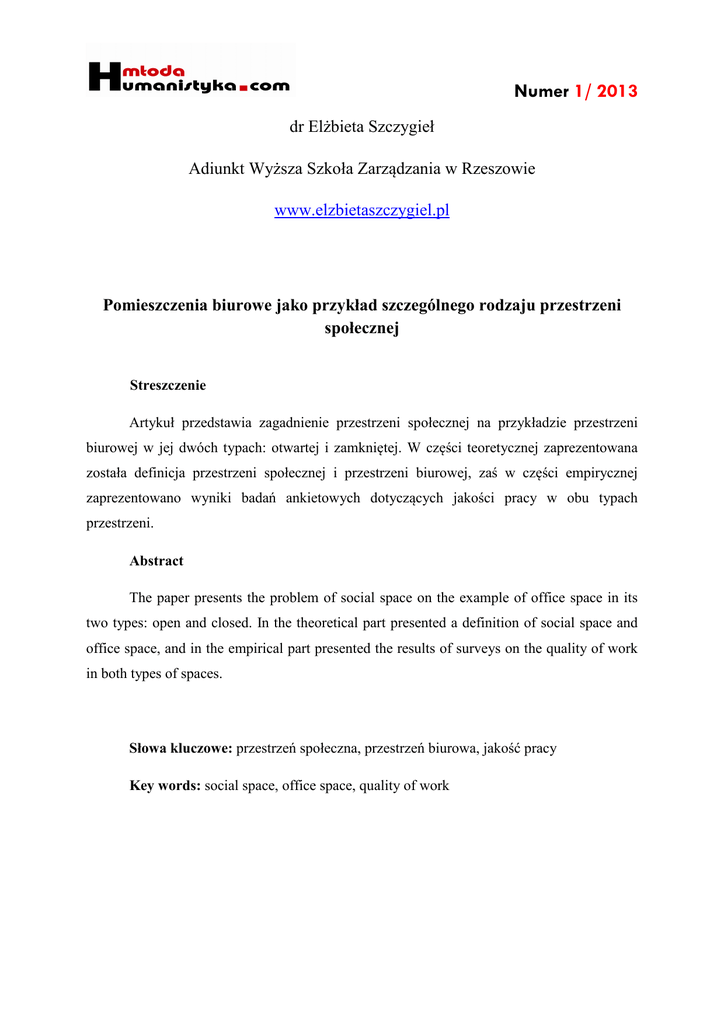 Numer 1/ 2013 dr Elżbieta Szczygieł Adiunkt Wyższa Szkoła Zarządzania w Rzeszowie www.elzbietaszczygiel.pl Pomieszczenia biurowe jako przykład szczególnego rodzaju przestrzeni społecznej Streszczenie Artykuł przedstawia zagadnienie przestrzeni społecznej na przykładzie przestrzeni biurowej w jej dwóch typach: otwartej i zamkniętej. W części teoretycznej zaprezentowana została definicja przestrzeni społecznej i przestrzeni biurowej, zaś w części empirycznej zaprezentowano wyniki badań ankietowych dotyczących jakości pracy w obu typach przestrzeni. Abstract The paper presents the problem of social space on the example of office space in its two types: open and closed. In the theoretical part presented a definition of social space and office space, and in the empirical part presented the results of surveys on the quality of work in both types of spaces. Słowa kluczowe: przestrzeń społeczna, przestrzeń biurowa, jakość pracy Key words: social space, office space, quality of work Pomieszczenia biurowe jako przykład szczególnego rodzaju przestrzeni społecznej Wstęp Pomieszczenia biurowe, jakie są użytkowane przez pracowników, stanowią specyficzny rodzaj przestrzeni społecznej. Zachodzące na ich terenie interakcje między pracownikami wpływają nie tylko na realizację lub zaniechanie celów zawodowych, ale także na kształtowanie się specyficznych więzi społecznych. Na powstanie określonego układu, porządku społecznego w miejscu pracy wpływ ma przede wszystkim kontakt z pozostałymi współpracownikami. W tym procesie kluczową rolę odgrywa odpowiednia architektura przestrzeni biurowej. W niniejszej pracy zostanie przedstawiona ogólna charakterystyka przestrzeni biurowej wraz z jej typami w kontekście społecznym oraz zostaną zaprezentowane wyniki badań dotyczących jakości pracy w dwóch typach przestrzeni biurowej: otwartej i zamkniętej. 1. Pojęcie przestrzeni społecznej Przestrzeń społeczna jest szczególnego rodzaju wytworem społecznym, który nie odnosi się do konkretnego miejsca, ale oznacza pewien układ cech społecznych lub też wymiar rzeczywistości międzyludzkiej (Jałowiecki, Szczepański 2006: 314-316). Pojęcie to odnoszone jest do obszaru (terytorium), na którym zamieszkują lub przebywają ludzie o określonych cechach. Spójność i podobieństwo wyróżników, które charakteryzują daną grupę ludzi świadczy o istnieniu grupy społecznej1. Charakter, jaki posiada przestrzeń społeczna, jest uzależniony od zamierzeń, jakimi kierowała się dana grupa społeczna przy jej tworzeniu. Warto podkreślić, że przestrzeń ta jest wytworem ludzkim, nie zaś naturalnym (Tamże: 316). Powoduje to, że jej kształt oraz wartości, jakie dana grupa społeczna przywiązuje do niej, zależą przede wszystkim od czynników społecznych i kulturowych. Świadomie podjęte, specyficzne działanie ludzkie, jakie skutkuje powstaniem przestrzeni społecznej, określa też wartości w tej przestrzeni, zarówno materialne, jak i niematerialne (Tamże: 317-318). Pierwsze z nich mają wydźwięk ekonomiczny i użytkowy, powodując, że grupa społeczna postrzegać może przestrzeń w kategoriach finansowych lub technicznych. Drugi typ wartości, związany jest z kategoriami kulturowymi, opartymi na przypisywaniu tejże przestrzeni pewnych cech symbolicznych przez członków grupy społecznej. Postrzeganie wartości, 1 Mianem „grupy społecznej” określa się zbiór jednostek, w którym wspólnota pewnych istotnych społecznie cech wyraża się w tożsamości zbiorowej i towarzyszą temu kontakty, interakcje i stosunki społeczne w jej obrębie częstsze i bardziej intensywne niż z osobami z zewnątrz. Inaczej jest to zbiorowość ludzi pomiędzy którymi występuje więź obiektywna, subiektywna i behawioralna (Sztompka 2002: 196). 2 Pomieszczenia biurowe jako przykład szczególnego rodzaju przestrzeni społecznej szczególnie kiedy dotyczą one kategorii niewymiernych, może być odmienne dla każdego z członków danej grupy społecznej. 2. Pomieszczenie biurowe jako przestrzeń społeczna Jednym ze szczególnych przykładów przestrzeni społecznej są pomieszczenia biurowe. Przestrzeń ta, obok pomieszczeń mieszkalnych, stanowi kluczowy obszar przebywania i kształtowania się różnorodnych więzi społecznych wśród osób dorosłych. Powoduje to, iż biura stają się specyficznym miejscem, w którym dochodzi do powstawania grup społecznych, a w konsekwencji - przestrzeni społecznej. Kluczowym elementem powodującym powstawanie zarówno grupy, jak i przestrzeni społecznej, są określone wartości wspólne dla wszystkich członków grupy oraz funkcje, jakie grupa ta spełnia względem innych (grup społecznych lub systemów) wraz ze skutkami i rezultatami jej działania (Turowski 2001: 83-84). Internalizacja celów i dążeń grupy przez poszczególnych jej członków powoduje wytworzenie się więzi społecznej miedzy nimi2. W kontekście pracy zawodowej, trzonem więzi będą cele danej organizacji (np. przedsiębiorstwa). Cele te, jak i sposób ich realizacji, warunkuje w dużej mierze typ przestrzeni biurowej, jaką mają do dyspozycji pracownicy. Wyróżnikami obu typów przestrzeni są czynniki o charakterze społecznym oraz fizycznym. Do tych pierwszych zaliczyć można przede wszystkim liczbę stosunków interpersonalnych, jakie kształtują się w grupie oraz częstotliwość i poziom komunikacji. W drugiej grupie znajdują się czynniki takie jak: oświetlenie, poziom hałasu, jakość powietrza oraz kolorystyka miejsca pracy (Libal 1976: 295). Tradycyjnie pojmowana przestrzeń biurowa to osobne pokoje dla każdego z pracowników, względnie wspólne pomieszczenie dla 2 lub 3 zatrudnionych3. Liczba interakcji bezpośrednich, jakie zachodzą miedzy pracownikami jest więc ograniczona. W małych grupach częstotliwość komunikacji i jej poziom są większe i przekładają się na wzrost lojalności i zaang