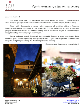 Oferta weselna- pakiet bursztynowy Szanowni Państwo! Niezwykle nam miło, że poszukując idealnego miejsca na jeden z najważniejszych dni w waszym życiu, jakim jest ślub i wesele, zdecydowali się Państwo sięgnąć po naszą ofertę. Nasz Hotel i Restauracja to jedyne i niepowtarzalne tak urokliwe miejsce w Toruniu, łączące współczesność oprawioną w czar przeszłości. Stylowo zachowany wystrój wnętrz oraz przepiękne otoczenie nadają mu niepowtarzalny klimat, sprawiając, iż jest to idealne miejsce na spędzenie tego najważniejszego dnia w życiu. Oferta kulinarna naszej Restauracji jest niezwykle bogata, a nasze wyśmienite dania zadowolą gusta nawet najbardziej wymagających gości. Wychodząc naprzeciw oczekiwaniom naszych Gości przygotowaliśmy dla Państwa tą oto ofertę weselną. Zapraszamy do skorzystania z naszej oferty! Hotel i Restauracja 1231 Ul. Przedzamcze 6 87-100 Toruń www.hotel1231.pl [email protected] tel. (56) 619 09 16 Oferta weselna- pakiet bursztynowy MENU Powitanie pary młodej chlebem i solą ***** Aperitiff / Toast lampką wina musującego Przekąska serwowana indywidualnie (jedna do wyboru) „Łosoś na dwa sposoby” Atlantycki Łosoś podany w formie tatara i marynowany z podwędzanymi kalifornijskimi śliwkami, w kompozycji bukietu kolorowych sałat, aromatycznej cytryny i lekkiego sosu z francuskiej musztardy Pommery lub Sałatka „La Caprese” Pomidory przekładane płatkami Mozzarelli, doprawione aromatyczną emulsją bazyliową, podane w kompozycji z bukietem sałat i włoską szynka Parmeńską Zupa serwowana indywidualnie (jedna do wyboru) Chłodnik z naturalnego jogurtu i listków botwinki, doprawiony ogórkiem, aromatem ogrodowego koperku i szczypiorku, podany z jajkiem lub Aromatyczny rosół z wiejskiej kury, z makaronem, kawałeczkami kurczaka i kolorowymi warzywami. lub Kremowa zupa kalafiorowo – szparagowa doprawiona truflami, podana z pulpecikami orzechowymi Hotel i Restauracja 1231 Ul. Przedzamcze 6 87-100 Toruń www.hotel1231.pl [email protected] tel. (56) 619 09 16 Oferta weselna- pakiet bursztynowy Dania główne - mięsne i rybne podane na stoły (trzy do wyboru) “Saltinbocca” Włoskie kotleciki ze schabu smażone z Salami, podane w sosie z papryki ***** Eskalopki z piersi kurczaka smażone w jajku i tartym Parmezanie ***** Opiekane roladki z polędwiczek wieprzowych nadziewane szpinakiem, papryka i Fetą, podane na aromatycznym sosie pomidorowym ***** Fileciki Okonia Wiktoriańskiego smażone na maśle, w panierce z włoskich orzechów ***** Soczysta pieczeń z karkówki marynowanej z czosnkiem, jałowcem i ogrodowym rozmarynem, podana z własnym sosem ***** Kotleciki schabowe doprawione smażoną cebulką z pieczarkami Hotel i Restauracja 1231 Ul. Przedzamcze 6 87-100 Toruń www.hotel1231.pl [email protected] tel. (56) 619 09 16 Oferta weselna- pakiet bursztynowy Dodatki podane na stoły (Trzy do wyboru) Gotowane ziemniaki doprawione świeżym masłem i koperkiem ***** Mus ziemniaczany doprawiony suszonymi pomidorami i zapieczony pod płaszczykiem Parmezanu ***** Frytki i ziemniaki opiekane ***** Asortyment gotowanych warzyw, doprawione maślano – cytrynową emulsją ***** Staropolska kapusta zasmażana z pomidorami ***** Gotowane różyczki kalafiora i fasolka szparagowa doprawione złocistą bułeczką Deser serwowany indywidualnie (jeden do wyboru) Puchar lodów “Amorek” Lody czekoladowe, waniliowe i truskawkowe podane ze świeżymi owocami, bitą śmietaną, wiórkami czekolady. Doprawione sosem z mlecznej czekolady lub Sałatka ze świeżych owoców z listkami afrodyzjakalnej mięty pieprzowej i sosem truskawkowym, podana z gałką sorbetu malinowego lub Karmelizowany Krem Brulee doprawiony kroplą Martella w trzech odsłonach: z leśnymi jagodami, ogrodowymi truskawkami i Toruńskim piernikiem ***** Kawa / herbata Hotel i Restauracja 1231 Ul. Przedzamcze 6 87-100 Toruń www.hotel1231.pl [email protected] tel. (56) 619 09 16 Oferta weselna- pakiet bursztynowy Przekąski i sałatki podane na stoły „Gravad lax” z łososia marynowanego w czarnym pieprzu i Soli Mroskiej, podany z cząstkami cytryny i kremowym chrzanem ***** Staropolska sałatka z pieczonej szynki, papryki, kukurydzy i żółtego sera doprawiona aromatem świeżego ogórka i sosem majonezowym ***** Pieczone mięsa: karkówka, schab nadziewany śliwkami, indyk, pasztety, faszerowane polędwiczki wieprzowe ***** Sałatka z grillowanych polędwiczek kurczaka i pieczonych warzyw doprawiona karczochami, kremem balsamicznym i kawałkami koziego sera ***** Filety śledziowe Matyjas przyrządzone na dwa sposoby ***** Szparagi zawijane w plaster wędzonej szynki ***** Sałatka z pomidorów i aromatycznego ogórka doprawiona zielonym selerem, świeżo siekaną szalotką i Modenską oliwą ***** Chrupiące bułeczki, masło Hotel i Restauracja 1231 Ul. Przedzamcze 6 87-100 Toruń www.hotel1231.pl [email protected] tel. (56) 619 09 16 Oferta weselna- pakiet bursztynowy Desery i owoce ustawione na bufecie Piramida świeżych owoców ***** Szarlotka pieczona w otoczce aromatu cynamonu ***** Sałatka ze świeżych owoców ***** Ciastko “Ambasador” na czekoladowym cieście ***** Ciasto porzeczkowo - jogurtowe ***** “Cherry” ciasto z marynowanymi wiśniami Dania gorące serwowane indywidualnie (godzina do ustalenia) Staropolska zupa gulaszowa doprawiona owocem dzikiego jałowca i sokiem z kwaszonych ogórków Tort weselny do pokrojenia przez Młodą Parę zarówno godzina podania jak i wielkość, smak, forma są do indywidualnego ustalenia, a jego koszt będzie dodany do wartości wesela w kwocie. Przedział cenowy tortów weselnych to od 150 zł do 1100 zł ***** kawa / herbata Hotel i Restauracja 1231 Ul. Przedzamcze 6 87-100 Toruń www.hotel1231.pl [email protected] tel. (56) 619 09 16 Oferta weselna- pakiet bursztynowy Danie gorące serwowane indywidualnie po północy (godzina do ustalenia) Aromatyczny barszcz czerwony podany z cie