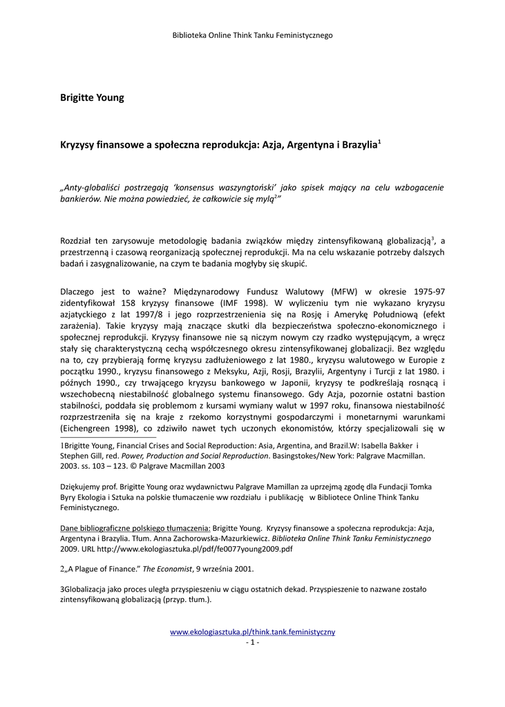 Biblioteka Online Think Tanku Feministycznego Brigitte Young Kryzysy finansowe a społeczna reprodukcja: Azja, Argentyna i Brazylia1 „Anty-globaliści postrzegają ‘konsensus waszyngtoński’ jako spisek mający na celu wzbogacenie bankierów. Nie można powiedzieć, że całkowicie się mylą2” Rozdział ten zarysowuje metodologię badania związków między zintensyfikowaną globalizacją 3, a przestrzenną i czasową reorganizacją społecznej reprodukcji. Ma na celu wskazanie potrzeby dalszych badań i zasygnalizowanie, na czym te badania mogłyby się skupić. Dlaczego jest to ważne? Międzynarodowy Fundusz Walutowy (MFW) w okresie 1975-97 zidentyfikował 158 kryzysy finansowe (IMF 1998). W wyliczeniu tym nie wykazano kryzysu azjatyckiego z lat 1997/8 i jego rozprzestrzenienia się na Rosję i Amerykę Południową (efekt zarażenia). Takie kryzysy mają znaczące skutki dla bezpieczeństwa społeczno-ekonomicznego i społecznej reprodukcji. Kryzysy finansowe nie są niczym nowym czy rzadko występującym, a wręcz stały się charakterystyczną cechą współczesnego okresu zintensyfikowanej globalizacji. Bez względu na to, czy przybierają formę kryzysu zadłużeniowego z lat 1980., kryzysu walutowego w Europie z początku 1990., kryzysu finansowego z Meksyku, Azji, Rosji, Brazylii, Argentyny i Turcji z lat 1980. i późnych 1990., czy trwającego kryzysu bankowego w Japonii, kryzysy te podkreślają rosnącą i wszechobecną niestabilność globalnego systemu finansowego. Gdy Azja, pozornie ostatni bastion stabilności, poddała się problemom z kursami wymiany walut w 1997 roku, finansowa niestabilność rozprzestrzeniła się na kraje z rzekomo korzystnymi gospodarczymi i monetarnymi warunkami (Eichengreen 1998), co zdziwiło nawet tych uczonych ekonomistów, którzy specjalizowali się w 1Brigitte Young, Financial Crises and Social Reproduction: Asia, Argentina, and Brazil.W: Isabella Bakker i Stephen Gill, red. Power, Production and Social Reproduction. Basingstokes/New York: Palgrave Macmillan. 2003. ss. 103 – 123. © Palgrave Macmillan 2003 Dziękujemy prof. Brigitte Young oraz wydawnictwu Palgrave Mamillan za uprzejmą zgodę dla Fundacji Tomka Byry Ekologia i Sztuka na polskie tłumaczenie ww rozdziału i publikację w Bibliotece Online Think Tanku Feministycznego. Dane bibliograficzne polskiego tłumaczenia: Brigitte Young. Kryzysy finansowe a społeczna reprodukcja: Azja, Argentyna i Brazylia. Tłum. Anna Zachorowska-Mazurkiewicz. Biblioteka Online Think Tanku Feministycznego 2009. URL http://www.ekologiasztuka.pl/pdf/fe0077young2009.pdf 2„A Plague of Finance.” The Economist, 9 września 2001. 3Globalizacja jako proces uległa przyspieszeniu w ciągu ostatnich dekad. Przyspieszenie to nazwane zostało zintensyfikowaną globalizacją (przyp. tłum.). www.ekologiasztuka.pl/think.tank.feministyczny -1- Biblioteka Online Think Tanku Feministycznego „cudzie azjatyckim”. Jak ujął to David McNally, uczeni ci wierzyli, że „otwarte rynki i swobodnie przepływający kapitał będą zbawianiem dla ludzkości” (McNally 1998:1). Biorąc pod uwagę powyższe kwestie, w rozdziale tym analizuję zmiany w strukturze władzy, produkcji i reprodukcji we wschodniej Azji i Ameryce Łacińskiej. Skutki kryzysów finansowych mają zróżnicowany wpływ na różne grupy społeczne. Przyspieszają one przesunięcia w porządkach relacji płci [gender order] w kierunku form bardziej urynkowionych4, kształtowanych przez dyscyplinarny neo-liberalizm. Tak w krajach OECD, jak i w krajach rozwijających się powołują one nowe mechanizmy, które przekształcają relacje społeczne. Kryzysy finansowe wiążą się z reorganizacją, szczególnie w kwestiach opieki i zabezpieczania świadczeń, która zmniejsza bezpieczeństwo społeczne wielu milionów ludzi. Takie kryzysy i zakłócenia nie wynikają w prosty sposób z działania sił rynkowych, lecz można je bezpośrednio związać z decyzjami politycznymi i ośrodkami władzy państwowej, które są odpowiedzialne za wprowadzanie reżimów fiskalnych. Polityka państwa jest zamknięta w ramach określonych przez nowe zapisy konstytucyjne, w tym takie jak systemy stałych kursów walutowych, a w przypadku Argentyny izbę walutową5. Tak prowadzona polityka przyczynia się do ograniczania i cięcia wydatków w ramach zabezpieczeń społecznych, co powoduje nierówne efekty dla różnych grup społecznych, które ponoszą ich ciężar. Rozdział ten podkreśli, w jaki sposób dyscyplinarny neoliberalizm, pomimo oferowania nowych wolności kobietom (takich jak sprzedaż swojej siły roboczej na rynku), nie przyniósł przekształceń potrzebnych do zapewnienia sprawiedliwości i siły emancypacyjnej kobietom. W rzeczy samej w krajach rozwijających się aktualny kryzys finansowy pogorszył warunki życia wielu ludzi, kreując większą niepewność i utrudniając walkę o przetrwanie tak kobietom, jak i mężczyznom. W ten sposób niektóre dowody zaprezentowane w rozdziale sugerują, iż wzrastająca niepewność podstaw życia najuboższych grup w światowej hierarchii społecznej jest tak konsekwencją jak i warunkiem istnienia odgórnej globalizacji na poziomie elit i klas profesjonalistów. Zintensyfikowana globalizacja, kryzysy finansowe i społeczna reprodukcja Kiedy w grudniu 2001 roku w Argentynie wybuchły strajki, walki uliczne i grabieże sklepów, w których zginęło 20 osób, a setki zostały ranne, był to sygnał upadku neoliberalnego modelu zintensyfikowanej globalizacji – procesu przerywanego częstymi i intensywnymi ekonomicznymi i społecznymi kryzysami oraz ogólnym poczuciem braku bezpieczeństwa (Gill 2003b). Kryzys w Argentynie, który wpłynął również na Brazylię i Urugwaj, był czymś więcej niż kryzysem ekonomicznym, czy politycznym. Spójność społeczna była zagrożona, a obywatele utracili zaufanie do politycznych i społecznych instytucji (Huffschmid 2002). Kryzys argentyński – 