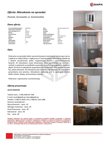 Oferta: Mieszkanie na sprzedaż Poznań, Grunwald, ul. Szamotulska Dane oferty: Cena sprzedaży/wynajmu: Powierzchnia całkowita: Cena sprzedaży za m2: Miasto: Kod pocztowy: Ulica: Dzielnica: Piętro: Liczba pięter: Rok budowy: Liczba pokoi: 207 000 zł 36 5750 m2 Poznań 61-456 Szamotulska Grunwald 3 3 1980 2 Stan: Winda: Łazienka: Garaż: Miejsce parkingowe: Forma własności: Typ Budynku: Materiał budowlany: Status oferty: Typ kuchni: Typ ogrzewania: Do wprowadzenia się Nie Tak Nie Nie Pełna własność Niski blok Cegła Aktualna Otwarta Centralne Opis: Polecamy na sprzedaż ładne wyremontowane mieszkanie mieszczące się na 3 piętrze w niskim bloku z cegły przy ul. Szamotulskiej. Mieszkanie składa się z dwóch niezależnych pokoi, wyposażonej kuchni i wyremontowanej łazienki. W mieszkaniu nowe drewniane okna wychodzące na wschód i zachód, w pokojach na podłodze są panele, w kuchni, przedpokoju i łazience płytki. Kuchnia w zabudowie wyposażona w sprzęt AGD. Mieszkanie posiada Kw. pełna własność. W mieszkaniu jest centralne ogrzewanie, do mieszkania przynależna jest piwnica. Mieszkanie położone jest w spokojnej okolicy blisko szkoła, sklepy, komunikacja miejska. Polecamy i zapraszamy na prezentację Ofertę prezentuje: Jacek Sobański Telefon kom.: (+48) 508 647 298 E-mail: [email protected], [email protected] Telefon: (+48) 61 8261 472, (+48) 61 4151 968 Numery wewnętrzne: Nieruchomości - wew. 10 Obsługa inwestycji - wew. 20 Dział finansowy - wew. 30 Sekretariat - wew. 40 Fax. - wew. 50 Niniejszy dokument nie stanowi oferty w rozumieniu przepisów kodeksu cywilnego, a wyłącznie propozycje mogące stanowić przedmiot rozpoczęcia negocjacji w zakresie określonym w niniejszym dokumencie. Oświadczenie o przyjęciu wynikających z niego warunków nie stanowi oświadczenia o przyjęciu oferty, a jedynie wolę rozpoczęcia negocjacji w rozumieniu kodeksu cywilnego. GAIFA Sp. z o.o. Sp. k. zastrzega sobie prawo do dokonywania zmian w dokumencie. GAIFA spółka z ograniczoną odpowiedzialnością spółka komandytowa ul. Naramowicka 68, 61-619 Poznań NIP: 9721240549 REGON: 302209568 KRS: 0000430156 tel./fax: +48 61 8261472, www.gaifa.pl, e-mail: [email protected] Niniejszy dokument nie stanowi oferty w rozumieniu przepisów kodeksu cywilnego, a wyłącznie propozycje mogące stanowić przedmiot rozpoczęcia negocjacji w zakresie określonym w niniejszym dokumencie. Oświadczenie o przyjęciu wynikających z niego warunków nie stanowi oświadczenia o przyjęciu oferty, a jedynie wolę rozpoczęcia negocjacji w rozumieniu kodeksu cywilnego. GAIFA Sp. z o.o. Sp. k. zastrzega sobie prawo do dokonywania zmian w dokumencie. GAIFA spółka z ograniczoną odpowiedzialnością spółka komandytowa ul. Naramowicka 68, 61-619 Poznań NIP: 9721240549 REGON: 302209568 KRS: 0000430156 tel./fax: +48 61 8261472, www.gaifa.pl, e-mail: [email protected]