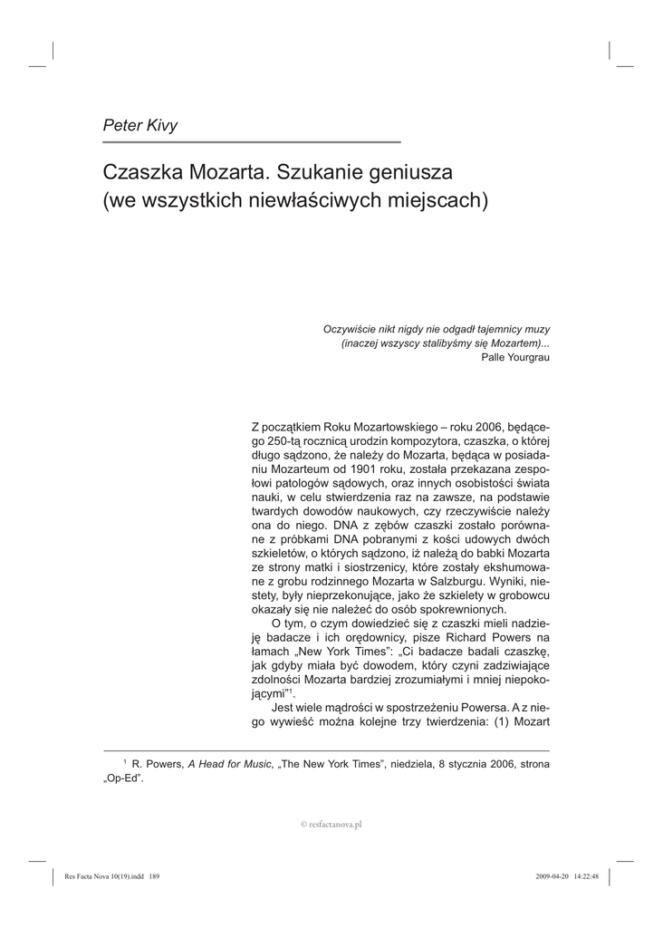 Peter Kivy Czaszka Mozarta. Szukanie geniusza (we wszystkich niewłaściwych miejscach) Oczywiście nikt nigdy nie odgadł tajemnicy muzy (inaczej wszyscy stalibyśmy się Mozartem)... Palle Yourgrau Z początkiem Roku Mozartowskiego – roku 2006, będącego 250-tą rocznicą urodzin kompozytora, czaszka, o której długo sądzono, że należy do Mozarta, będąca w posiadaniu Mozarteum od 1901 roku, została przekazana zespołowi patologów sądowych, oraz innych osobistości świata nauki, w celu stwierdzenia raz na zawsze, na podstawie twardych dowodów naukowych, czy rzeczywiście należy ona do niego. DNA z zębów czaszki zostało porównane z próbkami DNA pobranymi z kości udowych dwóch szkieletów, o których sądzono, iż należą do babki Mozarta ze strony matki i siostrzenicy, które zostały ekshumowane z grobu rodzinnego Mozarta w Salzburgu. Wyniki, niestety, były nieprzekonujące, jako że szkielety w grobowcu okazały się nie należeć do osób spokrewnionych. O tym, o czym dowiedzieć się z czaszki mieli nadzieję badacze i ich orędownicy, pisze Richard Powers na łamach „New York Times”: „Ci badacze badali czaszkę, jak gdyby miała być dowodem, który czyni zadziwiające zdolności Mozarta bardziej zrozumiałymi i mniej niepokojącymi”1. Jest wiele mądrości w spostrzeżeniu Powersa. A z niego wywieść można kolejne trzy twierdzenia: (1) Mozart 1 R. Powers, A Head for Music, „The New York Times”, niedziela, 8 stycznia 2006, strona „Op-Ed”. © resfactanova.pl Res Facta Nova 10(19).indd 189 2009-04-20 14:22:48 był geniuszem. (2) Geniusz jest niepokojący, zwłaszcza geniusz Mozarta. (3) Geniusz jest tajemniczy, zwłaszcza geniusz Mozarta. Tym nieskażonym postmodernistyczną teorią i praktyką badawczą może się wydawać skrajnie dziwacznym, że istnieje jakakolwiek potrzeba stwierdzania rzeczy tak dla nich oczywistych, jak pierwsze twierdzenie; że Mozart był geniuszem – mało tego, jednym z tych, którzy nadają temu słowu sens. Dalej będę musiał poświęcić nieco miejsca postmodernistycznym burzycielom geniuszu; temu co mówią, dlaczego to mówią, i jak im odpowiedzieć. Ale na razie chcę się zająć dwoma ostatnimi twierdzeniami. Powers sugeruje, iż geniusz jest niepokojący i sądzę, że przynajmniej do pewnego stopnia ma rację. Dlaczego? Cóż, po pierwsze jest tajemniczy, a tajemnicze, nieznane jest oczywiście samo w sobie niepokojące. Lecz być może geniusz także niepokoi, widziany jako wyzwanie dla naszego poczucia własnej wartości. Jego pochodzenie i natura nie tylko wykraczają poza granice naszego rozumienia, lecz także to, co c z y n i dalece wykracza poza nasze możliwości – w istocie przekracza je t a k b a r d z o, że zasługuje na specjalne miano i podziw, jakim się go darzy. To jednak pozostawia bez odpowiedzi pytanie, dlaczego geniusz M o z a r t a, jak Powers zdaje się sugerować, miałby być s z c z e g ó l n i e niepokojący, s z c z e g ó l n i e tajemniczy. Proszę pozwolić, bym zaczął odpowiadać na to pytanie, zwracając uwagę na ilustrację wybraną do niewielkiego eseju Powersa o czaszce Mozarta, zamieszczonym w „Timesie”. Rysunek jest podpisany. Ale nie jest jasne, kto dobrał do niego muzyczne tło. Ktokolwiek to zrobił, uczynił wyjątkowo stosowny wybór. Jeśli się dobrze przyjrzeć, okazuje się, że w ręku Mozarta znajduje się początek arii Cherubina, Non so piu, z pierwszego aktu Le Nozze di Figaro. I uważam, iż jest to wyjątkowo stosowny wybór, gdyż Cherubino jest doskonałą metaforą samego Mozarta. Mozart jest w istocie Cherubinem muzyki, a Cherubino Mozartem namiętności seksualnej. Albowiem tak samo jak seksualność Cherubina, która objawia się z pełną, dojrzałą siłą w młodym wieku 13 lat, objawia się talent Mozarta, który w tym młodym wieku był już dojrzałym kompozytorem i miał w dorobku operę, singspiel, i ponad 50 dzieł w katalogu Köchla. Seksualna dojrzałość jako metafora dojrzałości muzycznej! Nie trzeba być freudystą, by przyjąć takie założenie. Cóż, nie ma nic nowego w tym, że Mozart był wyjątkowo utalentowany muzycznie. Dziecko-kompozytor jest równie nieodłącznym elementem naszego wyobrażenia geniuszu Mozarta, jak wizerunek głuchego kompozytora, który kojarzymy z Beethovenem. Paul Henry Lang przy okazji dwusetnej rocznicy urodzin Mozarta zauważył, iż Mozart był „intronizowany na symbol geniuszu” przez wczesnych romantyków, „i to nad wiek rozwiniętego młodzieńca”, dodaje, „którego we wszystkim widziano”.2 Goethe, na przykład, w podeszłych latach wspominał siedmioletniego Mozarta jako „małego człowieka z przystrojoną głową i mieczem”3. Nie chodzi tylko o to, że Mozart był cudownym dzieckiem. W końcu w historii muzyki byli i inni. Ale to s t o p i e ń jego wczesnego rozwoju był i pozostaje tak zadziwiający. 2 P.H. Lang, Mozart After 200 Years, „Journal of the American Musicological Society” 1960, nr 13, s. 197. 3 J.W. von Goethe, Goethe’s Conversations with Eckermann, przeł. R.O. Moon, London: Morgan, Laird, [b.d.], s. 301. © resfactanova.pl Res Facta Nova 10(19).indd 190 2009-04-20 14:22:49 Nigdy nie było podobnego zjawiska i można z pewnością przewidywać, że nigdy już takiego nie będzie. Zatem fakt wczesnego rozwoju, jak i jego wielkość, stanowią o wyjątkowości, tajemniczości i niepokojącym charakterze geniuszu Mozarta. Geniusz w jakiejkolwiek formie dogłębnie nas niepokoi, podejrzewam, że dlatego, iż zagraża naszemu poczuciu własnej wartości i ponieważ go nie rozumiemy. Przejdę do drugiej z kwestii w dalszej części. Lecz mając na uwadze pierwszą, możemy zapytać, dlaczego tak wcześnie rozwinięty geniusz, zwłaszcza Mozarta, miałby być tak niepokojący i zagrażać naszemu wrażliwemu ego. Rzecz w tym, jak sądzę, że jako dorośli czujemy się znacznie bardziej upokorzeni przez pięcioletniego geniusza funkcjonującego na