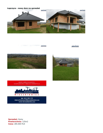 Łapczyca - nowy dom na sprzedaż Sprzedaż: Domy Powierzchnia: 125m2 Cena: 285.000 PLN Dostępność: Dostępne Typ: Dom Nr oferty: 161 !! 0% PROWIZJI OD KUPUJĄCEGO !! Do sprzedaży parterowy dom jednorodzinny o powierzchni użytkowej 125m2, położony na widokowej działce o powierzchni 10a. Kształt działki prostokątny, o wystawie południowo- zachodniej. Budynek murowany w technologii tradycyjnej - z pustaka ceramicznego, stropy żelbetowe, dach kryty dachówką ceramiczną. Poddasze użytkowe. Na niezabudowanej części działki aktualne pozwolenie na budowę drugiego domu. Cena ofertowa dotyczy budynku w stanie surowym zamkniętym (właściciel sfinansuje zakup okien po uzgodnieniu ich marki, modelu i koloru). Zapraszamy!! !! 0% PROWIZJI OD KUPUJĄCEGO !! Cena ofertowa dotyczy budynku w stanie surowym zamkniętym (właściciel sfinansuje zakup okien po uzgodnieniu ich marki, modelu i koloru). Alternatywnie możliwość zakupu oferowanego domu na działce o powierzchni 10a, lub zakupu części działki z pozwoleniem na budowę(10a) – ceny do uzgodnienia!! Zapraszamy!! !! 0% PROWIZJI OD KUPUJĄCEGO !! Adres tego pliku: http://www.broszkiewicz.eu/pdf/offer/167 Adres oferty na stronie: http://www.broszkiewicz.eu/site/offers/show/167/lapczyca-nowy-dom-sprzedaz.html