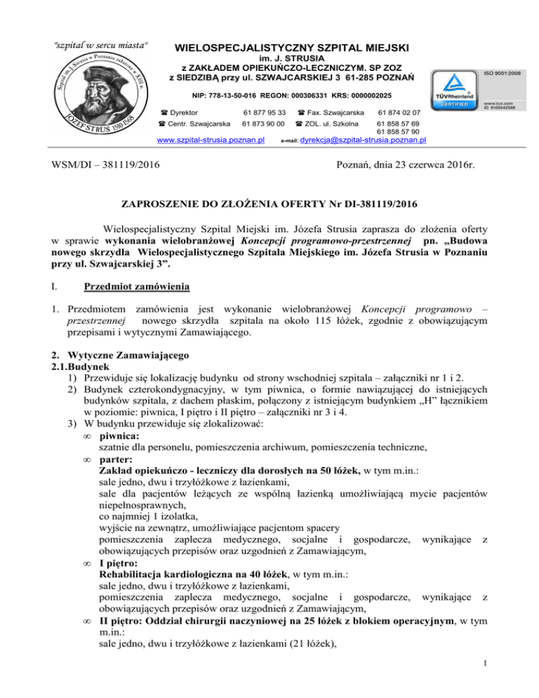 WIELOSPECJALISTYCZNY SZPITAL MIEJSKI im. J. STRUSIA z ZAKŁADEM OPIEKUŃCZO-LECZNICZYM. SP ZOZ z SIEDZIBĄ przy ul. SZWAJCARSKIEJ 3 61-285 POZNAŃ NIP: 778-13-50-016 REGON: 000306331 KRS: 0000002025 ` Dyrektor Centr. Szwajcarska 61 877 95 33 61 873 90 00 www.szpital-strusia.poznan.pl WSM/DI – 381119/2016 Fax. Szwajcarska ZOL. ul. Szkolna 61 874 02 07 61 858 57 69 61 858 57 90 e-mail: [email protected] Poznań, dnia 23 czerwca 2016r. ZAPROSZENIE DO ZŁOŻENIA OFERTY Nr DI-381119/2016 Wielospecjalistyczny Szpital Miejski im. Józefa Strusia zaprasza do złożenia oferty w sprawie wykonania wielobranżowej Koncepcji programowo-przestrzennej pn. „Budowa nowego skrzydła Wielospecjalistycznego Szpitala Miejskiego im. Józefa Strusia w Poznaniu przy ul. Szwajcarskiej 3”. I. Przedmiot zamówienia 1. Przedmiotem zamówienia jest wykonanie wielobranżowej Koncepcji programowo – przestrzennej nowego skrzydła szpitala na około 115 łóżek, zgodnie z obowiązującym przepisami i wytycznymi Zamawiającego. 2. Wytyczne Zamawiającego 2.1.Budynek 1) Przewiduje się lokalizację budynku od strony wschodniej szpitala – załączniki nr 1 i 2. 2) Budynek czterokondygnacyjny, w tym piwnica, o formie nawiązującej do istniejących budynków szpitala, z dachem płaskim, połączony z istniejącym budynkiem „H” łącznikiem w poziomie: piwnica, I piętro i II piętro – załączniki nr 3 i 4. 3) W budynku przewiduje się zlokalizować: • piwnica: szatnie dla personelu, pomieszczenia archiwum, pomieszczenia techniczne, • parter: Zakład opiekuńczo - leczniczy dla dorosłych na 50 łóżek, w tym m.in.: sale jedno, dwu i trzyłóżkowe z łazienkami, sale dla pacjentów leżących ze wspólną łazienką umożliwiającą mycie pacjentów niepełnosprawnych, co najmniej 1 izolatka, wyjście na zewnątrz, umożliwiające pacjentom spacery pomieszczenia zaplecza medycznego, socjalne i gospodarcze, wynikające z obowiązujących przepisów oraz uzgodnień z Zamawiającym, • I piętro: Rehabilitacja kardiologiczna na 40 łóżek, w tym m.in.: sale jedno, dwu i trzyłóżkowe z łazienkami, pomieszczenia zaplecza medycznego, socjalne i gospodarcze, wynikające z obowiązujących przepisów oraz uzgodnień z Zamawiającym, • II piętro: Oddział chirurgii naczyniowej na 25 łóżek z blokiem operacyjnym, w tym m.in.: sale jedno, dwu i trzyłóżkowe z łazienkami (21 łóżek), 1 sala monitorowania/nadzoru pacjentów (4 łóżka) blok operacyjny: 1 sala operacyjna hybrydowa o powierzchni min. 75 m2 i 1 sala operacyjna standardowa o powierzchni min. 40 m2 , z zapleczem medycznym, pomieszczenia zaplecza medycznego, socjalne i gospodarcze, wynikające z obowiązujących przepisów oraz uzgodnień z Zamawiającym, 2.2.Zagospodarowanie terenu w okolicy nowego budynku, w tym m. in.: • przebudowa/dostosowanie układu dróg, w tym drogi pożarowej, nowe miejsca parkingowe (szpital aktualnie posiada ok.700 miejsc), zieleń i mała architektura - pod kątem wypoczynku pacjentów, 2.3.Doprowadzenie przyłączy do nowego budynku, w tym m.in.: • woda zimna - z istniejącej sieci szpitala (własne ujęcie wody), • ciepło (cwu., co., cts., ctz., para) - z istniejącej sieci szpitala (własna kotłownia), • kanalizacja sanitarna i deszczowa – zrzut do istniejących na terenie szpitala sieci, • gazy medyczne - z istniejącej sieci szpitala (własne źródła), • energia elektryczna - brak rezerwy mocy w istniejących stacja transformatorowych, stąd należy uwzględnić konieczność rozbudowy stacji S-1 po stronie SN i NN i doprowadzenie energii do rozdzielni w nowym budynku, • instalacja p.poż. – należy przewidzieć nową centralę systemu sygnalizacji pożaru w pełni współpracująca z istniejącą w szpitalu centralą SCHRACK SECONET. • instalacja telefoniczna - z istniejącej sieci szpitala (własna centrala telefoniczna), 2.4.Przebudowa/przełożenie istniejącego uzbrojenia nad i podziemnego, stanowiącego przeszkodę w lokalizacji budynku w planowanym miejscu. 3. Przedmiot zamówienia zostanie wykonany w następującym zakresie: 3.1.Wielobranżowa Koncepcja programowo-przestrzenna, zapewniająca dokonanie wyboru najkorzystniejszego wariantu rozwiązania inwestycji jako całości, w tym m.in.: 1) technologia (program użytkowy, opis, rzuty, wykaz wyposażenia), 2) architektura (rozwiązania architektoniczno-budowlane, określenie przewidywanego standardu wyposażenia i wykończenia materiałowego obiektu, opisy, rzuty, przekroje, elewacje), 3) konstrukcja (określenie rozwiązań konstrukcyjno-budowlanych, podstawowe schematy konstrukcyjne wraz z niezbędnymi obliczeniami i opisami dotyczącymi przyjętych rozwiązań konstrukcyjno-materiałowych i metod realizacji, 4) wstępne bilanse zaopatrzenia w energię elektryczną i cieplną, wodę, itd. 5) wytyczne do opracowań branżowych 6) rozwiązania branżowe infrastruktury technicznej (opisy, schematy rysunkowe, dobór i wykaz urządzeń, armatury, przebieg przyłączy/sieci), w tym m.in.: • instalacje i przyłącza sanitarne (woda zimna i ciepła, energia cieplna, kanalizacja), • instalacja wentylacji/klimatyzacji, • instalacja i przyłącza gazów medycznych, • instalacja i przyłącza elektryczne (zasilanie urządzeń, oświetlenie, itp.) wraz z rozbudową stacji transformatorowej pod potrzeby nowego budynku, • instalacja p.poż. (nowa centrala systemu sygnalizacji pożaru, instalacja), • instalacje teletechniczne, komputerowe, przyzywowa, itp. 7) przebudowa/przełożenie istniejącego uzbrojenia nad i podziemnego, stanowiącego przeszkodę w lokalizacji budynku w planowanym miejscu 8) plan zagospodarowania terenu ( drogi, parkingi, zieleń, mała architektura, itd.) 9) inne niezbędne rozwiązania/opracowania, wraz z uzgodnieniem rozwiązań z Państwowym Powiatowym Inspektorem Sanitarnym w Poznaniu oraz rzeczoznawcami do spraw bhp i p.poż. oraz Zamawiającym. 3.2.Szacunkowy koszt wykonania inwestycji (zestawi