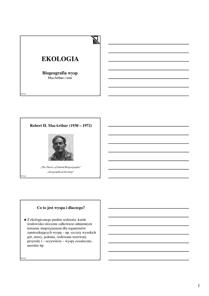 EKOLOGIA Biogeografia wysp MacArthur i inni Ekologia 1 Robert H. MacArthur (1930 – 1972) „The Theory of Island Biogeography” „Geographical Ecology” Ekologia 2 Co to jest wyspa i dlaczego? Ekologia Z ekologicznego punktu widzenia: każ każde środowisko otoczone cał całkowicie odmiennym terenem, nieprzyjaznym dla organizmó organizmów zamieszkują zamieszkujących wyspę wyspę – np. szczyty wysokich gór, stawy, jaskinie, izolowane rezerwaty przyrody i – oczywiś oczywiście – wyspy oceaniczne, morskie itp. 3 1 Podstawowe pytania Jakie czynniki determinują determinują liczbę liczbę gatunkó gatunków na wyspie? Od czego zależ zależy szczegó szczególny zestaw gatunkó gatunków tam wystę występują pujących? Dlaczego pewne gatunki są są sprawnymi kolonistami, z reguł reguły zasiedlają zasiedlającymi wyspy, podczas gdy inne pojawiają pojawiają się się rzadko lub nigdy? W jakim stopniu poszczegó poszczególne gatunki ró różnią nią się się pomię pomiędzy wyspami? Na ile teoria biogeografii wysp moż może być być przydatna w ochronie przyrody? Ekologia 4 Skąd na wyspach biorą się nowe gatunki? 1. Rośliny Roś Rośliny są są bardzo dobrymi kolonizatorami: wystarczy tylko kilka nasion, by zasiedlić zasiedlić nową nową wyspę wyspę nasiona i spory niektó niektórych roś roślin mogą mogą być być przenoszone z wiatrem na odległ odległość setek kilometró kilometrów niektó niektóre owoce i nasiona przyczepiają przyczepiają się się do pió piór migrują migrujących ptakó ptaków niektó niektóre nasiona mogą mogą kieł kiełkować kować nawet po 2 tygodniach spę spędzonych w ukł układzie pokarmowym zwierzą zwierząt niektó niektóre nasiona i roś rośliny mogą mogą być być przenoszone przez prą prądy morskie na znaczne odległ odległości Przykł Przykład: Wyspy Galapagos – niemal cał cała flora z Poł Południowej Ameryki; ok. 380 przypadkó przypadków kolonizacji: 60% za poś pośrednictwem ptakó ptaków, 31% z wiatrem, 9% z prą prądami morskimi. Ekologia 5 Skąd na wyspach biorą się nowe gatunki? 2. Zwierzęta Ekologia Migrują Migrujące ptaki Niektó Niektóre bezkrę bezkręgowce mogą mogą być być przenoszone z wiatrem na ogromne odległ odległości „Pływają ywające wyspy” wyspy” – np. powalone pnie drzew, duż duże nasiona roś roślin (orzechy kokosowe!), itp. Anguilla w Mał Małych Antylach: po dwó dwóch huraganach w 1995 r. w rejonie morza karaibskiego na plaż plaży znaleziono mnó mnóstwo spł spławionych drzew i 15 osobnikó osobników iguany zielonej, któ które najprawdopodobniej przypł y na pniach z Gwadelupy, przypłynęł ynęły gdzie te gady normalnie wystę występują pują podró podróż przez ok. 6 mies. i 250 km! 6 2 Liczba gatunków i wielkość wyspy Na duż dużych wyspach jest wiele gatunkó gatunków, na mał małych – mał mało np. ssaki: Wielka Brytania – 44; Irlandia – 22 Czy odpowiada za to o ok. 36 km wię większa odległ odległość od kontynentu? Nie! Spoś Spośród 13 gat. nietoperzy w Wielkiej Brytanii, tylko 7 wystę występuje w Irlandii. ok. 22-krotny wzrost liczby gatunkó gatunków przy 1010-krotnie wię większej powierzchni wyspy liczba gatunkó cy od gatunków S = cAz (c – wspó współczynnik zależą zależący dyspersyjnoś dyspersyjności organizmó organizmów, A – powierzchnia wyspy, z – wykł wykładnik okreś określają lający zależ zależność ność mię między liczbą liczbą gatunkó gatunków i powierzchnią powierzchnią wyspy dla wszystkich taksonó taksonów; badania wskazują wskazują, że jego wartość wartość jest dość dość stał stała). Ekologia 7 S = cAz - wartość współczynnika „z” Grupa organizmó organizmów Lokalizacja wartość wartość „z” chrzą chrząszcze płazy i gady Antyle („ („Indie Zachodnie” Zachodnie”) Antyle („ („Indie Zachodnie” Zachodnie”) 0,34 0,30 Ptaki Ptaki USA – Wielka Kotlina Antyle („ („Indie Zachodnie” Zachodnie”) 0,17 0,24 krę kręgowce lą lądowe wyspy jez. Michigan 0,24 mró mrówki ptaki Melanezja Indonezja („ („Indie Wschodnie” Wschodnie”) 0,30 0,28 roś rośliny lą lądowe Galapagos 0,33 muchó muchówki parki w Cincinnati 0,24 ssaki Ameryka Pó Północna 0,15 Ekologia 8 Dlaczego wielkość wyspy jest tak ważna? Wielkość Wielkość wyspy jest z reguł reguły dodatnio skorelowana z różnorodnoś norodnością cią środowisk ze wzrostem powierzchni roś rośnie liczba nisz wię większa liczba gatunkó gatunków Czy sama wielkość wielkość ma znaczenie? przykł y kolonizowane przykład – „wyspy” wyspy” z muszel małż małży przez bezkrę bezkręgowce; wielkość wielkość „wysp” wysp” moż może być być różna, ale liczba nisz nie zmienia się się: 10 cm2 – 8 gat.; 100 cm2 – 13 gat.; 70000 cm2 - 20 gat. wielkość wielkość jest waż ważna: wię większa powierzchnia wię większe populacje mniejsze prawdopodobień prawdopodobieństwo ekstynkcji Ekologia 9 3 Znaczenie sąsiedztwa wyspy i ryzyka na wyspach Liczba gatunkó gatunków zależ zależy od: odległ odległości od źródła gatunkó gatunków (np. najbliż najbliższego lą lądu) bogactwa gatunkowego rejonu źródłowego Życie na wyspach jest bardziej ryzykowne niż niż na lą lądzie efekty lokalnych katastrof mają mają znacznie wię większe znaczenie na wyspach – mogą mogą łatwo doprowadzić doprowadzić do cał całkowitej ekstynkcji wielu gatunkó gatunków rejony źródłowe są są zawsze bogatsze w gatunki, nawet gdy środowiska są są identyczne jak na wyspie np. spoś y od roku spośród 171 gat. ptakó ptaków, jakie wyginęł wyginęły 1600, 90% ekstynkcji miał miało miejsce na wyspach, z czego 75% na najmniejszych z nich. Ekologia 10 Znaczenie wielkości populacji na wyspach Efekt zał założyciela: mał mała populacja = mał mała pula genowa duż duże prawdopo