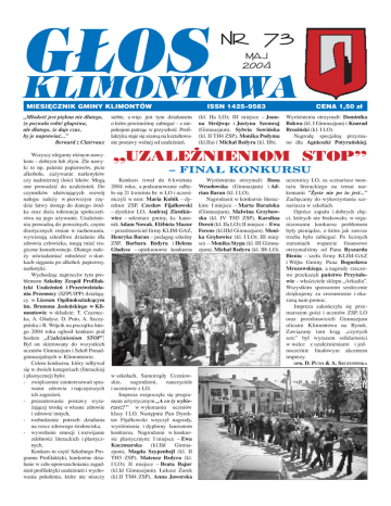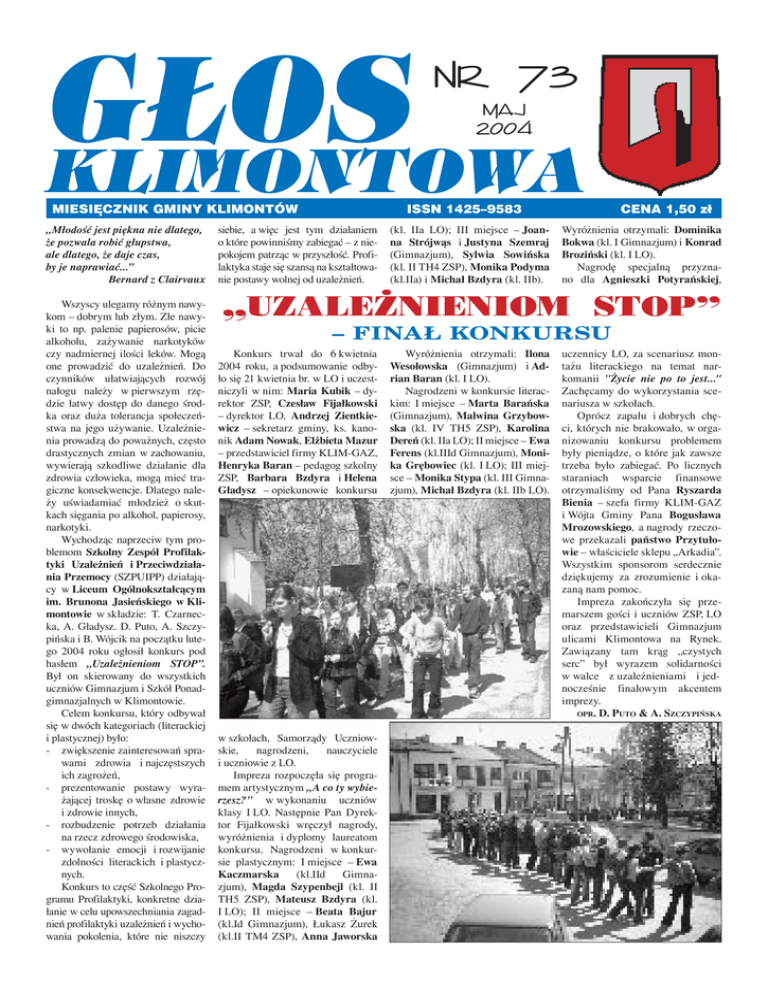 GŁOS KLIMONTOWA NR 73 maj 2004 MIESIĘCZNIK GMINY KLIMONTÓW „Młodość jest piękna nie dlatego, że pozwala robić głupstwa, ale dlatego, że daje czas, by je naprawiać...” Bernard z Clairvaux Wszyscy ulegamy różnym nawykom – dobrym lub złym. Złe nawyki to np. palenie papierosów, picie alkoholu, zażywanie narkotyków czy nadmiernej ilości leków. Mogą one prowadzić do uzależnień. Do czynników ułatwiających rozwój nałogu należy w pierwszym rzędzie łatwy dostęp do danego środka oraz duża tolerancja społeczeństwa na jego używanie. Uzależnienia prowadzą do poważnych, często drastycznych zmian w zachowaniu, wywierają szkodliwe działanie dla zdrowia człowieka, mogą mieć tragiczne konsekwencje. Dlatego należy uświadamiać młodzież o skutkach sięgania po alkohol, papierosy, narkotyki. Wychodząc naprzeciw tym problemom Szkolny Zespół Profilaktyki Uzależnień i Przeciwdziałania Przemocy (SZPUIPP) działający w Liceum Ogólnokształcącym im. Brunona Jasieńskiego w Klimontowie w składzie: T. Czarnecka, A. Gładysz. D. Puto, A. Szczypińska i B. Wójcik na początku lutego 2004 roku ogłosił konkurs pod hasłem „Uzależnieniom STOP”. Był on skierowany do wszystkich uczniów Gimnazjum i Szkół Ponadgimnazjalnych w Klimontowie. Celem konkursu, który odbywał się w dwóch kategoriach (literackiej i plastycznej) było: - zwiększenie zainteresowań sprawami zdrowia i najczęstszych ich zagrożeń, - prezentowanie postawy wyrażającej troskę o własne zdrowie i zdrowie innych, - rozbudzenie potrzeb działania na rzecz zdrowego środowiska, - wywołanie emocji i rozwijanie zdolności literackich i plastycznych. Konkurs to część Szkolnego Programu Profilaktyki, konkretne działanie w celu upowszechniania zagadnień profilaktyki uzależnień i wychowania pokolenia, które nie niszczy ISSN 1425–9583 siebie, a więc jest tym działaniem o które powinniśmy zabiegać – z niepokojem patrząc w przyszłość. Profilaktyka staje się szansą na kształtowanie postawy wolnej od uzależnień. (kl. IIa LO); III miejsce – Joanna Strójwąs i Justyna Szemraj (Gimnazjum), Sylwia Sowińska (kl. II TH4 ZSP), Monika Podyma (kl.IIa) i Michał Bzdyra (kl. IIb). CENA 1,50 zł Wyróżnienia otrzymali: Dominika Bokwa (kl. I Gimnazjum) i Konrad Broziński (kl. I LO). Nagrodę specjalną przyznano dla Agnieszki Potyrańskiej, „UZALEŻNIENIOM STOP” – FINAŁ KONKURSU Konkurs trwał do 6 kwietnia 2004 roku, a podsumowanie odbyło się 21 kwietnia br. w LO i uczestniczyli w nim: Maria Kubik – dyrektor ZSP, Czesław Fijałkowski – dyrektor LO, Andrzej Zientkiewicz – sekretarz gminy, ks. kanonik Adam Nowak, Elżbieta Mazur – przedstawiciel firmy KLIM-GAZ, Henryka Baran – pedagog szkolny ZSP, Barbara Bzdyra i Helena Gładysz – opiekunowie konkursu w szkołach, Samorządy Uczniowskie, nagrodzeni, nauczyciele i uczniowie z LO. Impreza rozpoczęła się programem artystycznym „A co ty wybierzesz?" w wykonaniu uczniów klasy I LO. Następnie Pan Dyrektor Fijałkowski wręczył nagrody, wyróżnienia i dyplomy laureatom konkursu. Nagrodzeni w konkursie plastycznym: I miejsce – Ewa Kaczmarska (kl.IId Gimnazjum), Magda Szypenbejl (kl. II TH5 ZSP), Mateusz Bzdyra (kl. I LO); II miejsce – Beata Bajur (kl.Id Gimnazjum), Łukasz Żurek (kl.II TM4 ZSP), Anna Jaworska Wyróżnienia otrzymali: Ilona Wesołowska (Gimnazjum) i Adrian Baran (kl. I LO). Nagrodzeni w konkursie literackim: I miejsce – Marta Barańska (Gimnazjum), Malwina Grzybowska (kl. IV TH5 ZSP), Karolina Dereń (kl. IIa LO); II miejsce – Ewa Ferens (kl.IIId Gimnazjum), Monika Grębowiec (kl. I LO); III miejsce – Monika Stypa (kl. III Gimnazjum), Michał Bzdyra (kl. IIb LO). uczennicy LO, za scenariusz montażu literackiego na temat narkomanii "Życie nie po to jest..." Zachęcamy do wykorzystania scenariusza w szkołach. Oprócz zapału i dobrych chęci, których nie brakowało, w organizowaniu konkursu problemem były pieniądze, o które jak zawsze trzeba było zabiegać. Po licznych staraniach wsparcie finansowe otrzymaliśmy od Pana Ryszarda Bienia – szefa firmy KLIM-GAZ i Wójta Gminy Pana Bogusława Mrozowskiego, a nagrody rzeczowe przekazali państwo Przytułowie – właściciele sklepu „Arkadia”. Wszystkim sponsorom serdecznie dziękujemy za zrozumienie i okazaną nam pomoc. Impreza zakończyła się przemarszem gości i uczniów ZSP, LO oraz przedstawicieli Gimnazjum ulicami Klimontowa na Rynek. Zawiązany tam krąg „czystych serc” był wyrazem solidarności w walce z uzależnieniami i jednocześnie finałowym akcentem imprezy. OPR. D. PUTO & A. SZCZYPIŃSKA GŁOS KLIMONTOWA 2 213 ROCZNICA UCHWALENIA KONSTYTUCJI W Klimontowie obchodzono bardzo uroczyście 213 rocznicę Uchwalenia Konstytucji. Piękne stroje licealistów, z piękną akademią przygotowaną przez nich specjalnie na te obchody wspólnie z opiekunką Panią Anną Szczypińską, wprowadziły wszyst- kich uczestników uroczystości rocznicowych w nostalgiczny nastrój tamtych czasów. Słowa recytowane przez uczniów głęboko podkreślały znaczenie tego święta: „Coraz rzadziej towarzyszy młodym ludziom głębsza refleksja nad rangą tego wydarzenia. Coraz DLA ROZWOJU ROLNICTWA 13 marca br. odbył się wyjazd szkoleniowy na Międzynarodowe Targi Techniki Rolniczej „AGROTECH” w Kielcach. Organizatorem wyjazdu była Komisja Rolna Rady Gminy w Klimontowie oraz Wojewódzki Ośrodek Doradztwa Rolniczego w Modliszewicach, Oddział w Sandomierzu. Grupa 30 rolników z naszej gminy mogła podziwiać najnowsze osiągnięcia techniki rolniczej, szkoda, że na razie mało dostępne ze względów ekonomicznych. Uczestnicy wyjazdu oprócz zwiedzania wystaw uczestniczyli również w konferencji prasowej Ministra Rolnictwa – Wojciecha Olejniczaka, który mówił o sytuacji w rolnictwie po akcesji do Unii Europejskiej, w tym o rentach strukturalnych i wsparciu gospodarstw rolnych. Podczas wyjazdu nawi