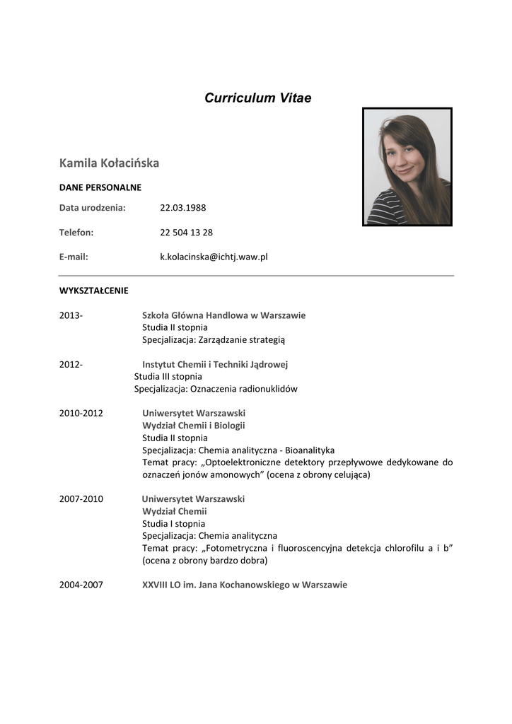 Curriculum Vitae Kamila Kołacińska DANE PERSONALNE Data urodzenia: 22.03.1988 Telefon: 22 504 13 28 E-mail: [email protected] WYKSZTAŁCENIE 2013- 2012- Szkoła Główna Handlowa w Warszawie Studia II stopnia Specjalizacja: Zarządzanie strategią Instytut Chemii i Techniki Jądrowej Studia III stopnia Specjalizacja: Oznaczenia radionuklidów 2010-2012 Uniwersytet Warszawski Wydział Chemii i Biologii Studia II stopnia Specjalizacja: Chemia analityczna - Bioanalityka Temat pracy: „Optoelektroniczne detektory przepływowe dedykowane do oznaczeń jonów amonowych” (ocena z obrony celująca) 2007-2010 Uniwersytet Warszawski Wydział Chemii Studia I stopnia Specjalizacja: Chemia analityczna Temat pracy: „Fotometryczna i fluoroscencyjna detekcja chlorofilu a i b” (ocena z obrony bardzo dobra) 2004-2007 XXVIII LO im. Jana Kochanowskiego w Warszawie DOŚWIADCZENIE NAUKOWE 20-24.10.2013 Atoms for the Future (Francja, Paryż) Sympozjum organizowane przez French Nuclear Energy Society Young Generation (SFEN-JG) na temat najnowszych technologii i zastosowań w obszarze energetyki jądrowej. 22-27.09.2013 5th Asia-Pacific Symposium on Radiochemistry’13 (Japonia, Kanazawa) Tytuł pracy: „Application of flow analytical methods for determination of radionuclides in cooling water and wastes from nuclear plants” Autorzy: A. Bojanowska-Czajka, K. Kołacińska, M. Trojanowicz 15-20.09.2013 18th International Conference on Flow Injection Analysis (Portugalia, Porto) Tytuł pracy: "Application of optoelectronic detectors in flow-injection determination of ammonia using Nessler method" Autorzy: K.Kołacińska, R.Koncki 1-14.09.2013 MSFIA course (Hiszpania, Palma) Staż szkoleniowy z zakresu obsługi i zastosowania MSFIA (Multisyringies flow injection analysis) i MPFS (Multipumping flow systems) do oznaczeń radionuklidów. 17.05.2013 ChemSession’13 (Polska, Warszawa) Tytuł pracy: "Konstrukcja optoelektronicznych detektorów dedykowanych do zastosowania w połączeniu z analizą przepływową" Autorzy: K. Kołacińska 17.05.2012 VI Warszawskie Forum Dyplomantów Nauk Chemicznych ChemoFor (Polska, Warszawa) Tytuł pracy: „Optoelektroniczne detektory przepływowe dedykowane do oznaczeń jonów amonowych” Autorzy: K. Kołacińska 4-9.07.2010 VIII Polska Konferencja Chemii Analitycznej (Polska, Kraków) Tytuł pracy: „Optyczna detekcja chlorofilu przy użyciu diod elektroluminescencyjnych” Autorzy: K. Kołacińska 07-09.2009 Polska Akademia Nauk - Instytut Chemii Fizycznej (Polska, Warszawa) Praktyka zawodowa – spektroskopia Ramana- przeprowadzanie doświadczeń, przygotowanie próbek laboratoryjnych, pastylkowanie, analiza i interpretacja otrzymanych widm DOŚWIADCZENIE ZAWODOWE 10.2012-07.2013 Omnibus Prowadzenie zajęć naukowych i pokazów chemicznych w sieci przedszkoli Pomarańczowa Ciuchcia. 07-10.2011 DS.Group Asystentka w dziale Back Office Prowadzenie bazy klientów, wprowadzanie umów wewnętrznego, archiwizacja danych, kontakt z klientem. do systemu 05-06.2011 Polski Fundusz Inwestycji Gospodarczych Praktyka zawodowa oparta na rozwiązywaniu problemów w zakresie chemii, rozwiązywanie zadań, doradztwo 06-10.2010 SCA Hygiene Products Asystentka koordynatora ds. zaopatrzenia Ofertowanie aptek, kontakt z klientem, refundacja NFZ, katalogowanie danych, biegła obsługa Portalu Świadczeniodawcy SZKOLENIA 10.2010-02.2011 02.2010-06.2010 02.2009-06.2009 Kurs z zakresu chromatografii cieczowej Kurs z zakresu chemii jądrowej potwierdzony certyfikatem nr 028/2010 Kurs z zakresu metrologii chemicznej potwierdzony certyfikatem TrainMic INNE UMIEJĘTNOŚCI biegła obsługa komputera ( MS Office, Origin, CorelDraw) prawo jazdy kat. B otwartość na nowe wyzwania i doświadczenia szybkie przyswajanie wiedzy, komunikatywność wolontariat w fundacji „Nasze Dzieci” przy Klinice Onkologii w Centrum Zdrowia Dziecka (od 2007) ZNAJMOŚĆ JĘZYKÓW OBCYCH angielski-średnio zaawansowany (First Certyficate in English) francuski-podstawowy ZAINTERESOWANIA teatr, podróże, tenis Wyrażam zgodę na przetwarzanie moich danych osobowych zawartych w mojej ofercie pracy dla potrzeb niezbędnych do realizacji rekrutacji zgodnie z Ustawą z dn. 29.08.97 r. o Ochronie Danych Osobowych (Dz. U. nr 133 poz. 883).