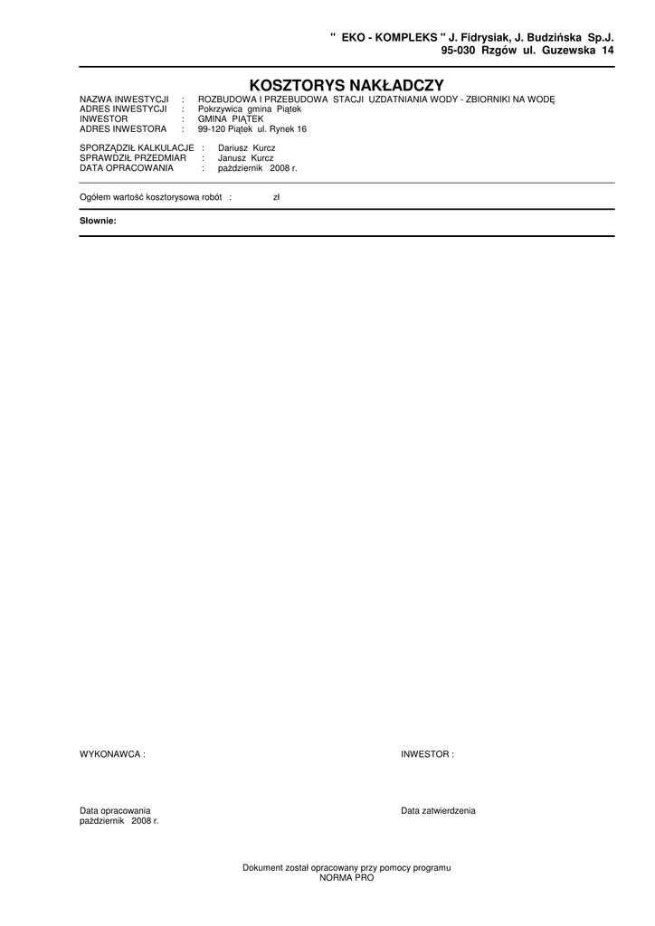 " EKO - KOMPLEKS " J. Fidrysiak, J. Budzińska Sp.J. 95-030 Rzgów ul. Guzewska 14 KOSZTORYS NAKŁADCZY NAZWA INWESTYCJI ADRES INWESTYCJI INWESTOR ADRES INWESTORA : : : : ROZBUDOWA I PRZEBUDOWA STACJI UZDATNIANIA WODY - ZBIORNIKI NA WODĘ Pokrzywica gmina Piątek GMINA PIĄTEK 99-120 Piątek ul. Rynek 16 SPORZĄDZIŁ KALKULACJE : SPRAWDZIŁ PRZEDMIAR : DATA OPRACOWANIA : Dariusz Kurcz Janusz Kurcz pażdziernik 2008 r. Ogółem wartość kosztorysowa robót : zł Słownie: WYKONAWCA : INWESTOR : Data opracowania pażdziernik 2008 r. Data zatwierdzenia Dokument został opracowany przy pomocy programu NORMA PRO POKRZYWNICA - ZBIORNIK WODY CZYSTEJ L Podstawa Opis p. 1 ZBIORNIK WODY - Roboty budowlane 1 KNR 2-01 Roboty ziemne wykon.koparkami podsiębiernyd.1 0206-02 mi o poj.łyżki 0.40 m3 w gr.kat.III z transp.urobku samochod.samowyładowczymi na odległość do 1 km obmiar = 3.14*5.65*5.65*2.10*2 = 420.994m3 1* 2* 3* 2 KNR 2-01 d.1 0214-02 1* 2* 3 KNR 2-01 d.1 0217-06 1* 2* 4 KNR 2-01 d.1 0230-01 1* 5 KNR 2-01 d.1 0236-01 1* 2* jm m3 -- R -robocizna 0.203r-g/m3 r-g -- S -koparka gąsienicowa 0.4 m3 m-g 0.0754m-g/m3 samochód samowyładowczy 5 t m-g 0.2016m-g/m3 Razem koszty bezpośrednie: Razem z narzutami: Ceny jednostkowe Nakłady uzupełn.za każde dalsze rozp. 0.5 km m3 transportu ponad 1 km samochodami samowyładowczymi po terenie lub drogach gruntowych ziemi kat.III-IV Krotność = 8 obmiar = 420.994m3 -- R -robocizna 0.0054*8=0.0432r-g/m3 r-g -- S -Samochód samowyład.do 5t (1) m-g 0.0274*8=0.2192m-g/m3 Razem koszty bezpośrednie: Razem z narzutami: Ceny jednostkowe Wykopy oraz przekopy wykonywane koparkami m3 podsiębiernymi 0.40 m3 na odkład w gruncie kat.III obmiar = 3.14*6.25*6.25*2.10*2-420.994 = 94.162m3 -- R -robocizna 0.1182r-g/m3 r-g -- S -koparka gąsienicowa 0.4 m3 m-g 0.0482m-g/m3 Razem koszty bezpośrednie: Razem z narzutami: Ceny jednostkowe Zasypywanie wykopów spycharkami z przem3 mieszczeniem gruntu na odl. do 10 m w gruncie kat. I-III obmiar = 94.162m3 -- S -spycharka gąsienicowa 55 kW (75 KM) m-g 0.0135m-g/m3 Razem koszty bezpośrednie: Razem z narzutami: Ceny jednostkowe Zagęszczenie wykopów ubijakami mechaniczm3 nymi; grunty sypkie kat. I-III obmiar = 94.162m3 -- R -robocizna 0.1337r-g/m3 -- S -Ubijak spalinowy 200kg 0.0704m-g/m3 Razem koszty bezpośrednie: 85.4618 31.7429 84.8724 18.1869 92.2819 11.1299 4.5386 1.2712 r-g 12.5895 m-g 6.6290 -2- Norma PRO Wersja 4.01, Marzec 2003 r. Licencja: 37337 dla p Nakłady Koszt jedn. R M S POKRZYWNICA - ZBIORNIK WODY CZYSTEJ L p. Podstawa 6 KNR 2-02 d.1 1101-07 1* 2* 3* 7 KNR 2-02 d.1 1905-01 1* 2* 3* 4* 5* 6* 7* 8* 8 KNR 2-02 d.1 1916-01 1* 2* 3* 4* 5* 6* 9 KNR 2-02 d.1 1916-05 1* Opis jm Razem z narzutami: Ceny jednostkowe Podsypka z piasku obmiar = 3.14*5.65*5.65*0.10*2 = 20.047m3 -- R -robocizna 4.32r-g/m3 -- M -piasek 1.08m3/m3 materiały pomocnicze 1.5% Razem koszty bezpośrednie: Razem z narzutami: Ceny jednostkowe Deskowanie systemowe U-Form ,płyt dennych obmiar = 3.14*11.30*0.70*2 = 49.675m2 -- R -robocizna 1.2056r-g/m2 -- M -deski iglaste obrzynane gr.25 mm kl.III' 0.00102m3/m2 Bale iglaste obrzynane gr.50-100mm kl.III 0.00029m3/m2 Gwoździe budowlane okrągłe gołe 0.0571kg/m2 środek antyadhezyjny' 0.07kg/m2 materiały pomocnicze 1.5% m3 r-g 86.6030 m3 21.6508 % 1.5000 m2 r-g 59.8882 m3 0.0507 m3 0.0144 kg 2.8364 kg 3.4773 % 1.5000 -- S -środek transportowy' m-g 0.0471m-g/m2 deskowanie drobnowymiarowe U-Form m-g 0.3847m-g/m2 Razem koszty bezpośrednie: Razem z narzutami: Ceny jednostkowe Betonowanie płyt niezbrojonych i podbetonu o m3 grub. 10 cm obmiar = 3.14*5.65*5.65*1.80*2 = 360.852m3 -- R -robocizna 0.8845r-g/m3 -- M -Beton zwykły B-10 (C8/10) 1.02m3/m3 materiały pomocnicze 1.5% Norma PRO Wersja 4.01, Marzec 2003 r. Licencja: 37337 dla p 19.1100 319.1736 m3 368.0690 % 1.5000 r-g -3- 2.3397 r-g -- S -pompa do betonu na samochodzie 60 m3/h' m-g 0.0798m-g/m3 Samoch.miesz.do bet.2500dm3(1) m-g 0.1435m-g/m3 zagęszczarka wibracyjna spalinowa' m-g 0.1596m-g/m3 Razem koszty bezpośrednie: Razem z narzutami: Ceny jednostkowe Betonowanie płyt zbrojonych o grub. 30 cm m3 obmiar = 3.14*5.65*5.65*0.30*2 = 60.142m3 -- R -robocizna 0.8727r-g/m3 Nakłady 28.7960 51.7823 57.5920 52.4859 Koszt jedn. R M S POKRZYWNICA - ZBIORNIK WODY CZYSTEJ L p. Podstawa 2* 3* 4* 5* 6* 10 KNR 2-02 d.1 0607-02 1* 2* 3* 4* 11 KNR 2-02 d.1 1902-07 1* 2* 3* 4* 5* 6* 7* 8* 9* 10 * 11 * 12 * 13 * 12 KNR 2-02 d.1 1915-05 Opis jm -- M -Beton zwykły B-30 (C25/30)' 1.02m3/m3 materiały pomocnicze 1.5% m3 61.3448 % 1.5000 -- S -pompa do betonu na samochodzie 60 m3/h' m-g 0.0773m-g/m3 Samoch.miesz.do bet.2500dm3(1) m-g 0.1435m-g/m3 zagęszczarka wibracyjna spalinowa m-g 0.1546m-g/m3 Razem koszty bezpośrednie: Razem z narzutami: Ceny jednostkowe Izolacje przeciwwilgoc.z folii m2 obmiar = 3.14*5.65*5.65*2 = 200.473m2 -- R -robocizna 0.1633r-g/m2 -- M -folia polietylenowa szeroka (6 lub 12m) 0.2 mm 1.3m2/m2 materiały pomocnicze 1.5% -- M -deski iglaste obrzynane gr.25 mm kl.III' 0.004m3/m2 deski iglaste obrzynane 38 mm kl.III' 0.00122m3/m2 Gwoździe budowlane okrągłe gołe 0.375kg/m2 Drut stal.okrągły miękki fi 1,0-1,8mm 0.34kg/m2 środek antyadhezyjny'''' 0.072kg/m2 pręty okrągłe gładkie 1.6059kg/m2 Płyta pilśn. twarda, zwykła gr.5,0 mm 1.05m2/m2 Gwoździe budowlane papowe gołe 0.005kg/m2 materiały pomocnicze 1.5% Norma PRO Wersja 4.01, Marzec 2003 r. Licencja: 37337 dla p 8.6304 9.2980 32.7372 m2 260.6149 % 1.5000 0.1002 r-g 57.5287 m3 0.1350 m3 0.0412 kg 12.6604 kg 11.4787 kg 2.4308 kg 54.2168 m2 35.4491 kg 0.1688 % 1.5000 -- S -środek transportowy' m-g 0.033m-g/m2 nożyce do prętów - mechaniczne elektryczne m-g 0.0052m-g/m2 piła tarczowa śr. 710 mm m-g 0.3256m-g/m2 Razem koszty bezpośrednie: Razem z narzutami: Ceny jednostkowe Betonowanie skosów betonowych zbrojonych m3 obmiar = 3.14*9.60*0.20*2 = 12.058m3 -4- 4.6490 r-g -- S -środek transportowy' m-g 0.0005m-g/m2 Razem koszty bezpośrednie: Razem z narzutami: Ce