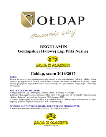 REGULAMIN Gołdapskiej Halowej Ligi Piłki Nożnej Gołdap, sezon 2016/2017 CELE: Celem tej imprezy jest popularyzacja piłki nożnej wśród mieszkańców Gołdapi i okolic, dobra zabawa, propagowanie i rozwój stałych form uczestnictwa miasta w kulturze fizycznej, a tym samym pozytywne zagospodarowanie czasu wolnego oraz prowadzenie aktywnego i zdrowego trybu życia POSTANOWIENIA WSTĘPNE: 1. Organizatorem Ligi Halowej jest Ośrodek Sportu i Rekreacji w Gołdapi 2. Rozgrywki przeprowadzone zostaną w Hali OSiR w Gołdapi przy ul. Partyzantów 31, systemem „każdy z każdym” w okresie od listopada 2016 do marca 2017. 3. Mecze będą rozgrywane w niedzielę w godzinach 10:00 – 15:00 (z wyłączeniem czasu na inne imprezy sportowe organizowane przez OSiR i inne imprezy) SPONSOR GŁÓWNY GOŁDAPSKIEJ HALOWEJ LIGI PIŁKI NOŻNEJ: 1. Głównym sponsorem Gołdapskiej Halowej Ligi Piłki Nożnej jest: PRZEPISY OGÓLNE: 1. Drużyna składa się minimalnie z 5 a maksymalnie z 15 zawodników 2. Na uczestnikach GHLPN spoczywa obowiązek ubezpieczenia się, a organizator nie ponosi żadnej odpowiedzialności za kontuzje,urazy, problemy zdrowotne, itp. zawodników. 3. Drużyny grają w jednakowych strojach z widocznymi numerami na koszulkach. 4. Zawodnicy mogą grać wyłącznie w obuwiu sportowym (halowym). 5. W miarę możliwości technicznych, organizator GHLPN udostępnia drużynom szatnie oraz możliwość korzystania z prysznica. Drużyna ma obowiązek pozostawienia po sobie czystej szatni. Za wszystkie szkody wyrządzone przez zawodników drużyny na terenie KSRHB odpowiada kapitan drużyny. 7. Na kapitanie drużyny spoczywa obowiązek zapoznania zawodników swojej drużyny z przepisami Gołdapskiej Halowej Ligi Piłki Nożnej RBB „JAJA Z MAZUR” PRZEPISY SZCZEGÓŁOWE: 1. Mecz składa się z dwóch równych części po 12 minut każda, z 2 minutową przerwą pomiędzy nimi. 2. Po przerwie drużyny zamieniają się stronami boiska. 3. Drużyny grają po 5 zawodników w tym bramkarz odróżniający się strojem od pozostałych zawodników drużyny. 4. Aby mecz mógł się rozpocząć na boisku musi znajdować się minimum 3 zawodników każdej z drużyn. 5. Walkower orzeka sędzia po upływie 3 minut od przewidzianego czasu rozpoczęcia rozgrywek. 6. Zmiany zawodników są lotne wyłącznie w strefie zmian zawodników. 7. Strefą zmian określony jest obszar przy ławce zawodników rezerwowych drużyny 8. Zmiana zawodników następuje zarówno kiedy piłka jest w grze jak i poza grą, z zachowaniem następujących warunków: a) zawodnik opuszczający boisko musi przekroczyć linię boczną w obrębie strefy zmian b) zawodnik wchodzący na boisko musi uczynić to również w obrębie strefy zmian, ale nie wcześniej niż zawodnik schodzący c) jeżeli zmiana zostanie przeprowadzona nieprawidłowo to gra winna być przerwana, zawodnik wchodzący zostaje napomniany żółtą kartką (2 minuty kary), grę wznawia się rzutem wolnym przyznawanym drużynie przeciwnej z miejsca gdzie była piłka w chwili przerwania gry 9. Piłka z autu wybijana jest nogą. 10. Zawodnik drużyny przeciwnej powinien znajdować się 5 metrów od miejsca wykonywania autu rzutu wolnego i od miejsca wznowienia piłki z rzutu rożnego. 11. Na wykonanie rzutu z autu i rzutu rożnego zawodnik ma 5 sekund. Jeśli czas zostanie przekroczony w przypadku wykonywania rzutu rożnego, drużynie przeciwnej przyznany zostaje rzut wolny z łuku pola rożnego. Jeżeli rzut z autu nie zostanie wykonany w ciągu 5 sekund to wówczas zostaje on powtórzony przez zawodnika drużyny przeciwnej 12. Wszystkie rzuty wolne są bezpośrednie. 13. Gra toczy się do gwizdka sędziego 14. Uderzenie piłki w konstrukcję dachową oznacza rzut wolny dla przeciwnej drużyny wykonywany z koła na środku boiska 15. W lidze mogą brać udział zawodnicy zrzeszeni w klubach piłkarskich V ligi i niższych klas w sezonie 2016/2017 ZMIANY ZAWODNIKÓW: 1. Zawodnik może grać wyłącznie w jednej drużynie danej ligi. 2. W przypadku stwierdzenia faktu udziału w zawodach nie zgłoszonego do składu zawodnika orzeka się walkower oraz karę pieniężną od drużyny w wysokości 100 zł. Brak należytej wpłaty przed pierwszym spotkaniem kolejnej kolejki spowoduje wykluczenie z ligi. KARY: 1. Sędzia może ukarać zawodnika żółtą lub czerwona kartką: a) żółta kartka – zawodnik, który otrzyma dwie żółte kartki w jednym spotkaniu otrzymuje w konsekwencji czerwoną kartkę, zobowiązany jest opuścić boisko oraz dyskwalifikację z gry w kolejnym spotkaniu. b) bezpośrednia czerwona kartka – zawodnik zobowiązany jest opuścić boisko oraz dyskwalifikację z dwóch kolejnych spotkań c) obowiązuje zakaz gry wślizgiem za wyjątkiem bramkarza w polu karnym pod warunkiem ze nie gra lekkomyślnie i przy użyciu nadmiernej siły. d) za przekroczenie tego przepisu zawodnik wykonujący wślizgu upomniany zostaje żółtą kartką (2 minuty kary), sędzia dyktuje rzut wolny bezpośredni, ewentualnie rzut karny w przypadku przewinienia w polu bramkowym e) rzuty wolne bezpośrednie (nie dotyczy rzutu karnego) są kumulowane, za popełnione 5 przewinienie w jednej połowie wykonywany jest rzut karny przedłużony z 9 metrów ( linia przerywana). Za każdy następny rzut wolny bezpośredni w danej połowie zamiast rzutu wolnego dyktowany jest rzut karny przedłużony f) za niesportowe zachowanie np. obraźliwe gesty i słowa zawodnik, może zostać ukarany 2 minutową karą odsunięcia od gry (żółta kartka), bądź całkowicie wykluczony z gry (czerwona kartka) g) za niesportowe zachowanie zawodników (pod wpływem alkoholu, środków odurzających) oraz osób odpowiedzialnych odpowiada cała drużyna. Organizator zastrzega sobie prawo do wykluczenia danej drużyny z rozgrywek bez zwrotu kwoty wpisowego, ani jego części. NAGRODY: * Po zakończeniu wszystkich kolejek 3 najlepsze drużyny zostaną udekorowane pamiątkowymi pucharami, dyplomami