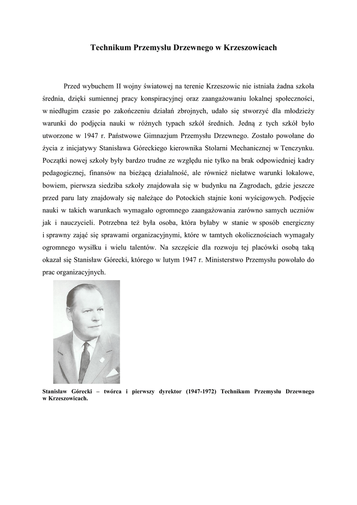 Technikum Przemysłu Drzewnego w Krzeszowicach Przed wybuchem II wojny światowej na terenie Krzeszowic nie istniała żadna szkoła średnia, dzięki sumiennej pracy konspiracyjnej oraz zaangażowaniu lokalnej społeczności, w niedługim czasie po zakończeniu działań zbrojnych, udało się stworzyć dla młodzieży warunki do podjęcia nauki w różnych typach szkół średnich. Jedną z tych szkół było utworzone w 1947 r. Państwowe Gimnazjum Przemysłu Drzewnego. Zostało powołane do życia z inicjatywy Stanisława Góreckiego kierownika Stolarni Mechanicznej w Tenczynku. Początki nowej szkoły były bardzo trudne ze względu nie tylko na brak odpowiedniej kadry pedagogicznej, finansów na bieżącą działalność, ale również niełatwe warunki lokalowe, bowiem, pierwsza siedziba szkoły znajdowała się w budynku na Zagrodach, gdzie jeszcze przed paru laty znajdowały się należące do Potockich stajnie koni wyścigowych. Podjęcie nauki w takich warunkach wymagało ogromnego zaangażowania zarówno samych uczniów jak i nauczycieli. Potrzebna też była osoba, która byłaby w stanie w sposób energiczny i sprawny zająć się sprawami organizacyjnymi, które w tamtych okolicznościach wymagały ogromnego wysiłku i wielu talentów. Na szczęście dla rozwoju tej placówki osobą taką okazał się Stanisław Górecki, którego w lutym 1947 r. Ministerstwo Przemysłu powołało do prac organizacyjnych. Stanisław Górecki – twórca i pierwszy dyrektor (1947-1972) Technikum Przemysłu Drzewnego w Krzeszowicach. W wyniku intensywnych prac remontowych, w czasie których m. in. usunięto okna i drzwi, zbudowano piece i kominy, udało się już we wrześniu 1947 r. umożliwić 22 uczniom rozpoczęcie nauki w Gimnazjum Przemysłu Drzewnego. Byli to chłopcy, w większości wychowankowie miejscowego Państwowego Zakładu Wychowawczo-Naukowego , a wśród nich znalazło się też paru uczniów, z pobliskich miejscowości, którzy musieli codziennie pokonywać nawet do 12 km, by dotrzeć do szkoły. W dniu 13 marca 1948 r. odbyła się uroczystość oficjalnego, urzędowego otwarcia Gimnazjum Przemysłu Drzewnego, które pracowało i rozwijało się od 7 miesięcy. Na uroczystość przybyli przedstawiciele władz szkolnych: Dyrektor Departamentu Szkolnictwa Zawodowego przy Ministerstwie Oświaty, kurator okręgu szkolnictwa krakowskiego Białas, wicekurator inżynier Nowicki, naczelnicy wydziałów: Gruszecki, Białowicz, Bogdanowiczowa oraz wizytatorzy województwa krakowskiego. Oprócz nich pojawili się różni prominenci reprezentujący partie polityczne oraz władze miejscowe. Najważniejszym punktem uroczystości było przemówienie dyrektora Gimnazjum Przemysłu Drzewnego Stanisława Góreckiego, w którym zaznaczył, że: na stajniach koni wyścigowych wyrasta placówka cenna dla nabierającej rozmachu produkcji i dla odbudowy naszego Państwa. Pierwsza siedziba Technikum Przemysłu Drzewnego w Krzeszowicach przy ul. Zagrody (dawna stajnia angielska należąca do rodziny Potockich). Fot. z pierwszej poł. lat 50-tych. Od 1947 r. rozpoczął się dynamiczny rozwój szkoły trwający w zasadzie aż do roku 1974, kiedy to szkoła zakończyła swój samodzielny byt i stała się częścią składową wielkiego tworu, jakim był Zespół Szkół Budowlanych. Prężny rozwój placówki w pierwszych latach jej istnienia był zasługą dyrektora Stanisława Góreckiego, który podczas pierwszego posiedzenia rady pedagogicznej wyznaczył sobie i kadrze nauczycielskiej główne cele i zadania szkoły. Czytając te założenia dowiadujemy się z nich, że cały wysiłek grona nauczycielskiego w pracy z młodzieżą zmierzał do rozbudzenia zamiłowania do zawodu u uczniów pochodzących z różnych środowisk. Z kolei szkoła jako całość miała się zająć wychowaniem, w oparciu o zasady demokratyczne, pełnowartościowego obywatela, dobrego Polaka, zawodowca, rozmiłowanego w swej specjalności, pełnego poczucia własnej godności oraz przygotowanego do spełnienia odpowiedniej roli, jaka mu przypadnie do zrealizowania w Polsce Ludowej. Szkoła jednak od samego początku napotykała na problemy różnego typu. Głównym, który uniemożliwiał jej szybki rozwój, był brak odpowiedniego budynku szkolnego. Jak wspomniano Gimnazjum Przemysłu Drzewnego mieściło się w dawnych stajniach. Jednak budynek ten nie był w stanie sprostać wszystkim wymogom szkolnym, dlatego też uczniowie byli zmuszeni w pierwszych miesiącach nauki do ciągłych wędrówek: na naukę religii do budynku Liceum Ogólnokształcącego, na lekcje gimnastyki do auli Domu Młodzieży, na zagadnienia społeczne do „starego pałacu”. W wyniku braku odpowiednich funduszy dopiero w marcu 1949 r. przystąpiono do dalszej rozbudowy szkoły. Skutkiem tych działań było oddanie do użytku nowego jednopiętrowego budynku, w którym mieściły się sale wykładowe, rysunkowe, świetlica, biuro warsztatowe, kancelaria szkoły, sale robót ręcznych, wykańczalnia i magazyn. Bardzo ważną rolę zarówno z punktu widzenia pedagogicznego jak i wychowawczego odgrywały w życiu i organizacji szkoły warsztaty szkolne, na których młodzież w praktyce uczyła się swojego przyszłego zawodu. Zarówno na terenie samych warsztatów realizując założenia planów dydaktycznych jak i również poza nimi, aby pogłębić wiedzę zawodową uczniów szkoła organizowała wyjazdy na praktyki wakacyjne do różnych ośrodków przemysłu drzewnego w Polsce. Przedmiotem produkcji Państwowego Gimnazjum Przemysłu Drzewnego były wyroby stolarskie, meblowe i galanteryjne. Dzięki zyskom pochodzącym z pracy warsztatów szkolnych dyrekcja mogła pozwolić sobie na dokonanie poważnych inwestycji mających na celu podniesienie infrastruktury szkoły. O tym jak ważna dla funkcjonowania szkoły była prawidłowa praca warsztatów świadczyć mogą liczne sukcesy, które udało się odnieść w tym krótkim okresie czasu, a 