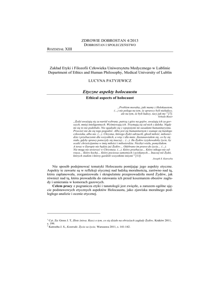 ZDROWIE DOBROSTAN 4/2013 DOBROSTAN I SPOŁECZEŃSTWO ROZDZIAŁ XIII Zakład Etyki i Filozofii Człowieka Uniwersytetu Medycznego w Lublinie Department of Ethics and Human Philosophy, Medical University of Lublin LUCYNA PATYJEWICZ Etyczne aspekty holocaustu Ethical aspects of holocaust „Problem moralny, jaki mamy z Holokaustem, (…) nie polega na tym, że sprawcy byli nieludzcy, ale na tym, że byli ludzcy, tacy jak my”1[7]. Yehuda Bauer „Żydzi uważają się za naród wybrany, patrzą z góry na gojów, uważają ich za gorszych, mniej inteligentnych. Wyśmiewają ich. Trzymają się od nich z daleka. Nigdy mi się to nie podobało. Nie zgadzało się z wpojonymi mi zasadami humanitaryzmu. Przecież nie da się tego pogodzić. Albo jest się humanitarnym i szanuje się każdego człowieka, albo nie. (…). Chrystus, którego Żydzi odrzucili, głosił miłość, miłosierdzie i przebaczenie dla wszystkich, a więc i dla mnie. Zastanawiałem się, co by się stało, gdyby sprawy potoczyły się inaczej… (…). Ilu Żydów ryzykowałoby życie, by ocalić chrześcijanina w imię miłości i miłosierdzia. Niezbyt wielu, pomyślałem. A teraz w Europie nie będzie już Żydów… Odebrano im prawo do życia… (…). Nie mogę nie uwierzyć w Chrystusa. (…). Który przebacza… Który nikogo nie odrzuca… Który kocha… Który pociesza samotnych i uciskanych… Inaczej niż Żydzi, których znałem i którzy gardzili wszystkimi innymi”2[13]. Joseph S. Kutrzeba Nie sposób podejmować tematyki Holocaustu pomijając jego aspekty etyczne. Aspekty te zawarte są w refleksji etycznej nad ludzką moralnością, zarówno nad tą, która zaplanowała, zorganizowała i skrupulatnie przeprowadziła mord Żydów, jak również nad tą, która prowadziła do ratowania ich przed koszmarem obozów zagłady i umierania w komorach gazowych. Celem pracy z pogranicza etyki i tanatologii jest zwięzłe, a zarazem ogólne ujęcie podstawowych etycznych aspektów Holocaustu, jako zjawiska moralnego podległego analizie i ocenie etycznej. Cyt. Za: Gross J. T, Złote żniwa. Rzecz o tym, co się działo na obrzeżach zagłady Żydów, Kraków 2011, s. 199. 2 Kutrzeba J. S., Kontrakt. Życie za życie, Warszawa 2011, s. 141-142. 1 ZDROWIE I DOBROSTAN NR 4 /2013 Dobrostan społeczeństwo 1. HOLOKAUST A ANTYSEMITYZM – PERSPEKTYWA ETNICZNA Pojęcie „holokaust” pochodzi od słowa greckiego „holocaustikós”, które oznacza ofiarę spaloną w całości, tj. całopalną (gr. holos – „cały”, kaustos – „spalony”). Pojęcie to zostało następnie przeniesione do kościelnej łaciny jako termin religijny. „Ponieważ łacina nie ma litery „k”, czyli greckiej kappy, pojęcie to ok. 400 r. po Chrystusie pojawiło się w formie „holocaustum”. Około 1250 r. w jednym z angielskich przekładów Biblii znajdujemy je w formie „holocaust”. (…). W 1933 r. słownik Oxford English Dictionary podaje liczne przykłady użycia słowa „holocaust” także w znaczeniu przenośnym: „pożoga”, „rzeź”, „krwawa łaźnia”, „masakra”, zwłaszcza w czasie wojen. (…). Podczas II wojny światowej wyrażenie to było już używanie na określenie prześladowania i mordowania Żydów. Inne języki je sobie przyswoiły. (…). Wszyscy ( znani niemieccy naukowcy – L.P.) jednogłośnie opowiedzieli się za pisownią „Holokaust”, a Walter Jens celnym zdaniem: >> Kto chce precyzyjnie – i przez efekt wyobcowania objaśniająco! – określić fakt, że miliony ludzi zamieniono w popiół, ten musi pisać holokaust << . (…). Klaus Heller (…) dodaje, że za pisownią „Holokaust” przemawiają nie tylko względy lingwistyczne, lecz także >> etyczno-moralne <<. (…). Mord na Żydach Europy należy do historii niemieckiej. (…). Jeśli Niemcy chcą naprawdę stawić czoło swojej historycznej odpowiedzialności za zbrodnię, powinni traktować pisownię „Holokaust” również jako symboliczny akt przyswajania własnej historii”3[11]. – stwierdza Guido Knopp. W swojej znakomitej książce pt. Holokaust obrazowo przedstawia obiektywną, jak subiektywną (tj. doświadczaną m.in. przez samych Żydów, jak ich oprawców) stronę koszmaru masowej zagłady, poczynając od wyrażanych sugestii antyżydowskich oskarżeń i pogróżek Adolfa Hitlera zawartych w Mein Kampf, poprzez norymberskie ustawy rasowe, konferencję w Wannsee, na której zatwierdzono Holokaust jako „ostateczne rozwiązanie”, deportację ludności żydowskiej z terytorium Rzeszy i krajów przez nią okupowanych, aż po przejęcie obozów koncentracyjnych przez aliantów. Holokaust jako centralnie zaplanowany przez nazistów, zorganizowany i systematycznie przeprowadzany proces zagłady europejskich Żydów jest - z perspektywy etycznej – największym złem ludzkości zainicjowanym przez człowieka, który sam nazywając siebie wilkiem (Wolf) w sposób upiorny zrealizował nieetyczną zasadę T. Hobbes’a „człowiek człowiekowi wilkiem” (homo homini inpus). Prowadzona przez III Rzeszę polityka antysemicka i rasistowska była skierowana przeciw przeciw Żydom, kulturze europejskiej i wartościom ogólnoludzkim. Antysemityzm, jako postawa nieetyczna, niegodziwa (tj. nie godna człowieka), wynika – jak sądzę – z niskiego poziomu intelektualnego i moralnego. Antysemityzm – jak stwierdza J. Bocheński – polega „na demonizacji Żydów i przypisywaniu im wszelkiego zła. Zwolennicy antysemityzmu zwykli są także twierdzić, że Żydzi rządzą światem, że mają jakąś centralę, dążącą do opanowania świata, do zniszczenia naszej cywilizacji itd. Zdarza się też, że przypisuje się też im najzupełniej goło- 3 Knopp G., Holokaust, Warszawa 2011, s. 20, 21. 192 Lucyna Patyjewicz Etyczne aspekty holocaustu słownie rozmaite zbrodnie. Powszechne jest u antysemitów żądanie, by wyeliminować z naszej cywilizacji wszystko, co żydowskie. Że są to haniebne zabobony, powinno b