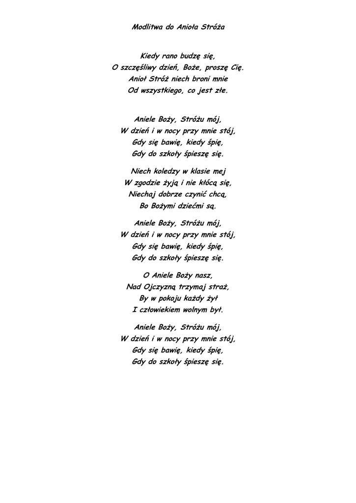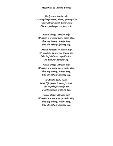 Modlitwa do Anioła Stróża Kiedy rano budzę się, O szczęśliwy dzień, Boże, proszę Cię. Anioł Stróż niech broni mnie Od wszystkiego, co jest złe. Aniele Boży, Stróżu mój, W dzień i w nocy przy mnie stój, Gdy się bawię, kiedy śpię, Gdy do szkoły śpieszę się. Niech koledzy w klasie mej W zgodzie żyją i nie kłócą się, Niechaj dobrze czynić chcą, Bo Bożymi dziećmi są. Aniele Boży, Stróżu mój, W dzień i w nocy przy mnie stój, Gdy się bawię, kiedy śpię, Gdy do szkoły śpieszę się. O Aniele Boży nasz, Nad Ojczyzną trzymaj straż, By w pokoju każdy żył I człowiekiem wolnym był. Aniele Boży, Stróżu mój, W dzień i w nocy przy mnie stój, Gdy się bawię, kiedy śpię, Gdy do szkoły śpieszę się.