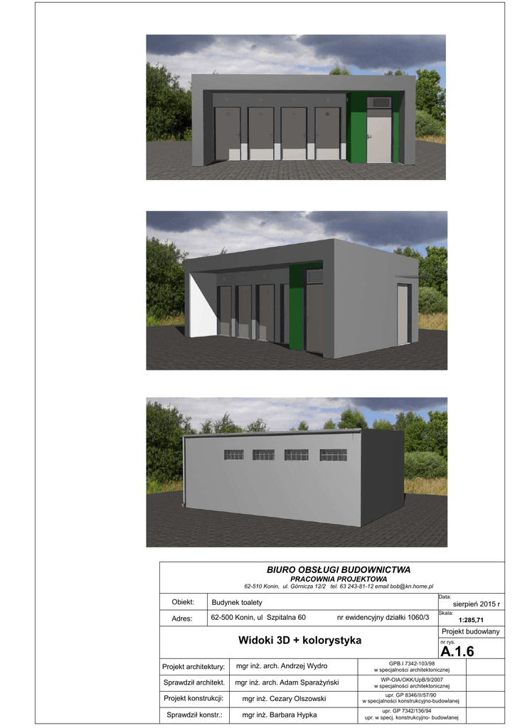 BIURO OBSŁUGI BUDOWNICTWA PRACOWNIA PROJEKTOWA 62-510 Konin, ul. Górnicza 12/2 tel. 63 243-81-12 email [email protected] Obiekt: Adres: Data: Budynek toalety 62-500 Konin, ul Szpitalna 60 sierpień 2015 r nr ewidencyjny działki 1060/3 Skala: 1:285,71 Projekt budowlany Widoki 3D + kolorystyka nr rys. A.1.6 Projekt architektury: mgr inŜ. arch. Andrzej Wydro GPB.I 7342-103/98 w specjalności architektonicznej Sprawdził architekt. mgr inŜ. arch. Adam SparaŜyński WP-OIA/OKK/UpB/9/2007 w specjalności architektonicznej Projekt konstrukcji: Sprawdził konstr.: mgr inŜ. Cezary Olszowski mgr inŜ. Barbara Hypka upr. GP 8346/II/57/90 w specjalności konstrukcyjno-budowlanej upr. GP 7342/136/94 upr. w specj. konstrukcyjno- budowlanej