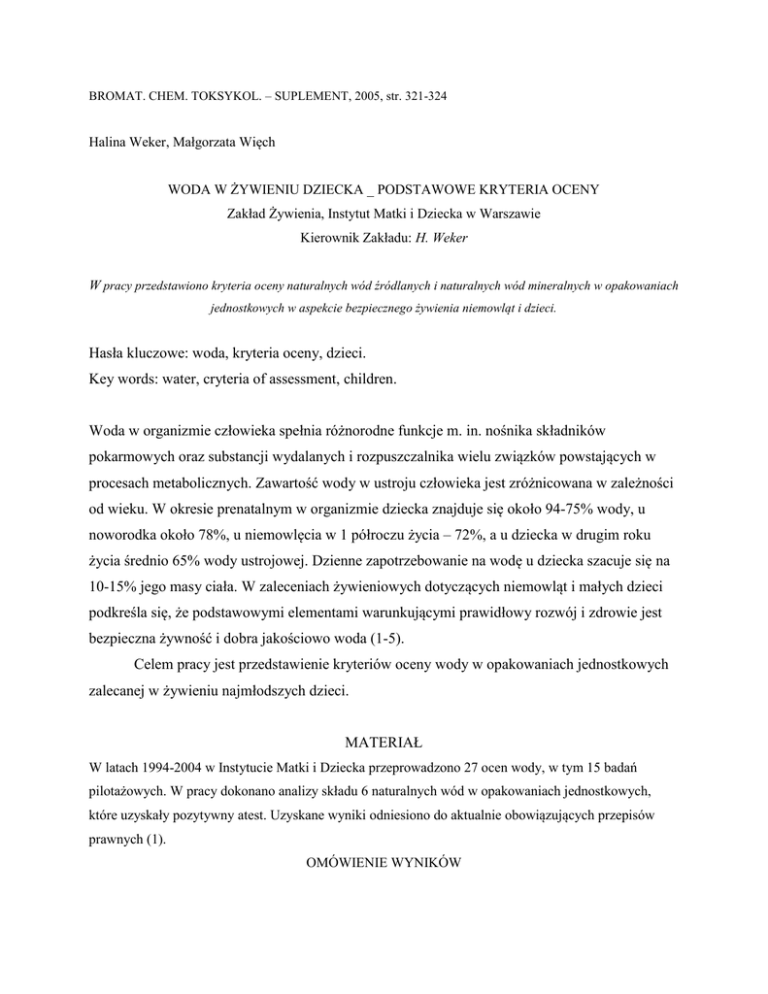 BROMAT. CHEM. TOKSYKOL. – SUPLEMENT, 2005, str. 321-324 Halina Weker, Małgorzata Więch WODA W ŻYWIENIU DZIECKA _ PODSTAWOWE KRYTERIA OCENY Zakład Żywienia, Instytut Matki i Dziecka w Warszawie Kierownik Zakładu: H. Weker W pracy przedstawiono kryteria oceny naturalnych wód źródlanych i naturalnych wód mineralnych w opakowaniach jednostkowych w aspekcie bezpiecznego żywienia niemowląt i dzieci. Hasła kluczowe: woda, kryteria oceny, dzieci. Key words: water, cryteria of assessment, children. Woda w organizmie człowieka spełnia różnorodne funkcje m. in. nośnika składników pokarmowych oraz substancji wydalanych i rozpuszczalnika wielu związków powstających w procesach metabolicznych. Zawartość wody w ustroju człowieka jest zróżnicowana w zależności od wieku. W okresie prenatalnym w organizmie dziecka znajduje się około 94-75% wody, u noworodka około 78%, u niemowlęcia w 1 półroczu życia – 72%, a u dziecka w drugim roku życia średnio 65% wody ustrojowej. Dzienne zapotrzebowanie na wodę u dziecka szacuje się na 10-15% jego masy ciała. W zaleceniach żywieniowych dotyczących niemowląt i małych dzieci podkreśla się, że podstawowymi elementami warunkującymi prawidłowy rozwój i zdrowie jest bezpieczna żywność i dobra jakościowo woda (1-5). Celem pracy jest przedstawienie kryteriów oceny wody w opakowaniach jednostkowych zalecanej w żywieniu najmłodszych dzieci. MATERIAŁ W latach 1994-2004 w Instytucie Matki i Dziecka przeprowadzono 27 ocen wody, w tym 15 badań pilotażowych. W pracy dokonano analizy składu 6 naturalnych wód w opakowaniach jednostkowych, które uzyskały pozytywny atest. Uzyskane wyniki odniesiono do aktualnie obowiązujących przepisów prawnych (1). OMÓWIENIE WYNIKÓW Oceny naturalnych wód w opakowaniach jednostkowych pod względem ich przydatności w żywieniu niemowląt i dzieci prowadzone są w Instytucie Matki i Dziecka przez zespół medycznożywieniowy. Przy opracowywaniu przez zespół założeń dotyczących wody z przeznaczeniem dla najmłodszych dzieci uwzględnione zostały następujące elementy: 1. wysokie zapotrzebowanie u niemowląt na płyny wynikające ze specyfiki wieku rozwojowego, w tym dynamicznego rozwoju tkanek, małej objętości żołądka, niedojrzałości przewodu pokarmowego i układu moczowego, a także słabo wykształconych jeszcze mechanizmów odtruwania, 2. skład i spożycie pokarmu naturalnego jako wzorca fizjologicznego zapotrzebowania na pożywienie, w tym płyny, u niemowląt karmionych piersią, 3. skład mleka początkowego i innych preparatów do żywienia niemowląt niekarmionych piersią. Na podstawie przyjętych założeń ustalono, że podstawowymi kryteriami doboru wody w opakowaniach jednostkowych dla niemowląt i dzieci będą: suma rozpuszczonych składników mineralnych stopień mineralizacji wody zawartość sodu oraz siarczanów wiarygodność producenta/bezpieczeństwo produkcji/systemy zabezpieczające jakość produktu. Z przeprowadzonych ocen wód w opakowaniach jednostkowych 6 rodzajów wody uzyskało atest Instytutu Matki i Dziecka. Wśród sześciu ocenionych rodzajów wody, dwie z nich, zaliczono do naturalnych wód mineralnych, cztery do naturalnych wód źródlanych, niskozmineralizowanych, niskosodowych (tab. 1, 2). W tab. 1 przedstawiono skład naturalnych wód zaopiniowanych pozytywnie i zalecanych do przygotowywania posiłków/potraw dla niemowląt i małych dzieci. Tabela I Wybrane wyniki dużej analizy fizyko-chemicznej naturalnych wód źródlanych w opakowaniach jednostkowych ocenionych w Instytucie Matki i Dziecka Lp. Rodzaj składnika mineralnego Żywiec Dobrawa Nata Aquarel 1. Suma rozpuszczonych składników mineralnych Magnez 185,84 408,66 384,90 519,45 8,18 28,58 13,28 15,80 2. Naturalne wody źródlane [mg/l] Wg IMiDz ≤ 500 dla niemowląt 3. 4. Wapń Sód 27,73 8,00 55,15 1,50 69,40 5,00 5. 6. 7. 8. 9. 10. 11. Potas Wodorowęglany Siarczany Fluorki Jodki Chlorki Kwalifikacja 1,00 0,88 2,50 109,00 286,78 259,40 23,86 16,50 9,26 0,07 0,10 0,27 <0,02 0,00 <0,02 4,60 5,32 5,67 naturalna woda źródlana dla niemowląt i dzieci powyżej 1 roku życia 44,10 60,00 ≤ 20 dla niemowląt 8,75 336,50 <2,00 0,50 <0,02 28,00 naturalna woda źródlana dla dzieci powyżej 1 roku życia Przyjęte kryteria dla naturalnej wody źródlanej są zgodne z obowiązującymi aktualnie przepisami prawa żywnościowego. W tab. 2 zestawiono skład chemiczny naturalnych wód mineralnych z atestem Instytutu w odniesieniu do aktualnych wymagań chemicznej kwalifikacji wody w opakowaniach jednostkowych. Tabela II Wybrane wyniki dużej analizy fizyko-chemicznej naturalnych wód mineralnych w opakowaniach jednostkowych cenionych w Instytucie Matki i Dziecka oraz wymagania chemicznej kwalifikacji wody Lp. Rodzaj składnika mineralnego Nałęczowianka Jurajska Naturalne wody mineralne [mg/l] Wg Rozp. M. Z. z dn. 29.04.2004 r. wg IMiDz 1. Suma rozpuszczonych składników mineralnych 711,67 506,66 2. 3. 4. 5. 6. 7. 8. 9. 10. 11. Magnez Wapń Sód Potas Wodorowęglany Siarczany Fluorki Jodki Chlorki Kwalifikacja <50 - > 1500 (bardzo nisko, nisko-, średnio-, wysokozmineralizowane >50 >150 >200 22,56 32,08 116,71 65,73 13,00 10,20 5,50 3,20 495,76 332,52 >600 3,00 31,00 >200/<20* 0,27 0,30 >1,0** 0,00 0,00 >2,00*** 8,86 12,05 >200 Naturalna woda mineralna dla dzieci powyżej 1 roku życia <1500 ≤20 *Woda przeznaczona dla niemowląt **Woda zawierająca ponad 1,5 mg F/l nie powinna być spożywana przez dzieci poniżej 7 roku życia. ***Powyżej 0,2 mg J/I – informacja o zalecanej dziennej ilości wody do spożycia. Oceniane naturalne wody mineralne można zaliczyć do grupy średniozmineralizowanych. Rozporządzenie Ministra Zdrowia z dnia 29 kwietnia 2004 roku podaje zasady kwalifikacji wód podziemnych, ustala szczególne warunki sanitarne oraz wymagania w zakresie przestrzegania zasad higieny w procesie produkcji i/lub obrocie naturalnymi wodami mineralnymi i naturalny