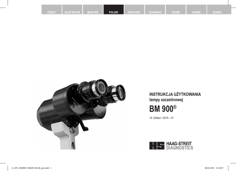 ČESKY БЪЛГАРСКИ MAGYAR POLSKI HRVATSKI ΕΛΛΗΝΙΚΗ SUOMI DANSK NORSK INSTRUKCJA UŻYTKOWANIA lampy szczelinowej BM 900® 14. Edition / 2015 – 01 © HAAG-STREIT AG, 3098 Koeniz, Switzerland – HS-Doc. no. 1500.7200492-04140 – 14. Edition / 2015 – 01 13_IFU_BM900-7200492-04140_pol.indd 1 Nr dokumentu 1500 1500.1400209.04000 1 08.01.2015 15:45:07 NORSK DANSK SUOMI INSTRUKCJA UŻYTKOWANIA lampy szczelinowej BM 900® 14. Edition / 2015 – 01 ΕΛΛΗΝΙΚΗ HRVATSKI POLSKI MAGYAR БЪЛГАРСКИ ČESKY Wstęp Dziękujemy za wybór urządzenia firmy HAAG-STREIT. Dokładne przestrzeganie zasad określonych w niniejszej instrukcji użytkowania zapewni niezawodne i bezproblemowe korzystanie z naszego produktu. Przeznaczenie Urządzenie jest lampą szczelinową ze stereomikroskopem, przeznaczoną do badania przedniego odcinka oka od rogówki do tylnej torebki soczewki. Jest używane w diagnostyce chorób i obrażeń, które dotyczą cech strukturalnych przedniego odcinka oka. Przeciwwskazania Nie są znane żadne bezwzględne przeciwwskazania dla badań z użyciem tego urządzenia. Należy kierować się profesjonalną oceną i ostrożnością. OSTRZEŻENIE! Przed rozpoczęciem użytkowania produktu uważnie przeczytać instrukcję użytkowania. Zawiera ona ważne informacje na temat bezpieczeństwa użytkownika i pacjenta. 2 13_IFU_BM900-7200492-04140_pol.indd 2 © HAAG-STREIT AG, 3098 Koeniz, Switzerland – HS-Doc. no. 1500.7200492-04140 – 14. Edition / 2015 – 01 08.01.2015 15:45:08 ČESKY БЪЛГАРСКИ MAGYAR POLSKI HRVATSKI ΕΛΛΗΝΙΚΗ SUOMI DANSK NORSK Spis treści 1. 1.1 1.2 1.3 1.4 1.5 1.6 1.7 1.8 1.9 Bezpieczeństwo ...........................................................................4 Zastosowania urządzenia..................................................................................................4 Warunki otoczenia.............................................................................................................4 Wysyłka i rozpakowywanie................................................................................................4 Ostrzeżenia dotyczące instalacji ......................................................................................4 Obsługa, otoczenie............................................................................................................4 Szkodliwość światła...........................................................................................................5 Dezynfekcja.......................................................................................................................5 Gwarancja oraz odpowiedzialność cywilna producenta....................................................5 Symbole.............................................................................................................................5 8Konserwacja...............................................................................10 8.1 8.2 8.3 8.4 8.5 8.6 A. Serwisowanie..................................................................................................................10 Czyszczenie....................................................................................................................10 Czyszczenie płyty przesuwnej i prowadnic zębatych......................................................10 Czyszczenie osi rolkowej.................................................................................................10 Wymiana zwierciadła oświetleniowego...........................................................................10 Pokrowiec........................................................................................................................10 Dodatek.......................................................................................10 A.1. Akcesoria i części zamienne...........................................................................................10 Wstęp.............................................................................................6 B Przepisy prawa...........................................................................11 2.1 Przegląd.............................................................................................................................6 3 Montaż i instalacja urządzenia....................................................7 C. Klasyfikacja ................................................................................11 D.Utylizacja.....................................................................................11 2. 3.1 3.2 3.3 Mikroskop i oświetlenie......................................................................................................7 Zasilacz..............................................................................................................................7 Regulacja swobody ruchu regulatora szczeliny................................................................7 4. Używanie urządzenia...................................................................7 4.1 Włączanie urządzenia.......................................................................................................7 5. Obsługa.........................................................................................7 5.1 5.2 5.3 5.4 5.5 Regulacja okularów...........................................................................................................7 Przygotowywanie pacjenta................................................................................................7 Obsługa instrumentu.........................................................................................................7 Ustawianie filtrów i przesłon .............................................................................................9 Mikroskop i okular..............................................................................................................9 6. Wyłączanie.................