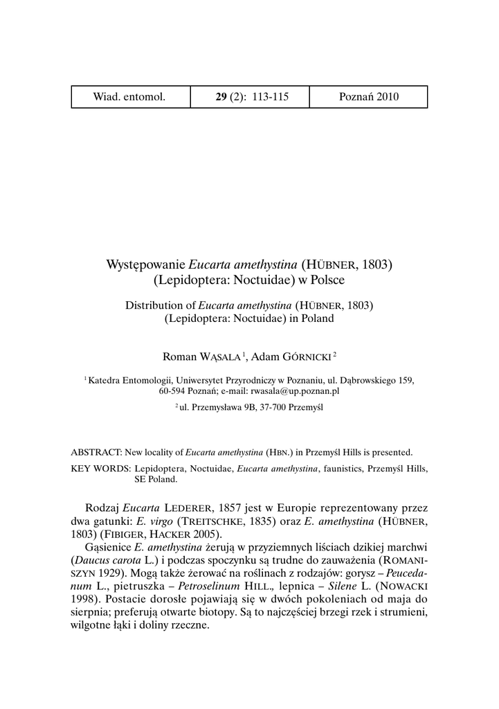Wiad. entomol. 29 (2): 113-115 Poznań 2010 Występowanie Eucarta amethystina (HÜBNER, 1803) (Lepidoptera: Noctuidae) w Polsce Distribution of Eucarta amethystina (HÜBNER, 1803) (Lepidoptera: Noctuidae) in Poland Roman WĄSALA 1, Adam GÓRNICKI 2 1 Katedra Entomologii, Uniwersytet Przyrodniczy w Poznaniu, ul. Dąbrowskiego 159, 60-594 Poznań; e-mail: [email protected] 2 ul. Przemysława 9B, 37-700 Przemyśl ABSTRACT: New locality of Eucarta amethystina (HBN.) in Przemyśl Hills is presented. KEY WORDS: Lepidoptera, Noctuidae, Eucarta amethystina, faunistics, Przemyśl Hills, SE Poland. Rodzaj Eucarta LEDERER, 1857 jest w Europie reprezentowany przez dwa gatunki: E. virgo (TREITSCHKE, 1835) oraz E. amethystina (HÜBNER, 1803) (FIBIGER, HACKER 2005). Gąsienice E. amethystina żerują w przyziemnych liściach dzikiej marchwi (Daucus carota L.) i podczas spoczynku są trudne do zauważenia (R OMANISZYN 1929). Mogą także żerować na roślinach z rodzajów: gorysz – Peucedanum L., pietruszka – Petroselinum HILL ., lepnica – Silene L. (NOWACKI 1998). Postacie dorosłe pojawiają się w dwóch pokoleniach od maja do sierpnia; preferują otwarte biotopy. Są to najczęściej brzegi rzek i strumieni, wilgotne łąki i doliny rzeczne. 114 R. WĄSALA, A. GÓRNICKI Podczas badań prowadzonych na terenie Pogórza Przemyskiego został odłowiony jeden okaz Eucarta amethystina: – Makowa (UTM: FA20), 14 VII 2002 – 1&, leg. A. GÓRNICKI, w środowisku murawy kserotermicznej, odległej o 200–300 m od najbliższego cieku wodnego. Odłowiony gatunek wykazywany był z Polski rzadko. Wcześniej znany był z dwóch województw: dolnośląskiego oraz podkarpackiego (BUSZKO, NOWACKI 2000). W XIX wieku stwierdzony został na południowym-zachodzie ++ ? + + o Ryc. Stanowiska Encarta amethystina (HBN.) w Polsce: + – stanowiska historyczne, – stanowisko po roku 2000, ? – stanowisko wątpliwe Fig. Localities of Encarta amethystina (HBN.) in Poland: + – historic localities, – locality after 2000, ? – doubtful locality WYSTĘPOWANIE EUCARTA AMETHYSTINA W POLSCE 115 kraju, w Legnicy i w Prochowicach. Dane dotyczące okazów z Ziemi Kłodzkiej są niepewne (WOLF 1935–1944). Na wschodzie Polski był wykazany w roku 1957 z Pogórza Bieszczadzkiego, z miejscowości Rabe koło Baligrodu oraz wcześniej z Olchowej koło Leska (BIELEWICZ 1973). Na mapce (Ryc.) przedstawiono wszystkie znane stanowiska występowania w Polsce Eucarta amethystina. SUMMARY During field research in Przemyśl Hills a single specimen of Eucarta amethystina (HBN.) was collected. Previous data on the occurrence of this species in Poland are discussed. All known localities are presented on the map. PIŚMIENNICTWO BIELEWICZ M. 1973: Motyle Bieszczadów Zachodnich i Pogórza Przemyskiego, cz. I tzw. Macrolepidoptera. Roczn. Muz. Górnośl., Przyroda, Bytom, 7: 1-170. BUSZKO J., NOWACKI J. 2000: The Lepidoptera of Poland, a distributional checklist. Pol. entomol. Monogr., Poznań – Toruń, 1: 1-178. FIBIGER M., HACKER H. 2005: Systematic List of Noctuoidea of Europe (Notodontidae, Nolidae, Arctiidae, Lymantridae, Erebidae, Micronoctuidae, and Noctuidae). Esperiana, 11: 93-205. NOWACKI J. 1998: The Noctuids (Lepidoptera, Noctuidae) of Central Europe. Bratislava. 51 ss. ROMANISZYN J., SCHILLE F. 1929: Fauna motyli Polski. I. Prace monogr. Kom. Fizjogr. PAU, Kraków, 6: 1-552. WOLF P. 1935–1944: Die Großschmeterlinge Schlesiens. (2). Breslau: 161-344.