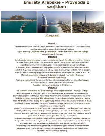 Emiraty Arabskie - Przygoda z szejkiem Program DZIEO 1 Zbiórka w Warszawie, lotnisko Okęcie, stanowisko odpraw Rainbow Tours. Aktualne rozkłady prosimy sprawdzad na www.rainbowtours.pl/rozklady Przylot do Dubaju, odprawa celno - paszportowa. Transfer do hotelu w okolicach Dubaju, zakwaterowanie i nocleg. DZIEO 2 Śniadanie. Zwiedzanie rozpoczniemy od znajdującego się zaledwie 20 minut jazdy od Dubaju Emiratu Sharjah, kulturalnej stolicy Emiratów, zwanej „Perłą Zatoki”. Miasto to pozostało najbardziej tradycyjnym emiratem, gdzie ściśle przestrzega się prawa islamskiego. Zobaczymy jeden z największych i najpiękniejszych meczetów w Zjednoczonych Emiratach Arabskich King Faisal Mosque, następnie udamy się do zbudowanego w 1820r. Fort of Sharjah, dawnej siedziby rodziny panującej oraz odwiedzimy dwa słynne rynki tzw. souki: Al Arsa i Al Markazi, znane z niepowtarzalnych dywanów, biżuterii i wyrobów rękodzieła. Czas wolny na zwiedzanie i zakupy. Następnie przejedziemy do muzeum Heritage z interesującymi zbiorami przedstawiającymi tradycyjny styl życia i rozwój cywilizacji tego regionu. Powrót do hotelu w Dubaju, czas wolny i nocleg. DZIEO 3 Po śniadaniu całodniowe zwiedzanie Dubaju, które rozpoczniemy od „ Nowego” Dubaju mieszczącego się w okolicach gigantycznych wieżowców mieszkaniowych - Dubai Marina (największego portu jachtowego na świecie). Panoramiczne zwiedzanie wyspy w kształcie palmy The Palm Jumeirah oraz najbardziej luksusowego 7 -gwiazdkowego hotelu na świecie - Burj Al Arab. Medinat Jumeirah - zwany Wenecją Dubaju przeniesie nas w bajkowy świat arabskiej magii. Tutaj także powstał największy na świecie kompleks zimowy pod dachem, gdzie pada sztuczny śnieg i można spotkad pingwiny. Kolejno przemieścimy się do najstarszej części miasta Bastakiya z charakterystycznymi wieżami wiatrów, zobaczymy Muzeum Dubaju, pokazujące tempo rozwoju i metamorfozy jaką doznało miasto po odkryciu złóż ropy. Po zwiedzaniu przeprawimy się abrą tradycyjną taksówką wodną) przez kanał Dubai Creek na najbardziej znany w mieście targ przypraw. W drodze powrotnej odwiedzimy słynny Gold Souk, słynący z wyrobów złotniczych. Przejazd do dzielnicy wytwornych rezydencji i pałaców, to tutaj zlokalizowany jest Burj Dubaj, wieżowiec, który już jest najwyższą budowlą jaką kiedykolwiek wzniósł człowiek. Zakooczymy nasz dzieo zapierającym dech pokazem taoczących fontann. Strumienie wody wybijające się na 70m do góry w rytm muzyki i gry świateł. Wrażenia nie do powtórzenia! Powrót do hotelu w Dubaju na nocleg. DZIEO 4 Po śniadaniu wykwaterowanie z hotelu i przejazd do Abu Dabi, na zwiedzanie stolicy i głównego miasta ZEA położonego na przybrzeżnej wyspie o tej samej nazwie. Po drodze przejedziemy obok Jebel Ali port, stanowiącego bramę wjazdową do Abu Dabi. Następnie zobaczymy trzeci co do wielkości na świecie meczet Szejka Zayeda. Trzeba dodad, że budowla ta nie ma sobie równych pod względem kolorystyki, piękna, uroku i rozmachu. Później odwiedzimy Centrum Rękodzielnictwa Żeoskiego, gdzie będziemy podziwiad zręcznośd i umiejętności miejscowych kobiet podczas tworzenia tradycyjnych wyrobów. Przejedziemy promenadą Corniche do falochronu, skąd można podziwiad wspaniałą panoramę Zatoki. Następnie odwiedźmy Emirates Palace, kolejny 7 gwiazdkowy hotel kapiący złotem i luksusem. Najważniejszą atrakcją tego hotelu jest zwiedzanie wystawy przyszłości, czyli makiety budynków które wkrótce powstaną i będzie można odwiedzad je „na żywo”. Uchylając rąbka tajemnicy, w planach władz Abu Dhabi jest budowa kopii paryskiego Louvru, większego i piękniejszego od oryginału!. Dzieo zakooczymy podróżą do Al Ain, nazywanego miastem-ogrodem, należącego do Emiratu Abu Dhabi. Dotrzemy tam pokonując fascynującą, ciągle zmieniającą się pustynię, która rozciąga się u podnóży gór Hajar. Zakwaterowanie w hotelu w Al Ain. Czas wolny i nocleg. DZIEO 5 Po śniadaniu, wykwaterowanie i zwiedzanie miasta. Al Ain to piękna, wiecznie zielona oaza, pełna kwiatów i egzotycznej roślinności. Zobaczymy naturalną oazę, wjedziemy na najwyższy szczyt Emiratów - Jebel Hafeet. Jeśli czas na to pozwoli odwiedzimy targ wielbłądów. I wyruszymy dalej do kolejnego bajecznego Emiratu Fujeirah, jedynego z siedmiu Emiratów położonego nad Oceanem Indyjskim. Właśnie tu spędzimy kolejny dzieo na plażowaniu i relaksie. Zakwaterowanie w hotelu w Fujeirah. DZIEO 6 Czas na plażowanie, kąpiele morskie i słoneczne w Fujeirah. DZIEO 7 Śniadanie i wykwaterowanie z hotelu. Przejazd do Dubaju, po drodze zwiedzanie Fujairah, m.in.: Al Badiyah- najstarszy meczet w Zjednoczonych Emiratach, przystanek na zwiedzanie odrestaurowanego fortu. Przed powrotem do Dubaju ostatni przystanek w oazie przy starej cytadeli Bithnah, czas wolny na spacer po „Piątkowym Targu” w Masafi. Przyjazd do Dubaju do centrum handlowego, gdzie będzie można zrobid ostatnie zakupy, wypid kawę i cieszyd się nocnymi widokami miasta. Zakwaterowanie w hotelu w Dubaju, nocleg DZIEO 8 Śniadanie i wykwaterowanie z hotelu ----TRANSFER DO WYBRANEGO HOTELU Świadczenia Cena obejmuje: opłaty lotniskowe, przelot samolotem, zakwaterowanie w hotelach wg programu, wyżywienie: śniadania a za dopłatą obiadokolacje, obsługę polskiego przedstawiciela podczas odprawy na lotnisku, opiekę polskojęzycznego pilota podczas objazdu, program turystyczny j.w. oraz ubezpieczenie TU Europa - wersja standard (NNW, KL i bagaż). Cena nie obejmuje: opłat wizowych (jednokrotne wizowanie w Polsce płatne w PLN opłata jak w cenniku), obsługi lokalnych przewodników, biletów wstępu (razem ok.110 USD od osoby, płatne obligatoryjnie na miejscu) oraz napiwków dla obsługi i innych wydatków osobistych. Wizy - do uzyskania wizy potrzebna jest zeskanowywana (kolorowa kopia głównej strony z paszportu oraz kolorowa fotografia paszportow