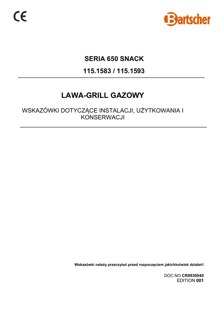 SERIA 650 SNACK 115.1583 / 115.1593 LAWA-GRILL GAZOWY WSKAZÓWKI DOTYCZĄCE INSTALACJI, UŻYTKOWANIA I KONSERWACJI Wskazówki należy przeczytać przed rozpoczęciem jakichkolwiek działań! DOC.NO CR0930040 EDITION 001 SCHEMAT INSTALACYJNY WYMIARY w mm GPL64G 6NGL/G400 OGPL64G GPL68G OGPL68G EGL62T 6NGL/G800 EGL64T * * Legenda G Przyłącze gazowe EN 10226-1, R 1/2; EN ISO 228-1 G 1/2 (DK) 1 DANE TECHNICZNE T1 Dysze i ustawienia Kraj AT - BE - BG - CH - CZ - DE DK - EE - ES - FI - FR - GB GR - HR - IE - IT - LT - LU LV - NO - PL – PT - RO - SE SI - SK - TR Gaz G20 G20/G25 20 20/25 DE G25 20 NL G25 25 HU G20 25 HU G25.1 25 BE - BG – CY - CZ - DK - EE ES - FI - FR - GB - GR - HR HU - IE - IT - LT - LU - LV MT - NL - NO-PT - RO - SE SI – SK - TR G30/G31 28-30/37 28-30 PL G30/G31 37 AT-CH-DE-HU G30/G31 50 IT-CH-SE-DK G110 8 SE G120 8 UM: Um: P: A: Pa: reg 2 Dysza MAX Dysza MIN Palnik zapłonowy Otworzyć pierścień powietrzny Ciśnienie przyłączeniowe Ustawione GPL64G GPL68G EGL62T EGL64T OGPL64G OGPL68G 6NGL/G400 6NGL/G800 UM P A (mm) Um 205 27 0 140 205 27 0 140 205 27 0 140 205 27 0 140 UM P A (mm) Um UM P A (mm) Um UM P A (mm) Um UM P A (mm) Um UM P A (mm) Um UM P A (mm) Um UM P A (mm) Um UM P A (mm) Um UM P A (mm) Um 220 27 0 140 205 27 0 140 190 27 0 140 220 27 0 140 130 14 0 90 125 14 0 90 115 14 0 90 480 50 0 reg 420 50 0 reg 220 27 0 140 205 27 0 140 190 27 0 140 220 27 0 140 130 14 0 90 125 14 0 90 115 14 0 90 480 50 0 reg 420 50 0 reg 220 27 0 140 205 27 0 140 190 27 0 140 220 27 0 140 130 14 0 90 125 14 0 90 115 14 0 90 480 50 0 reg 420 50 0 reg 220 27 0 140 205 27 0 140 190 27 0 140 220 27 0 140 130 14 0 90 125 14 0 90 115 14 0 90 480 50 0 reg 420 50 0 reg Pa (mbar) DANE TECHNICZNE T2 Kategorie i ciśnienie Ciśnienie przyłączeniowe Paese – Kraj - Country – Pays - País Kategoria LU; PL NO NL LU NO; NL; CY; MT PL I2E I2H I2L I3+ I3B/P I3B/P BE; FR II2E+3+ DE I2ELL3B/P ES; GB; GR; IE; IT; PT; SK II2H3+ FI; BG; EE; LV;LT; CZ; SI; TR; HR; RO II2H3B/P AT; CH II2H3B/P HU II2HS3B/P HU II2HS3B/P SE III1ab2H3B/P DK III1a2H3B/P IT;CH II1a2H Gaz G20 G20 G25 G30/G31 G30/G31 G30/G31 G20/G25 G30/G31 G20 G25 G30/G31 G20 G30/G31 G20 G30/G31 G20 G30/G31 G20 G25.1 G30/G31 G20 G25.1 G30/G31 G20 G30/G31 G110 G120 G20 G30/G31 G110 G20 G110 Neen. Min. Max. 20 20 25 28-30/37 28-30 37 20/25 28-30/37 20 20 50 20 28-30/37 20 28-30 20 50 25 25 28-30 25 25 50 20 28-30 8 8 20 28-30 8 20 8 17 17 20 20/25 25 25 17 20/25 17 18 42,5 17 20/25 17 25 17 42,5 18 18 25 18 18 42,5 17 25 6 6 17 25 6 17 6 25 25 30 35/45 35 45 25/30 35/45 25 25 57,5 25 35/45 25 35 25 57,5 33 33 35 33 33 57,5 25 35 15 15 25 35 15 25 15 3 Modele B EGL62T EGL64T Modele A GPL64G GPL 68G OGPL68G OGPL64G Modele C 6NGL/G800 6NGL/G400 Modele D 800 400 mm Szerokość 14 7 kW 1,48 0,74 m 3/h 1,72 0,86 m 3/h 1,72 0,86 m 3/h 1,48 0,74 m 3/h 1,72 0,86 m 3/h (25) G25.1 3,61 1,81 m 3/h 3,21 1,61 m 3/h 1,10 0,55 kg/h 1,10 0,55 kg/h 1,10 0,55 kg/h G110(8) G120(8) G30(29) G30(37) G30(50) Całkowite zużycie gazu G20 (20) G25(25) G25(20) G20(25) Dane techniczne urządzeń gazowych T3 DANE TECHNICZNE 4 RYS. 5 INFORMACJE OGÓLNE ...................................................................................................................................... 7 1 DANE URZĄDZENIA ................................................................................................................................ 7 2 WSKAZÓWKI OGÓLNE:.......................................................................................................................... 7 WSKAZÓWKI DLA INSTALATORA .......................................................................................................... 7 WSKAZÓWKI DLA UŻYTKOWNIKA ........................................................................................................ 7 WSKAZÓWKI DLA KONSERWATORA .................................................................................................... 7 WSKAZÓWKI DOTYCZĄCE CZYSZCZENIA .......................................................................................... 7 3 UTYLIZACJA OPAKOWANIA I URZĄDZENIA ....................................................................................... 7 INSTRUKCJE INSTALACYJNE ................................................................................................................ 8 WSKAZÓWKI DLA INSTALATORA .......................................................................................................... 8 4 ODNOŚNE NORMY I PRZEPISY ............................................................................................................. 8 5 ROZPAKOWANIE .................................................................................................................................... 8 6 USTAWIENIE URZĄDZENIA ................................................................................................................... 8 7 SYSTEM ODPROWADZANIA WYZIEWÓW............................................................................................ 8 8 PRZYŁĄCZA ............................................................................................................................................. 8 9 LAWA-GRILL GAZOWY .......................................................................................................................... 9 10 URUCHOMIENIE ...................................................................................................................................... 9 INSTRUKCJE UŻYTKOWANIA ................................................................................................................ 9 WSKAZÓWKI DLA UŻYTKOWNIKA ........................................................................................................ 9 11 USTAWIENIE RUSZTÓW......................................................................................................................... 9 12 UŻYTKOWANIE LAWA-GRILLA GAZOWEGO .............................
