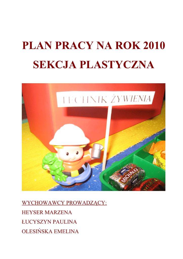 PLAN PRACY NA ROK 2010 SEKCJA PLASTYCZNA WYCHOWAWCY PROWADZĄCY: HEYSER MARZENA ŁUCYSZYN PAULINA OLESIŃSKA EMELINA CELE OGÓLNE: • Rozwijanie zainteresowań i wyobraźni twórczej • Wyrabianie umiejętności współpracy z grupą • Aktywizowanie grupy • Tworzenie przyjaznej atmosfery • Rozwijanie umiejętności szacunku i tolerancji • Odkrywanie talentów • Pożyteczne wykorzystywanie czasu wolnego • Integrowanie z innymi wychowankami • Kształtowanie estetyki wykonywania prac • Dbanie o porządek w miejscu pracy • Rozwijanie umiejętności pozytywnego kontaktu emocjonalnego • Kształtowanie wytrwałości w trakcie wykonywania prac plastycznych • Poznawanie różnych technik plastycznych • Mobilizowanie do uczestnictwa w różnych konkursach plastycznych CELE SZCZEGÓŁOWE: • Doskonalenie sprawności manualnej • Zwolnienie napięcia mięśniowego • Rozwijanie koncentracji uwagi • Wyrabianie precyzji i płynności ruchowej • Wyciszanie pobudzenia psychoruchowego • Rozładowywanie napięć i stanów emocjonalnych • Kształtowanie oszczędnego gospodarowania materiałów TECHNIKI: • Orgiami • Zdobnictwo artystyczne • Malowanie farbami • Malowanie kredkami • Malowanie pisakami • Zdobnictwo spożywcze • Masa solna • Modelowanie plasteliną • Dekoracje okolicznościowe • Wydzieranka • Wyklejanka KONKURSY: • Najzabawniejsza maska karnawałowa • Najładniejsza kartka wielkanocna • Wakacyjna przygoda przelana na papier – technika dowolna • Malowniczy krajobraz zimowy PROPOZYCJE TEMATYCZNE ZAJĘĆ: STYCZEŃ • Laurki z okazji Dnia Babci i Dziadka • Zimowe krajobrazy • Kulig LUTY • Kartki walentynkowe • Makaronowe cuda – zdobnictwo artystyczne • Kubuś Puchatek i przyjaciele MARZEC • Kwiaty z bibuły na Dzień Kobiet • Dekoracje wielkanocne (kartki, pisanki, itp.) • Pani wiosna KWIECIEŃ • Anioły z masy solnej • Wiosna wokół nas • Moje miasto nocą MAJ • Laurki i serca na Dzień Matki • Zwierzaki z orgiami • Majowa łąka pełna kwiatów CZERWEC • Świat widziany oczami dziecka • Ramki do zdjęć – pamiątki na Dzień Ojca • Wymarzone wakacje LIPIEC • Letnie krajobrazy – złociste, zbożowe pola • Wakacyjne podróże, te małe i te duże • Wakacje nad jeziorem SIERPIEŃ • Piaskowe krajobrazy – nadmorskie wydmy • Owocowe sady • Letnie wędrówki WRZESIEŃ • Dary jesiennego lasu • Ludziki z kasztanów • Grzybobranie PAŹDZIERNIK • Laurki na Dzień Nauczyciela • Mój ulubiony bohater z kreskówki • Deszcz za oknem LISTOPAD • Zwierzęta z Afryki • Dzień Niepodległości • Bukiety z liści GRUDZIEŃ • Kartki na Boże Narodzenie • Stroiki świąteczne • Ozdoby choinkowe