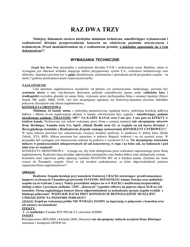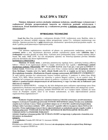 RAZ DWA TRZY Niniejszy dokument zawiera niezbędne minimum techniczne, umożliwiające wykonawcom i realizatorowi dźwięku przeprowadzenie koncertu na właściwym poziomie artystycznym i technicznym. Przed skontaktowaniem się z realizatorem prosimy o dokładne zapoznanie się z tym dokumentem!!! WYMAGANIA TECHNICZNE Zespół Raz Dwa Trzy przyjeżdża z realizatorem dźwięku F.O.H i technicznym sceny Backline, mimo to wymagana jest obecność technika znającego dobrze przygotowany system P.A., realizatora monitorowego oraz elektryka. Aparatura powinna być w pełni zainstalowana, uruchomiona i sprawdzona przed przyjazdem zespołu – na około 2 godziny przed planowanym rozpoczęciem próby. NAGŁOŚNIENIE Cała aparatura nagłośnieniowa niezależnie od pleneru czy pomieszczenia zamkniętego, powinna być systemem stereo o min. trój-drożnym aktywnym podziale częstotliwości pasma audio (oddzielne basy i środkogórki)-wszystkie głośniki tej samej firmy, wykonane przez profesjonalną firmę o uznanej reputacji (Meyer Sound, HK audio, D&B, EAW, etc) (nie akceptujemy aparatury nie firmowej).Aparatura powinna dokładnie pokrywać dźwiękiem cały obszar nagłośnieniowy. KONSOLETA FRONTOWA Minimum 24 kanały mono, z podwójną parametryczną regulacją barwy, podwójną korekcją półkową hi&low i filtrem lo-cut regulowanym płynnie w kanale, odwróceniem fazy sygnału i umożliwiający podanie niezależnego zasilania "PHANTOM +48V" NA KAŻDY KANAŁ oraz 5 aux pre, 3 aux post na EFEKTY w każdym kanale. Preferowany jest mikser wykonany przez firmę o uznanej reputacji (nie akceptujemy mixerów firmy Berhinger, Yamaha seria GA, Spirit ,Allen& Health seria GL ze względu na ich barwę dźwięku! ) Bezwzględnego kontaktu z Realizatorem Zespołu wymaga zastosowanie KONSOLETY CYFROWEJ!!! W sumę miksera powinien być zainsertowany tercjowy korektor graficzny 31 punktowy b. dobrej klasy (Klark Teknik, XTA, BSS). Mikser powinien być ustawiony w połowie długości widowni i na osi symetrii sceny. W przypadku hal wymagane jest umieszczenie miksera na podeście o wysokości 0,2 m. Nie akceptujemy ustawienia miksera w pomieszczeniach odseparowanych od sali koncertowej, w rogu i na boku sali, na balkonach i pod nimi oraz we wnękach! KONSOLETA MONITOROWA – wymaga się, aby była obsługiwana przez realizatora zapewnionego przez firmę nagłośnieniową. Realizator musi posiadać odpowiednie umiejętności oraz bardzo dobrze znać obsługiwany system. Konsoleta musi zapewniać pełną separację zasilania PHANTOM 48V na w każdym kanale. Zasilanie nie może wracać do Preampów zespołu. Grozi to ich trwałym uszkodzeniem, za które odpowiedzialność poniesie organizator/firma nagłośnieniowa!!! UWAGA! Realizator Zespołu instaluje przy konsolecie frontowej 2 RACKI zawierające: przedwzmacniacze lampowe (wybranych 5 kanałów),przetwornik SYSTEMU DOUSZNEGO Adama Nowaka oraz multiefekt zespołu (są to wybrane 2 auxy). Należy przewidzieć miejsce na w/w RACKI z możliwością bezpośredniej obsługi a także 2 przyłącza zasilania ~230V. „Rozszycie” sygnałów odbywa się poprzez złącza XLR na tyle konsolety. Firma nagłaśniająca koncert bierze odpowiedzialność za uszkodzenia sprzętu zespołu wynikłe z błędnego połączenia! WSZELKIE RACKI PRZY KONSOLECIE BEZWZGLĘDNIE MUSZĄ BYĆ UMIESZCZONE NA POZIOMIE PODŁOGI!!! UWAGA! Zespół po wykonanej próbie NIE WYRAŻA ZGODY na ingerencję w połączenia z konsoletą oraz ich nastawy na konsolecie! EFEKTY 2 szt.multiefekt (Yamaha SPX 990 lub T.C.electronic M2000) INSERT 8 kompresorów (BSS,DBX ) 4 bramki (BSS, Drawmer) nie akceptujemy żadnych urządzeń firmy Behringer minimum 1 kompresor DESER’em INNE Dwustronny słuchawkowy interkom scena-konsoleta, CD przy stole przodowym, oświetlenie konsolety i efektów OKABLOWANIE I DYSTRYBUCJA SYGNAŁÓW: Wszystkie połączenia sygnałów, powinny być wykonane w sposób symetryczny, przy użyciu kabli wyprodukowanych przez firmę o uznanej reputacji oraz złączy typu XLR. Połączenie miksera ze sceną powinno być wykonane kablem wieloparowym, zakończonym na scenie stage boxem z gniazdami typu XLR. Konfigurację podłączeń należy wykonać tak, aby zasilania mikrofonów PHANTOM +48V były podawane z konsolety frontowej, a konsoleta monitorowa posiadała SEPAROWANĄ masę sygnałów!!! ZASILANIE z sieci energetycznej 3 fazowej 5 przewodowej w układzie TN-S: Cały system ( aparatura nagłośnieniowa + konsoleta frontowa + sprzęt muzyków) musi być zasilany, zgodnie z PN-IEC-60364 napięcie 230V/400V(tolerancja +/-5%) częstotliwość 50Hz, z tego samego źródła umożliwiającego odpowiedni pobór mocy – adekwatnie do poboru zainstalowanej aparatury. Zarówno w przypadku zasilania jednofazowego, jak też i trójfazowego, bezwzględnie wymagana jest instalacja z dodatkowym przewodem ochronnym. Dla zasilania z jednej fazy jest to: faza, zero robocze i ziemia. Dla trójfazowego: trzy fazy, zero robocze i ziemia. Do zasilenia sprzętu muzyków potrzebne są na scenie cztery punkty zasilania, zabezpieczone po 16 A każdy. Rozmieszczenie przyłączy zaznaczone jest na planie sceny. Urządzenia zasilające: kable, piony, rozdzielnie i podrozdzielnie, muszą posiadać aktualne atesty, dopuszczające je do eksploatacji!!! Firma zapewniająca nagłośnienie i zasilanie sprzętu wykonawców, bierze na siebie całkowitą odpowiedzialność za bezpieczeństwo elektryczne wykonawców, realizatorów i techników zespołu oraz ich sprzętu podczas prób i koncertu. Odłączenie zasilania sceny i konsolety frontowej nastąpić może po demontażu sprzętu zespołuTYLKO ZA ZGODĄ TECHNIKA SCENY! MONITORY 5 szt. jednakowy odsłuch podłogowy skośny (M-1, M-2, M-3,M-4) 12”dół 2”góra pełno pasmowy (min 300 W) - 1 x odsłuch perkusyjny (M-5) Najlepiej zestaw bas 1 x18” i środkogórka 12”+2” w podzielonym paśmie (razem min 600 W) Preferujemy: MeyerSound, HK audio,EAW, D&B. Nie 