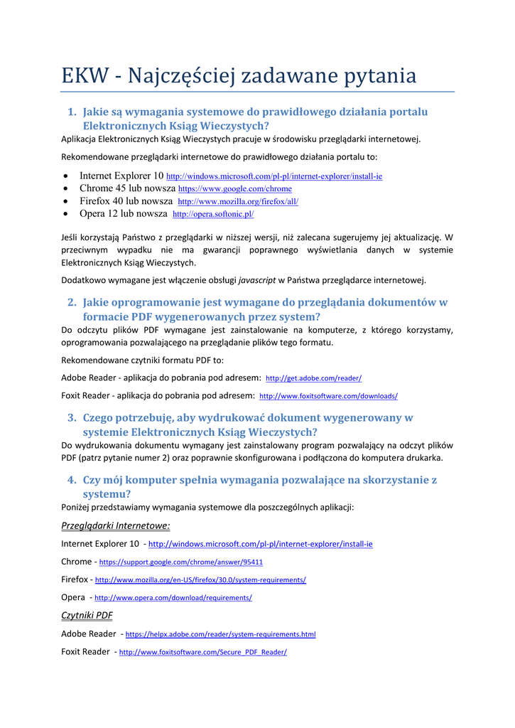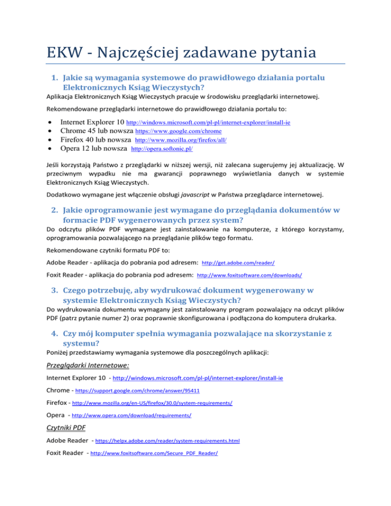 EKW - Najczęściej zadawane pytania 1. Jakie są wymagania systemowe do prawidłowego działania portalu Elektronicznych Ksiąg Wieczystych? Aplikacja Elektronicznych Ksiąg Wieczystych pracuje w środowisku przeglądarki internetowej. Rekomendowane przeglądarki internetowe do prawidłowego działania portalu to: Internet Explorer 10 http://windows.microsoft.com/pl-pl/internet-explorer/install-ie Chrome 45 lub nowsza https://www.google.com/chrome Firefox 40 lub nowsza http://www.mozilla.org/firefox/all/ Opera 12 lub nowsza http://opera.softonic.pl/ Jeśli korzystają Państwo z przeglądarki w niższej wersji, niż zalecana sugerujemy jej aktualizację. W przeciwnym wypadku nie ma gwarancji poprawnego wyświetlania danych w systemie Elektronicznych Ksiąg Wieczystych. Dodatkowo wymagane jest włączenie obsługi javascript w Państwa przeglądarce internetowej. 2. Jakie oprogramowanie jest wymagane do przeglądania dokumentów w formacie PDF wygenerowanych przez system? Do odczytu plików PDF wymagane jest zainstalowanie na komputerze, z którego korzystamy, oprogramowania pozwalającego na przeglądanie plików tego formatu. Rekomendowane czytniki formatu PDF to: Adobe Reader - aplikacja do pobrania pod adresem: http://get.adobe.com/reader/ Foxit Reader - aplikacja do pobrania pod adresem: http://www.foxitsoftware.com/downloads/ 3. Czego potrzebuję, aby wydrukować dokument wygenerowany w systemie Elektronicznych Ksiąg Wieczystych? Do wydrukowania dokumentu wymagany jest zainstalowany program pozwalający na odczyt plików PDF (patrz pytanie numer 2) oraz poprawnie skonfigurowana i podłączona do komputera drukarka. 4. Czy mój komputer spełnia wymagania pozwalające na skorzystanie z systemu? Poniżej przedstawiamy wymagania systemowe dla poszczególnych aplikacji: Przeglądarki Internetowe: Internet Explorer 10 - http://windows.microsoft.com/pl-pl/internet-explorer/install-ie Chrome - https://support.google.com/chrome/answer/95411 Firefox - http://www.mozilla.org/en-US/firefox/30.0/system-requirements/ Opera - http://www.opera.com/download/requirements/ Czytniki PDF Adobe Reader - https://helpx.adobe.com/reader/system-requirements.html Foxit Reader - http://www.foxitsoftware.com/Secure_PDF_Reader/ 5. Jak realizowane są płatności w aplikacji? Realizacja płatności za usługi świadczone kanałami elektronicznymi w serwisie Elektronicznych Ksiąg Wieczystych odbywa się za pośrednictwem serwisu płatności elektronicznych Przelewy24. Do kwoty płatności obliczonej przez system EKW operator płatności doliczy prowizję za usługi płatnicze. System EKW oczekuje na dokonanie i potwierdzenie płatności przez okres 20 minut od chwili zaakceptowania wniosku i zainicjowania płatności (przekierowania na stronę secure.przelewy24.pl). Jeżeli po upływie tego czasu użytkownik nie sfinalizuje płatności, sesja użytkownika w EKW wygasa. Użytkownik może wykorzystać link przesłany na podany adres email w celu odzyskania sesji z wprowadzonymi wnioskami i ponownego zainicjowania płatności. W razie problemu z realizacją płatności prosimy o kontakt z Infolinią serwisu Przelewy24 pod numerem +48 (61) 642 93 44, bądź zgłaszanie ich drogą mailową na adres [email protected] 6. Jakie metody oraz kanały płatności są dostępne do wykorzystania w ramach składania wniosku o wydanie dokumentów w EKW? Obecnie dostępna jest metoda płatności w postaci przelewów on-line. Płatności kartowe (karty kredytowe / debetowe), przedpłaty, przelewy tradycyjne, płatności SMS nie są dostępne. Pełen wykaz kanałów płatniczych obsługiwanych przez serwis Przelewy24 dostępny jest pod adresem: http://www.przelewy24.pl/cms,66,przelewy_karty_przekazy.htm 7. Jakie dane muszę podać podczas zamawiania dokumentu? Podczas zamawiania dokumentu za pośrednictwem portalu Elektronicznej Księgi Wieczystej należy posiadać numer księgi wieczystej. Składa się on z trzech członów: czteroznakowego kodu wydziału, właściwego numeru księgi wieczystej oraz cyfry kontrolnej. Aby ustalić numer elektronicznej księgi wieczystej, należy skontaktować się z właściwym ze względu na miejsce położenia nieruchomości Sądem Rejonowym - Wydziałem Ksiąg Wieczystych. Wykaz wydziałów ksiąg wieczystych, w których wdrożono system informatyczny: http://bip.ms.gov.pl/pl/rejestry-i-ewidencje/ksiegi-wieczyste/download,2001,0.html Podczas zamawiania dokumentu niezbędne jest także podanie prawidłowego adresu e-mail. 8. Czy muszę posiadać adres e-mail? Tak, posiadanie skrzynki e-mail jest konieczne, ponieważ na podany adres zostanie wysłany link, pod którym będą dostępne takie informacje jak: zarejestrowane wnioski, potwierdzenia złożenia wniosków i dokonania płatności oraz dokumenty do samodzielnego wydruku (nie dotyczy dokumentów o korespondencyjnej formie dostarczenia). Link pozostanie nieaktywny do momentu zrealizowania płatności. Informujemy, że potwierdzenie złożenia wniosku jest dostępne przez 24 miesiące od chwili rejestracji wniosku, a żądany dokument przez 14 dni od chwili jego wygenerowania. 9. Nie otrzymałem żadnej wiadomości na swoją skrzynkę e-mail. W zależności od obciążenia systemu, czas dostarczenia wiadomości może zostać wydłużony. Jeśli nie możesz znaleźć wiadomości, sprawdź czy program pocztowy zakwalifikował wiadomości jako spam. W tym celu prosimy o sprawdzenie folderu wiadomości-śmieci lub spam. Jeżeli mimo wszystko nie otrzymałeś wiadomości prosimy o kontakt z działem utrzymania. 10. Co zrobić w sytuacji, gdy opłaciłem wniosek w wymaganej wysokości a system nie udostępnił mi żądanego dokumentu (z powodu opóźnienia w potwierdzeniu płatności, z powodów technicznych)? Prosimy o kontakt z Centralną Informacją Ksiąg Wieczystych w celach reklamacyjnych – adres email i nr telefonu dostępne na https://ekw.ms.gov.pl/eukw/kontakt.do Każdy tego typu przypadek zostanie indywidualnie rozpatrzony. 11. Dlacze