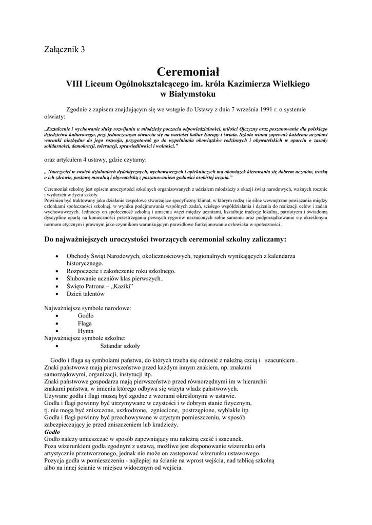 Załącznik 3 Ceremoniał VIII Liceum Ogólnokształcącego im. króla Kazimierza Wielkiego w Białymstoku Zgodnie z zapisem znajdującym się we wstępie do Ustawy z dnia 7 września 1991 r. o systemie oświaty: „Kształcenie i wychowanie służy rozwijaniu u młodzieży poczucia odpowiedzialności, miłości Ojczyzny oraz poszanowania dla polskiego dziedzictwa kulturowego, przy jednoczesnym otwarciu się na wartości kultur Europy i świata. Szkoła winna zapewnić każdemu uczniowi warunki niezbędne do jego rozwoju, przygotować go do wypełniania obowiązków rodzinnych i obywatelskich w oparciu o zasady solidarności, demokracji, tolerancji, sprawiedliwości i wolności.” oraz artykułem 4 ustawy, gdzie czytamy: „ Nauczyciel w swoich działaniach dydaktycznych, wychowawczych i opiekuńczych ma obowiązek kierowania się dobrem uczniów, troską o ich zdrowie, postawę moralną i obywatelską z poszanowaniem godności osobistej ucznia.” Ceremoniał szkolny jest opisem uroczystości szkolnych organizowanych z udziałem młodzieży z okazji świąt narodowych, ważnych rocznic i wydarzeń w życiu szkoły. Powinien być traktowany jako działanie zespołowe stwarzające specyficzny klimat, w którym rodzą się silne wewnętrzne powiązania między członkami społeczności szkolnej, w wyniku podejmowania wspólnych zadań, ścisłego współdziałania i dążenia do realizacji celów i zadań wychowawczych. Jednoczy on społeczność szkolną i umacnia więzi między uczniami, kształtuje tradycję lokalną, patriotyzm i świadomą dyscyplinę opartą na konieczności przestrzegania pewnych rygorów narzuconych sobie samemu oraz podporządkowanie się określonym normom etycznym i prawnym jako czynnikom warunkującym prawidłowe funkcjonowanie człowieka w społeczności . Do najważniejszych uroczystości tworzących ceremoniał szkolny zaliczamy: Obchody Świąt Narodowych, okolicznościowych, regionalnych wynikających z kalendarza historycznego. Rozpoczęcie i zakończenie roku szkolnego. Ślubowanie uczniów klas pierwszych.. Święto Patrona – „Kaziki” Dzień talentów Najważniejsze symbole narodowe: Godło Flaga Hymn Najważniejsze symbole szkolne: Sztandar szkoły Godło i flaga są symbolami państwa, do których trzeba się odnosić z należną czcią i szacunkiem . Znaki państwowe mają pierwszeństwo przed każdym innym znakiem, np. znakami samorządowymi, organizacji, instytucji itp. Znaki państwowe gospodarza mają pierwszeństwo przed równorzędnymi im w hierarchii znakami państwa, w imieniu którego odbywa się wizyta władz państwowych. Używane godła i flagi muszą być zgodne z wzorami określonymi w ustawie. Godła i flagi powinny być utrzymywane w czystości i w dobrym stanie fizycznym, tj. nie mogą być zniszczone, uszkodzone, zgniecione, postrzępione, wyblakłe itp. Godła i flagi powinny być przechowywane w czystym pomieszczeniu, w sposób zabezpieczający je przed zniszczeniem lub kradzieży. Godło Godło należy umieszczać w sposób zapewniający mu należną cześć i szacunek. Poza wizerunkiem godła zgodnym z ustawą, możliwe jest eksponowanie wizerunku orła artystycznie przetworzonego, jednak nie może on zastępować wizerunku ustawowego. Pozycja godła w pomieszczeniu - najlepiej na ścianie na wprost wejścia, nad tablicą szkolną albo na innej ścianie w miejscu widocznym od wejścia. Flaga Flaga to jeden z głównych symboli państwa lub jego części składowej, także miasta, instytucji, organizacji, urzędów i dostojników państwowych. Jest to tkanina prostokątna lub kwadratowa w określonych barwach. Flaga Polski to prostokątny płat tkaniny ( stosunek boków 8 : 5) o barwach : białej (u góry) i czerwonej (u dołu). Budynek szkoły dekorowany jest flagami państwowymi w : Święta państwowe Wybory parlamentarne, prezydenckie, samorządowe Inne uroczystości wynikające z Ceremoniału szkolnego Podczas żałoby narodowej Szczegółowe wskazówki dotyczące postępowania z flagą państwową: - na fladze nie wolno umieszczać ani przyczepiać do niej żadnego znaku, litery słowa, liczby, czy jakiegokolwiek rysunku, - gdy flaga jest wywieszona, powinna zajmować pozycję uprzywilejowaną, - flaga powinna być tak umieszczana, aby nie dotykała podłoża, podłogi lub nie była zamoczona w wodzie, - flaga powinna być zabezpieczona przed zniszczeniem, zerwaniem lub upadkiem na ziemię, - flaga powinna być wciągana na maszt i opuszczana w sposób energiczny, a jeżeli podczas jej podnoszenia jest wykonywany hymn, tempo podnoszenia flagi należy dostosować do czasu wykonywania hymnu (zacząć i skończyć jednocześnie); - jeżeli flaga jest umieszczona na podium mówcy, powinna znajdować się na prawo od mówcy; zwróconego twarzą do słuchaczy lub płasko na ścianie, nad mówcą lub za nim, - po przecięciu wstęgi w barwach państwowych z okazji uroczystości otwarcia obiektu szkolnego lub odsłonięcia pomnika oraz tablicy, wstęgę należy zabezpieczyć, aby nie upadła na ziemię, nie leżała na ziemi, ani nie była deptana, - w przypadku ogłoszenia żałoby narodowej flagę wywiesza się opuszczoną do połowy masztu w ten sposób, że podnosi się ją do samej góry, a następnie opuszcza do połowy masztu. Przy jej zdejmowaniu podobnie, należy najpierw podnieść ją do samej góry następnie opuścić całkowicie. Jeżeli nie ma takiej możliwości (brak masztu) żałobę można wyrazić wywieszając czarną flagę na pozycji na lewo od flagi państwowej lub poprzez przymocowanie do drzewca czarnej wstęgi. Eksponowanie flagi RP z innymi flagami, np. organizacji krajowych, innych krajów lub organizacji międzynarodowych: - jeżeli wraz z flagą RP eksponowane są flagi różnych krajów i organizacji, maszty powinny być tej samej wysokości, - flaga RP powinna być podnoszona jako pierwsza i opuszczana jako ostatnia, - flaga państwowa nie powinna być wywieszana na jednym maszcie lub drzewcu 