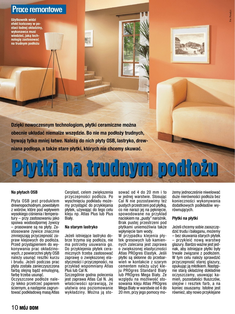 Fot. Paradyż Prace remontowe Użytkownik widzi efekt końcowy w postaci ładnej okładziny, wykonawca musi wiedzieć, jaką technologię zastosować na trudnym podłożu Dzięki nowoczesnym technologiom, płytki ceramiczne można obecnie układać niemalże wszędzie. Bo nie ma podłoży trudnych, bywają tylko mniej łatwe. Należą do nich płyty OSB, lastryko, drewniana podłoga, a także stare płytki, których nie chcemy skuwać. Płytki na trudnym podłożu Na płytach OSB Płyta OSB jest produktem drewnopochodnym, powstałym z wiórów, które pod wpływem wysokiego ciśnienia i temperatury – przy zastosowaniu jako spoiwa wodoodpornej żywicy – prasowane są na płyty. Zastosowane żywice znacznie zmniejszają przyczepność zapraw klejowych do podłoża. Przed przystąpieniem do wykonywania prac okładzinowych, z powierzchni płyty OSB należy usunąć resztki kurzu i brudu. Jeżeli podczas prac płyta została zanieczyszczona farbą olejną bądź emulsyjną, farbę trzeba usunąć. Oczyszczone podłoże należy lekko przetrzeć papierem ściernym, a następnie zagruntować podkładową masą Atlas 10 MÓJ DOM Cerplast, celem zwiększenia przyczepności podłoża. Po wyschnięciu podkładu możemy przystąpić do przyklejania płytek, używając do tego celu kleju np. Atlas Plus lub Plus Biały. Na starym lastryko Jeżeli istniejące lastryko dobrze trzyma się podłoża, nie ma potrzeby usuwania go. Do przyklejenia płytek ceramicznych trzeba zastosować zaprawę o zwiększonej elastyczności i przyczepności, na przykład wspomniany Atlas Plus lub Cal N. Szczególnie godna polecenia jest zaprawa Atlas Cal N. Jej właściwości sprawiają, że ułatwia ona poziomowanie wykładziny. Można ją sto- sować od 4 do 20 mm i to w jednej warstwie. Stosując Cal N nie pozostawimy też pustych przestrzeni pod płytką, co nie narazi jej na pęknięcie, spowodowane na przykład naciskiem na „pusty” narożnik. Brak pustej przestrzeni pod płytkami uniemożliwia także wpłynięcie tam wody. W przypadku klejenia płytek gresowych lub kamiennych zalecana jest zaprawa o zwiększonej elastyczności Atlas PROgres Elastyk. Jeśli płytki są skłonne do przebarwień w kontakcie z szarym cementem należy użyć kleju PROgres Standard Biały lub PROgres Mega Biały. Ze względu na możliwość stosowania kleju Atlas PROgres Mega Biały w warstwie od 4 do 20 mm, przy jego pomocy mo- żemy jednocześnie niwelować duże nierówności podłoża bez konieczności wykonywania dodatkowych podkładów wyrównujących. Płytki na płytki Jeżeli chcemy sobie zaoszczędzić trudu i bałaganu, możemy – bez skuwania starych płytek – przykleić nową warstwę glazury. Bardzo ważne jest jednak, aby istniejące płytki były trwale związane z podłożem. W tym celu należy sprawdzić przyczepność starej glazury, opukując ją młotkiem. Następnie starą okładzinę dokładnie oczyszczamy, usuwając kamień, pozostałości tłuszczów, olejów i resztek farb, a na koniec osuszamy. Istotne jest również, aby nowo przyklejane Porada Zanim sięgniesz po płytki Przygotowanie podłoża pod płytki jest równie ważne jak wybór odpowiedniego kleju. Jedno i drugie ma ogromny wpływ na ostateczny efekt. Podłoże, na którym będą układane płytki powinno być stabilne, suche i czyste. Nie może być popękane i zanieczyszczone substancjami mogącymi pogorszyć przyczepność klejów. Powinno być odkurzone i odtłuszczone poprzez umycie wodą z dodatkiem detergentów, natomiast pozostałości farb należy usunąć. Podłoże nie może się też sypać lub łuszczyć, a na jego powierzchni nie powinny występować wykwity pleśni. Idealne podłoże rzadko się spotyka. Najczęściej ściana lub podłoga wymaga wyrównania i uzupełnienia ubytków. Szczególnie dotyczy to podłoży starych. Należy wykorzystać do tego celu odpowiednie masy wyrównujące i szpachlowe. Zastosowanie emulsji gruntującej jest bardzo istotne tam, gdzie trzeba zredukować i wyrównać chłonność podłoża. Układanie okładziny ceramicznej metodą płytki na płytki. należy ułożyć na podłodze folię, następnie na nią wylać jeden z podkładów do stosowania na warstwie oddzielającej. Może to być Atlas SAM 150 lub SAM 200, Posadzka Cementowa Atlas lub Postar 100. Na związanym podkładzie możemy spokojnie przykleić płytki, nie lękając się, że coś się odspoi lub popęka. Z przyklejeniem trzeba jednak zaczekać określony czas, zgodny z instrukcją stosowania danej wylewki. Ta zwłoka jest niezbędna, aby wylewka nabrała właściwej wytrzymałości, a przede wszystkim odpowiednio przeschła, uwalniając się od wilgoci technologicznej. Fot. ATLAS Układanie okładziny ceramicznej na płytach drewnopochodnych. płytki były lekko przesunięte w stosunku do starych. Zaleca się klejenie płytek metodą ciągłą, nakładając zaprawę i na podłoże, i – cienką warstwą – na spodnią stronę płytki. Taki sposób klejenia zapewni dużo lepszą przyczepność i prawidłowe wypełnienie przestrzeni pod płytami. Dla zachowania równych odległości między płytkami stosujemy krzyżyki dystansowe. Po 24 godzinach można przystąpić do spoinowania płytek. Wszystkie prace należy wykonywać w temperaturze od +5°C do +25°C. Na drewnianej podłodze Przy próbie wykonania okładziny na tego typu podłodze czyha na nas wiele niebez- pieczeństw. Zaliczyć do nich należy niestabilność podkładu (uginanie się płyt lub desek), zła jakość drewna osłabionego wieloletnim użytkowaniem, niejednorodność powierzchni, zabrudzenia lub powłoki z lakieru lub farb olejnych. Najrozsądniejszym rozwiązaniem w takim przypadku jest więc całkowite odcięcie się od podkładu drewnianego. Jeśli chcemy zdecydować się na tę metodę, wcześniej należy zlecić konstruktorowi badania, związane z wytrzymałością stropu, ponieważ taka wylewka dodatkowo go dociąży. Aby wylewka stanowiła płytę zdol