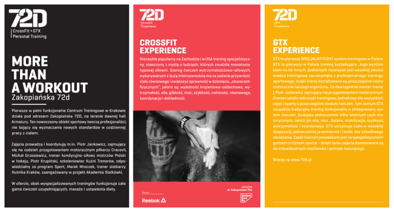 MORE THAN A WORKOUT Zakopiańska 72d CROSSFIT EXPERIENCE GTX EXPERIENCE Niezwykle popularny na Zachodzie i w USA trening specjalistyczny, stworzony z myślą o ludziach, których znudziła monotonia typowej siłowni. Szereg ćwiczeń wytrzymałościowo-siłowych, wykonywanych z dużą intensywnością ma za zadanie przywrócić ciału równowagę i zwiększyć sprawność w dziesięciu „obszarach fizycznych”, jakimi są: wydolność krążeniowo-oddechowa, wytrzymałość, siła, gibkość, moc, szybkość, zwinność, równowaga, koordynacja i dokładność. GTX to pierwszy SPECJALISTYCZNY system treningowy w Polsce. GTX to pierwszy w Polsce trening kształtujący. Jego wyróżnikiem na tle innych, podobnych rozwiązań jest wysokiej jakości wiedza treningowa zaczerpnięta z profesjonalnego treningu sportowego, dzięki której kształtowane są poszczególne cechy motoryczne naszego organizmu. Co dwa tygodnie master-trener ( Piotr Jankowicz zajmujący się przygotowaniem motorycznym Cracovi ustala mikrocykl treningowy, jednakowy dla wszystkich zajęć i oparty o poszczególne moduły ćwiczeń. Tym samym GTX uzupełnia tradycyjny trening funkcjonalny o zintegrowany system ćwiczeń, budujący jednocześnie kilka istotnych cech motorycznych, takich jak siła, moc , balans, stabilizacja, szybkość, wytrzymałość i koordynacja. GTX utrzymuje ciało w wysokiej dyspozycji, jednocześnie je wzmacnia i rzeźbi, bez szkodliwego obciążania. Część ćwiczeń prowadzona jest na specjalistycznych gumach o różnym oporze – dzięki temu zajęcia dostosowane są do indywidualnych możliwości i potrzeb ćwiczącego. Pierwsze w pełni funkcjonalne Centrum Treningowe w Krakowie działa pod adresem Zakopiańska 72D, na terenie dawnej hali Armatury. Ten nowoczesny obiekt sportowy tworzą profesjonaliści, nie bojący się wyznaczania nowych standardów w codziennej pracy z ciałem. Zajęcia prowadzą i koordynują m.in. Piotr Jankowicz, zajmujący się na codzień przygotowaniem motorycznym piłkarzy Cracovii, Michał Grzesiewicz, trener kondycyjno-siłowy mistrzów Polski w hokeju, Piotr Krupiński, szkoleniowiec Kuźni Trenerów, odpowiedzialny za program Sport, Marek Mroczek, trener siatkarzy Hutnika Kraków, zaangażowany w projekt Akademia Siatkówki. W ofercie, obok wyspecjalizowanych treningów funkcjonuje cała gama ćwiczeń uzupełniających, masaże i ustawienia diety. Więcej na www.72d.pl Partner: MORE THAN A WORKOUT Zakopiańska 72d Pierwsze w pełni funkcjonalne Centrum Treningowe w Krakowie działa pod adresem Zakopiańska 72D, na terenie dawnej hali Armatury. Ten nowoczesny obiekt sportowy tworzą profesjonaliści, nie bojący się wyznaczania nowych standardów w codziennej pracy z ciałem. W ofercie, obok wyspecjalizowanych treningów funkcjonuje cała gama ćwiczeń uzupełniających, masaże i ustawienia diety. FITNESS EXPERIENCE PERSONAL TRAINING EXPERIENCE Nowoczesny fitness w klubie 72D dostosowany został tak, aby nie tylko zaistnieć niezależnie od pozostałych pozycji w grafiku, lecz także by skutecznie uzupełniać treningi funkcjonalne, takie jakie CrossFit, GTX i Trening Personalny. Szeroka oferta zakłada, że każdy znajdzie tu coś dla siebie: Trening obwodowy, HIIT, Indoor Cycling, TRX, Sztangi, Pilates, Body Art, Zdrowy Kręgosłup i Stretching wypełniają całkowicie zapotrzebowanie najbardziej wymagających klubowiczów. Rozwiązaniem dla najbardziej wymagających jest seria spotkań z profesjonalnym trenerem personalnym, który przygotuje indywidualny program ćwiczeń, ustawi zajęcia przed maratonem, sezonem narciarskim, wyprowadzi z kontuzji lub wzmocni osłabioną kondycję. Treningi odbywają się w specjalnie oddzielonej i profesjonalnie przygotowanej strefie, odizolowanej od reszty Klubu. Zwiększa to komfort pracy i zacieśnia więź osoby ćwiczącej z trenerem prowadzącym zajęcia. FITNESS ACTIVE ∂ Ćwiczenia w służbie twojej aktywności Trening Obwodowy HIIT High Intensivity Interval Training Indoor Cycling TRX Sztangi Body Art Zdrowy Kręgosłup FITNESS HEALTH ∂ Ćwiczenia w służbie twojego zdrowia Pilates Stretching Poczytaj więcej na 72d.pl