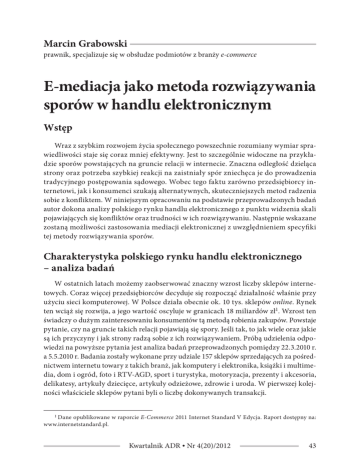 Marcin Grabowski prawnik, specjalizuje się w obsłudze podmiotów z branży e-commerce E-mediacja jako metoda rozwiązywania sporów w handlu elektronicznym Wstęp Wraz z szybkim rozwojem życia społecznego powszechnie rozumiany wymiar sprawiedliwości staje się coraz mniej efektywny. Jest to szczególnie widoczne na przykładzie sporów powstających na gruncie relacji w internecie. Znaczna odległość dzieląca strony oraz potrzeba szybkiej reakcji na zaistniały spór zniechęca je do prowadzenia tradycyjnego postępowania sądowego. Wobec tego faktu zarówno przedsiębiorcy internetowi, jak i konsumenci szukają alternatywnych, skuteczniejszych metod radzenia sobie z konfliktem. W niniejszym opracowaniu na podstawie przeprowadzonych badań autor dokona analizy polskiego rynku handlu elektronicznego z punktu widzenia skali pojawiających się konfliktów oraz trudności w ich rozwiązywaniu. Następnie wskazane zostaną możliwości zastosowania mediacji elektronicznej z uwzględnieniem specyfiki tej metody rozwiązywania sporów. Charakterystyka polskiego rynku handlu elektronicznego – analiza badań W ostatnich latach możemy zaobserwować znaczny wzrost liczby sklepów internetowych. Coraz więcej przedsiębiorców decyduje się rozpocząć działalność właśnie przy użyciu sieci komputerowej. W Polsce działa obecnie ok. 10 tys. sklepów online. Rynek ten wciąż się rozwija, a jego wartość oscyluje w granicach 18 miliardów zł1. Wzrost ten świadczy o dużym zainteresowaniu konsumentów tą metodą robienia zakupów. Powstaje pytanie, czy na gruncie takich relacji pojawiają się spory. Jeśli tak, to jak wiele oraz jakie są ich przyczyny i jak strony radzą sobie z ich rozwiązywaniem. Próbą udzielenia odpowiedzi na powyższe pytania jest analiza badań przeprowadzonych pomiędzy 22.3.2010 r. a 5.5.2010 r. Badania zostały wykonane przy udziale 157 sklepów sprzedających za pośrednictwem internetu towary z takich branż, jak komputery i elektronika, książki i multimedia, dom i ogród, foto i RTV-AGD, sport i turystyka, motoryzacja, prezenty i akcesoria, delikatesy, artykuły dziecięce, artykuły odzieżowe, zdrowie i uroda. W pierwszej kolejności właściciele sklepów pytani byli o liczbę dokonywanych transakcji. 1 Dane opublikowane w raporcie E-Commerce 2011 Internet Standard V Edycja. Raport dostępny na: www.internetstandard.pl. Kwartalnik ADR • Nr 4(20)/2012 43 Grabowski Rozmiary sklepów 1. Małe sklepy (poniżej 100 zakupów w miesiącu) 2. Średnie sklepy (od 100 do 500 zakupów w miesiącu) 3. Duże sklepy (powyżej 500 zakupów w miesiącu) Wśród badanych 63% respondentów zadeklarowało, że prowadzi sklepy małe, czyli takie, które wysyłają poniżej 100 paczek w miesiącu; 23% prowadzi sklepy średnie, dokonujące od 100 do 500 sprzedaży w miesiącu; 14% to sklepy duże − wysyłające ponad 500 paczek miesięcznie. Dane te są istotne z punktu widzenia dalszych ustaleń. Liczba sporów jest wprost proporcjonalna do liczby zawieranych transakcji – im więcej zakupów w danym sklepie, tym więcej pojawiających się sytuacji konfliktowych – o czym poniżej. Liczba konfliktów w skali roku 1. Mniej niż 10 sytuacji konfliktowych 2. Od 10 do 20 sytuacji konfliktowych 3. Powyżej 20 sytuacji konfliktowych Właściciele sklepów byli pytani o liczbę sporów powstających w związku z prowadzoną w internecie działalnością. Wyniki przedstawiają się następująco: 63% respondentów odpowiedziało, że ma mniej niż 10 sytuacji konfliktowych w skali roku, 23% − od 10 do 20 takich sytuacji, natomiast 14% spotyka się z więcej niż 20 sytuacjami konfliktowymi każdego roku. Trzeba zauważyć, że środowisko internetowe jest szczególnie narażone na konflikty oraz znaczniej trudniej w nim rozwiązywać spory w sposób tradycyjny. Wynika to z kilku czynników. 44 Kwartalnik ADR • Nr 4(20)/2012 E-mediacja jako metoda rozwiązywania sporów w handlu elektronicznym Po pierwsze, komunikacja internetowa nie jest bezpośrednia. Strony porozumiewają się za pośrednictwem urządzeń elektronicznych, które kodują informację, przesyłają ją do odbiorcy i następnie odkodowują ją w celu zapoznania się z nią przez drugą stronę. Pośrednikiem pomiędzy komunikującymi się osobami są urządzenia elektroniczne oraz sieć informatyczna jako kanał przesyłu informacji. Trudność w takim sposobie wymiany treści polega na tym, że urządzenia te nie są pozbawione wad, często są zawodne, a co za tym idzie przekazywane informacje mogą być zniekształcone lub niepełne. Po drugie, strony najczęściej nie widzą się nawzajem. Uniemożliwia to obserwację komunikatów pozawerbalnych, takich jak gesty, wyraz twarzy, postawa ciała itp. Czynniki te stanowią ważny element komunikacji międzyludzkiej. Komunikacja elektroniczna jest tym samym pozbawiona wielu informacji, które wysyłają i odbierają osoby porozumiewające się w sposób tradycyjny (twarzą w twarz). Komunikacja elektroniczna jest kanałem ograniczającym lub wręcz uniemożliwiającym przekazywanie sygnałów pozawerbalnych, co utrudnia prawidłową interpretację wysyłanych informacji2. Po trzecie, strony zazwyczaj dzieli znaczna odległość, co może powodować u nich pewną miarę poczucia bezkarności i potęgować pokusę zachowania się w sposób powszechnie nieakceptowany. Po czwarte w końcu, czynnikiem znacznie konfliktogennym jest anonimowość. Jest ona jedną z podstawowych cech użytkowników internetu. Internauci często są określani, przez tzw. nick, adres IP lub adres e-mail, które nie ujawniają ich rzeczywistej tożsamości. Użytkownik odwiedzający forum internetowe czy portal społecznościowy3 często nie jest znany z imienia i nazwiska, nie mówiąc już o adresie zamieszkania czy nawet miejscowości. Może on więc wprowadzić do sieci dowolną treść bez obawy ujawnienia jego tożsamości i ukarania go4. Powyższe cechy wpływają n