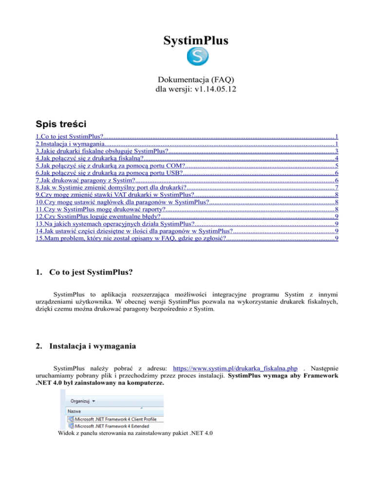 SystimPlus Dokumentacja (FAQ) dla wersji: v1.14.05.12 Spis treści 1.Co to jest SystimPlus?................................................................................................................................... 1 2.Instalacja i wymagania.................................................................................................................................. 1 3.Jakie drukarki fiskalne obsługuje SystimPlus?.............................................................................................. 3 4.Jak połączyć się z drukarką fiskalną?............................................................................................................ 4 5.Jak połączyć się z drukarką za pomocą portu COM?..................................................................................... 5 6.Jak połączyć się z drukarką za pomocą portu USB?...................................................................................... 6 7.Jak drukować paragony z Systim?................................................................................................................. 6 8.Jak w Systimie zmienić domyślny port dla drukarki?.................................................................................... 7 9.Czy mogę zmienić stawki VAT drukarki w SystimPlus?............................................................................... 8 10.Czy mogę ustawić nagłówek dla paragonów w SystimPlus?....................................................................... 8 11.Czy w SystimPlus mogę drukować raporty?................................................................................................ 8 12.Czy SystimPlus loguje ewentualne błędy?................................................................................................... 9 13.Na jakich systemach operacyjnych działa SystimPlus?............................................................................... 9 14.Jak ustawić części dziesiętne w ilości dla paragonów w SystimPlus? ......................................................... 9 15.Mam problem, który nie został opisany w FAQ, gdzie go zgłosić?............................................................. 9 1. Co to jest SystimPlus? SystimPlus to aplikacja rozszerzająca możliwości integracyjne programu Systim z innymi urządzeniami użytkownika. W obecnej wersji SystimPlus pozwala na wykorzystanie drukarek fiskalnych, dzięki czemu można drukować paragony bezpośrednio z Systim. 2. Instalacja i wymagania SystimPlus należy pobrać z adresu: https://www.systim.pl/drukarka_fiskalna.php . Następnie uruchamiamy pobrany plik i przechodzimy przez proces instalacji. SystimPlus wymaga aby Framework .NET 4.0 był zainstalowany na komputerze. Widok z panelu sterowania na zainstalowany pakiet .NET 4.0 Podczas instalacji zostanie wykryte czy użytkownik ma zainstalowany dodatek .NET 4.0, po akceptacji zgody na instalacje aplikacja automatycznie pobierze i zainstaluje wymagane pliki, dlatego zaleca się aby komputer był połączony z internetem podczas instalacji programu. Framework .NET 4.0 można pobrać również samodzielnie między innymi na stronie Microsoftu, poprzez Windows Update lub z innych stron internetowych z aplikacjami. Jeśli instalacja przebiegła pomyślnie, możemy uruchomić program bezpośrednie po zakończeniu instalacji. Wymagania sprzętowe SystimPlus Procesor: 1 Ghz lub szybszy RAM: 512 MB Dysk twardy: minimum 20 MB Inne: dostęp do internetu (w celu łączenia z Systim), Port COM (lub US B) Przy pierwszym uruchomieniu system zapyta o dostęp sieci dla programu SystimPlus. Należy kliknąć na "Zezwalaj na dostęp". 3. Jakie drukarki fiskalne obsługuje SystimPlus? SystimPlus domyślnie obsługuje następujące modele drukarek fiskalnych: Innova (DF-1 i kompatybilne); Epson (TM-T801FV i kompatybilne); Posnet (Thermal i kompatybilne). Najszybszym i najwygodniejszym sposobem obsługi drukarki jest komunikacja poprzez port szeregowy (serial port) COM. Port szeregowy COM 4. Jak połączyć się z drukarką fiskalną? Najłatwiejszym sposobem komunikacji jest wykorzystanie portu szeregowego COM. W przypadku korzystania z transmisji za pomocą interfejsu USB konieczne będzie zainstalowanie sterowników drukarki dołączonych przez producenta podczas zakupu. Większość nowych drukarek fiskalnych ma ustawioną opcję rodzaju połączenia na automatyczne wyszukiwanie. Jeśli jednak nie jesteśmy pewni ustawień rodzaju połączenia z komputerem, można sprawdzić (i ustawić) ręcznie rodzaj komunikacji drukarki z komputerem w opcjach urządzenia. Przykład dla drukarki INNOVA DF-1: Aby wejść w MENU należy wyłączyć drukarkę i ponownie ją włączyć trzymając przyciski umieszczone na konsoli, następnie przechodzimy do: wciśnięte oba Konfiguracja -> COM -> Interfejs drukarki do wyboru mamy 2 opcje; AUTO lub RS-232 (COM) , najlepiej jest ustawić na AUTO. UWAGA: Zmiany opcji drukarki należy przeprowadzać z zachowaniem dużej ostrożności, zmiana ustawień może spowodować błędne działanie programu. Dla każdej drukarki opis ustawień i dostęp do menu jest umieszczony w instrukcji użytkownika dołączanej do sprzętu podczas zakupu. Przykład dla drukarki NOVITUS DEON: W przypadku drukarki NOVITUS DEON ważne jest ustawienie metody komunikacji, w zależności od tego, czy będziemy korzystać z portu COM (RS-232) czy USB. W tym celu należy nacisnąć przycisk MENU na drukarce. Następnie: 2 Ustawienia → 2.2 Konfiguracja → 2.2.2 Komunikacja → 2.2.2 5 Połączenia Dla połączenia COM ustawiamy (ustawienie domyślne) : Natomiast dla USB wybieramy opcję: UWAGA: W przypadku korzystania z trybu USB drukarka NOVITUS DEON tworzy wirtualny port COM. W razie potrzeby należy zainstalować sterowniki dołączone przez producenta. Przykład dla drukarki POSNET Temo HS: W przypadku drukarki Posnet Temo HS należy ustawić najpierw interfejs komunikacji. W tym celu należy wejś