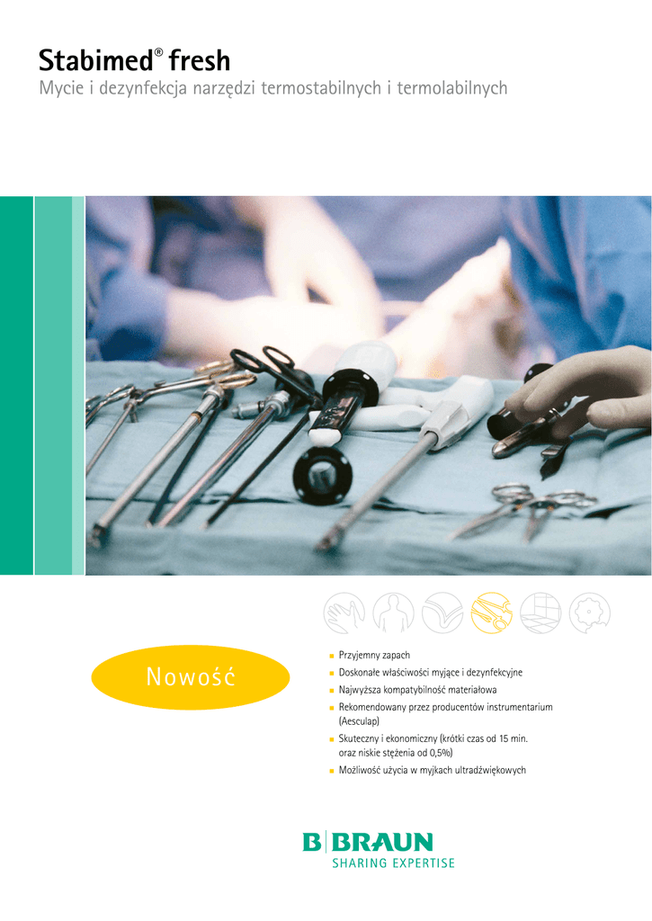 Stabimed® fresh Mycie i dezynfekcja narzędzi termostabilnych i termolabilnych Przyjemny zapach Doskonałe właściwości myjące i dezynfekcyjne Najwyższa kompatybilność materiałowa Rekomendowany przez producentów instrumentarium (Aesculap) Skuteczny i ekonomiczny (krótki czas od 15 min. oraz niskie stężenia od 0,5%) Możliwość użycia w myjkach ultradźwiękowych n Nowość n n n n n Stabimed® fresh Mycie i dezynfekcja narzędzi termostabilnych i termolabilnych Przeznaczenie Stabimed® fresh jest przeznaczony do mycia i dezynfekcji narzędzi chirurgicznych oraz termostabilnych i termolabilnych wyrobów i urządzeń medycznych. Właściwości Uwaga: Przed pierwszym użyciem produktu Stabimed® fresh należy oczyścić wannę dezynfekcyjną za pomocą wody i preparatu Helizyme, celem usunięcia ewentualnych pozostałości po uprzednio przeprowadzanych dezynfekcjach (w szczególności, jeśli używany był preparat na bazie aldehydów). Nie mieszać z produktami na bazie aldehydów. W przypadku dezynfekcji endoskopów lub skomplikowanego instrumentarium zapoznać się z instrukcją producenta zawierającą wskazówki dotyczące czyszczenia. Zakładać rękawice i odzież ochronną. Świeży i przyjemny zapach Skuteczność mikrobiologiczna Ekonomiczny i szybki w działaniu Mikroorganizm Koncentrat oparty na alkiloaminach, bez aldehydów, fenoli, QAC Mycie i dezynfekcja narzędzi (bakteriobójczy, drożdżobójczy) wg.DGHM1)/ VAH2). oraz wirusy otoczkowe (HBV, HCV, HIV), Vaccinia wg. DVV/RKI 1,0% 0,5% 5 min. 15 min. 10ml/L 5ml/L Prątkobójczy (M. terrae) wg. DGHM/VAH, EN14348, EN14563 2,0% 15min. 20ml/L Adeno wg. EN14476 4,0% 1h 40ml/L Polyoma wg. EN14476 2,0% 1h 20ml/L Bakterie wg. EN13727, EN14561 0,25% 15 min. 2,5ml/L 0,25% 15 min. 2,5ml/L 1,0% 5 min. 10ml/L Doskonała tolerancja materiałowa Rekomendowany przez firmę Aesculap do dezynfekcji narzędzi Możliwość użycia w myjkach ultradźwiękowych Doskonałe właściwości myjące, łatwo usuwa trwałe zabrudzenia tj. zaschniętą krew, wydzieliny, białko Do mycia i dezynfekcji endoskopów giętkich Szerokie spektrum działania Wydajny: do 200 litrów roztworu roboczego z 1 litra koncentratu Wyrób medyczny klasy II b Stężenie Czas stosowania Swobodny dobór czasów i stężeń: 0,5%/15min., 1%/5 min. Grzyby (Candida albicans) wg. EN13624, EN14562 Mycie i dezynfekcja w myjkach ultradźwiękowych Instrukcja użycia W przygotowanym roztworze preparatu Stabimed® fresh zanurzyć instrumenty na przewidziany czas. Po zakończeniu dezynfekcji instrumenty należy dokładnie przepłukać zimną, bieżącą wodą. Końcowe płukanie należy prowadzić z wykorzystaniem wody zdemineralizowanej lub destylowanej. Instrumenty osuszyć za pomocą dobrze chłonnego i niepozostawiającego resztek materiału ręcznika. Dostępne opakowania 1) Roztwór ml/L DGHM - German Society of Hygieny and Microbiology 2) VAH – Association of Applied Hygiene Numer kat. Stabimed® fresh butelka 1000 ml 19689 Stabimed® fresh kanister 5 litrów 19690 Właściwości fizyczne i chemiczne wartość pH (w tem 20 0C): 10 Gęstość (20 0C, g/cm3): Wygląd 0,98g/cm3 przezroczysty, niebiesko - zielony płyn Bez aldehydów Stabimed® fresh skład chemiczny: 100g Stabimedu® fresh zawiera: 20,0g dwumiany kokospropylenu, substancje pomocnicze: związki powierzchniowo czynne, rozcieńczalniki, czynniki kompleksujące, inhibitory korozji, środki zwiększające rozpuszczalność, substancje zapachowe, barwniki. Zgodnie z Regulations for Detergents EG 648/2004 zawiera 15-30% niejonowych surfaktantów. Oznakowanie zgodne z Dyrektywą o Substancjach Niebezpiecznych. Produkt żrący. Łatwopalny. Szkodliwy w przypadku połknięcia, powoduje oparzenia. W przypadku kontaktu z oczami, przemyć niezwłocznie dużą ilością wody i skontaktować się z lekarzem. Należy używać odpowiedniego stroju ochronnego, rękawic oraz ochrony oczu i twarzy. W przypadku złego samopoczucia po użyciu skontaktować się z lekarzem, jeżeli to możliwe okazać etykietę produktu. Chronić przed dziećmi. Podmiot odpowiedzialny i wytwórca: B. Braun Melsungen AG ,Carl-Braun Straße 1 , D-34212 Melsungen ,Niemcy Aesculap Chifa Sp. z o.o. | 64-300 Nowy Tomyśl | ul. Tysiąclecia 14 Tel. 61 44 20 100 | Fax 61 44 23 936 | www.chifa.com.pl Aesculap Chifa - firma grupy B. Braun OPM-IC-066 22/05/2015