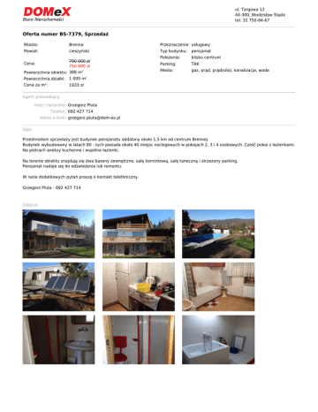 ul. Targowa 12 44-300, Wodzisław Śląski tel. 32 750-84-67 Oferta numer BS-7379, Sprzedaż Miasto: Brenna Przeznaczenie: usługowy Powiat: cieszyński Typ budynku: pensjonat Cena: 790 000 zł 750 000 zł Powierzchnia obiektu: 388 m 2 Położenie: blisko centrum Parking: TAK Media: gaz, prąd, prąd(siła), kanalizacja, woda Powierzchnia działki: 1 000 m2 Cena za m2: 1933 zł Agent prowadzący: Imię i nazwisko: Grzegorz Pluta Telefon: 692 427 714 Adres e-mail: [email protected] Opis: Przedmiotem sprzedaży jest budynek pensjonatu oddalony około 1,5 km od centrum Brennej. Budynek wybudowany w latach 80 - tych posiada około 40 miejsc noclegowych w pokojach 2, 3 i 4 osobowych. Cześć pokoi z łazienkami. Na pietrach aneksy kuchenne i wspólne łazienki. Na terenie obiektu znajdują się dwa baseny zewnętrzne, salę kominkową, salę taneczną i strzeżony parking. Pensjonat nadaje się do odświeżenia lub remontu. W razie dodatkowych pytań proszę o kontakt telefoniczny. Grzegorz Pluta - 692 427 714 Zdjęcia: Zamieszczone na naszej stronie oferty nieruchomości mają charakter informacyjny i nie stanowią oferty w rozumieniu prawa handlowego.