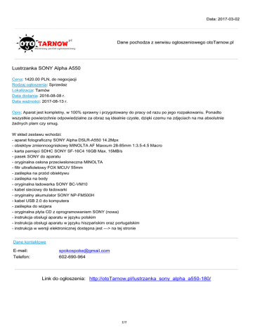 Data: 2017-03-02 Dane pochodza z serwisu ogloszeniowego otoTarnow.pl Lustrzanka SONY Alpha A550 Cena: 1420.00 PLN, do negocjacji Rodzaj ogłoszenia: Sprzedaz Lokalizacja: Tarnów Data dodania: 2016-08-08 r. Data ważności: 2017-08-13 r. Opis: Aparat jest kompletny, w 100% sprawny i przygotowany do pracy od razu po jego rozpakowaniu. Ponadto wszystkie powierzchnie odpowiedzialne za obraz są idealnie czyste, dzięki czemu na zdjęciach na ma absolutnie żadnych plam czy smug. W skład zestawu wchodzi: - aparat fotograficzny SONY Alpha DSLR-A550 14.2Mpx - obiektyw zmiennoogniskowy MINOLTA AF Maxxum 28-85mm 1:3.5-4.5 Macro - karta pamięci SDHC SONY SF-16C4 16GB Max. 15MB/s - pasek SONY do aparatu - oryginalna osłona przeciwsłoneczna MINOLTA - filtr ultrafioletowy FOX MCUV 55mm - zaślepka na przód obiektywu - zaślepka na body - oryginalna ładowarka SONY BC-VM10 - kabel sieciowy do ładowarki - oryginalny akumulator SONY NP-FM500H - kabel USB 2.0 do komputera - zaślepka do wizjera - oryginalna płyta CD z oprogramowaniem SONY (nowa) - instrukcja obsługi aparatu w języku polskim - instrukcja obsługi aparatu w języku hiszpańskim oraz portugalskim - instrukcja w wersji elektronicznej dostępna jest ---> na tej stronie Dane kontaktowe E-mail: Telefon: [email protected] 602-690-964 Link do ogłoszenia: http://otoTarnow.pl/lustrzanka_sony_alpha_a550-180/ 1/1