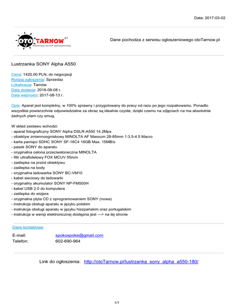 Lustrzanka SONY Alpha A550 Link do ogłoszenia: http://otoTarnow