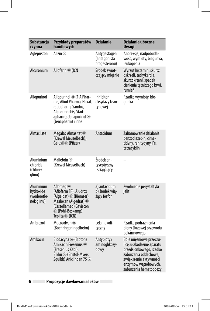 Substancja Przykłady preparatów Działanie czynna handlowych Aglepriston Alizin Ⓥ Antygestagen (antagonista progesteronu) Środek zwiotAlcuronium Alloferin Ⓗ (ICN czający mięśnie Działania uboczne Uwagi Anoreksja, nadpobudliwość, wymioty, biegunka, leukopenia Wyrzut histamin, skurcz oskrzeli, tachykardia, skurcz krtani, spadek ciśnienia tętniczego krwi, rumień Rzadko wymioty, biegunka Allopurinol Allopurinol Ⓗ (1 A Phar- Inhibitor ma, Aliud Pharma, Hexal, oksydazy ksanratiopharm, Sandoz, tynowej Alpharma-Isis, Stadapharm), Jenapurinol Ⓗ (Jenapharm) i inne Almasilate Megalac Almasitat Ⓗ (Krewel Meuselbach), Gelusil Ⓗ (Pfizer) Antacidum Zahamowanie działania benzodiazepin, cimetidyny, ranitydyny, Fe, tetracyklin Aluminium chloride (chlorek glinu) Mallebrin Ⓗ (Krewel Meuselbach) Środek antyseptyczny i ściągający – Aluminium hydroxide (wodorotlenek glinu) Aflomag Ⓗ (Aflofarm FP), Aludrox (Algeldat) Ⓗ (Riemser), Maaloxan (Algedrat) Ⓗ (Cassellamed) Gaviscon Ⓗ (Pohl-Boskamp) Tepilta Ⓗ (ICN) Mucosolvan Ⓗ (Boehringer Ingelheim) a) antacidum b) środek wiążący fosfor Zwolnienie perystaltyki jelit Lek mukolityczny Rzadko podrażnienia błony śluzowej przewodu pokarmowego Bóle mięśniowe przeczulice, uszkodzenie aparatu przedsionkowego, rzadko zaburzenia oddechowe, zwiększenie aktywności enzymów wątrobowych, zaburzenia hematopoezy Ambroxol Amikacin Antybiotyk Biodacyna Ⓗ (Bioton) Amikacin Fresenius Ⓗ aminoglikozy(Fresenius Kabi), dowy Biklin Ⓗ (Bristol-Myers Squibb) Aniclindan 75 Ⓥ 6 Propozycje dawkowania leków Kraft-Dawkowanie-leków-2009.indd6 6 2009-08-06 15:01:11 Wskazania Przeciwwskazania Dawka u psa Dawka u kota Przerwanie ciąży Niewydolność kory nadnerczy – 10 mg/kg m.c., 2 × w 24 godzinnych odstępach Zwiotczenie mięśni Jaskra, hepatopatia, 0,2–0,25 mg/kg (znieczulenie nefropatia m.c. i.v. ogólne) a) kamienie moczanowe i z kwasu moczowego (dalmatyńczyki) b) leiszmanioza a) 7–10 mg/kg m.c. p.o., 3 × dziennie (pH → 6,5–7) b) 10 mg/kg m.c. p.o., 2 × dziennie, 2 tygodnie i dłużej Nadkwaśność Niewydolność nerek 10–20 mg/kg m.c. żołądka, zapalenie p.o. żołądka, wrzody żołądka, wrzody dwunastnicy Zapalenia błony Utrzymujące się 15–20 kropli na śluzowej jamy wymioty 1. filiżankę wody, ustnej do pędzlowania lub przepłukiwania błony śluzowej a) wrzody żołądka, Hipofosfatemia, a) 10 mg/kg m.c. refluksowe zapale- zaparcie p.o., 3 × dziennie nie przełyku b) 10–30 mg/kg b) (nerkowa) m.c. w pokarmie, hiperfosfatemia, 3 × dziennie przewlekła niewydolność nerek – Obrzęk płuc 5–30 mg/psa p.o. Podobne jak w przypadku gentamycyny (wykonać antybiogram!) Niewydolność nerek, gastoenteropatia, niewydolność serca, hepatopatia, niedokrwistość Ograniczenie czyn- 5–10 mg/kg m.c. ności nerek, szcze- i.v., i.m., s.c., gólnie terminalna 3 × dziennie niewydolność nerek, ciąża ? a) 3 mg/kg m.c. p.o., 3 × dziennie (pH → 6,5–7) b) – 10–20 mg/kg m.c. p.o. 15–20 kropli na 1. filiżankę wody, do pędzlowania lub przepłukiwania błony śluzowej a) 10 mg/kg m.c. p.o., 3 × dziennie b) 10–30 mg/kg m.c. w pokarmie, 3 × dziennie ? 5–10 mg/kg m.c. i.v., i.m., s.c., 3 × dziennie Propozycje dawkowania leków 7 Kraft-Dawkowanie-leków-2009.indd7 7 2009-08-06 15:01:12