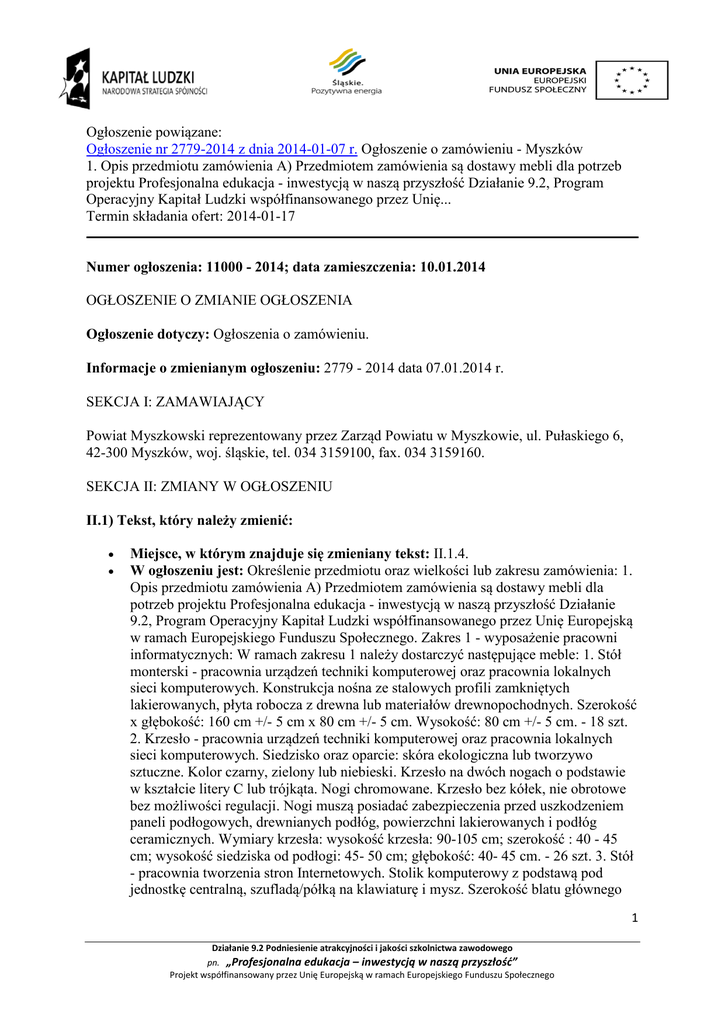 Ogłoszenie powiązane: Ogłoszenie nr 2779-2014 z dnia 2014-01-07 r. Ogłoszenie o zamówieniu - Myszków 1. Opis przedmiotu zamówienia A) Przedmiotem zamówienia są dostawy mebli dla potrzeb projektu Profesjonalna edukacja - inwestycją w naszą przyszłość Działanie 9.2, Program Operacyjny Kapitał Ludzki współfinansowanego przez Unię... Termin składania ofert: 2014-01-17 Numer ogłoszenia: 11000 - 2014; data zamieszczenia: 10.01.2014 OGŁOSZENIE O ZMIANIE OGŁOSZENIA Ogłoszenie dotyczy: Ogłoszenia o zamówieniu. Informacje o zmienianym ogłoszeniu: 2779 - 2014 data 07.01.2014 r. SEKCJA I: ZAMAWIAJĄCY Powiat Myszkowski reprezentowany przez Zarząd Powiatu w Myszkowie, ul. Pułaskiego 6, 42-300 Myszków, woj. śląskie, tel. 034 3159100, fax. 034 3159160. SEKCJA II: ZMIANY W OGŁOSZENIU II.1) Tekst, który należy zmienić: • • Miejsce, w którym znajduje się zmieniany tekst: II.1.4. W ogłoszeniu jest: Określenie przedmiotu oraz wielkości lub zakresu zamówienia: 1. Opis przedmiotu zamówienia A) Przedmiotem zamówienia są dostawy mebli dla potrzeb projektu Profesjonalna edukacja - inwestycją w naszą przyszłość Działanie 9.2, Program Operacyjny Kapitał Ludzki współfinansowanego przez Unię Europejską w ramach Europejskiego Funduszu Społecznego. Zakres 1 - wyposażenie pracowni informatycznych: W ramach zakresu 1 należy dostarczyć następujące meble: 1. Stół monterski - pracownia urządzeń techniki komputerowej oraz pracownia lokalnych sieci komputerowych. Konstrukcja nośna ze stalowych profili zamkniętych lakierowanych, płyta robocza z drewna lub materiałów drewnopochodnych. Szerokość x głębokość: 160 cm +/- 5 cm x 80 cm +/- 5 cm. Wysokość: 80 cm +/- 5 cm. - 18 szt. 2. Krzesło - pracownia urządzeń techniki komputerowej oraz pracownia lokalnych sieci komputerowych. Siedzisko oraz oparcie: skóra ekologiczna lub tworzywo sztuczne. Kolor czarny, zielony lub niebieski. Krzesło na dwóch nogach o podstawie w kształcie litery C lub trójkąta. Nogi chromowane. Krzesło bez kółek, nie obrotowe bez możliwości regulacji. Nogi muszą posiadać zabezpieczenia przed uszkodzeniem paneli podłogowych, drewnianych podłóg, powierzchni lakierowanych i podłóg ceramicznych. Wymiary krzesła: wysokość krzesła: 90-105 cm; szerokość : 40 - 45 cm; wysokość siedziska od podłogi: 45- 50 cm; głębokość: 40- 45 cm. - 26 szt. 3. Stół - pracownia tworzenia stron Internetowych. Stolik komputerowy z podstawą pod jednostkę centralną, szufladą/półką na klawiaturę i mysz. Szerokość blatu głównego 1 Działanie 9.2 Podniesienie atrakcyjności i jakości szkolnictwa zawodowego pn. „Profesjonalna edukacja – inwestycją w naszą przyszłość” Projekt współfinansowany przez Unię Europejską w ramach Europejskiego Funduszu Społecznego 100 cm +/-10cm. - 9 szt. 4. Fotel obrotowy - pracownia tworzenia stron internetowych. Siedzisko oraz oparcie: skóra ekologiczna lub tworzywo sztuczne. Kolor czarny, grafitowy, szary. Wymiary krzesła: wysokość krzesła: 90-105 cm; szerokość: 40 - 45 cm; wysokość siedziska od podłogi: 45- 50 cm; głębokość: 40- 45 cm. - 13 szt. Zakres 2 - wyposażenie pracowni hotelarskiej: W ramach zakresu 2 należy dostarczyć następujące meble: 1. Wyposażenie dydaktyczne do pracowni hotelarskiej - pokoju hotelowego: łóżko jednoosobowe. Łóżko jednoosobowe ze szczytem min. 90 x 200 cm, kolor ciemny (wenge, ciemny orzech, dąb sutter lub inne odcienie ciemnego brązu). - 1 szt. 2. Wyposażenie dydaktyczne do pracowni hotelarskiej - pokoju hotelowego: stolik nocny/szafka. Stolik nocny wolnostojący, wymiary blatu 45 x 45 +/- 5cm, wysokość 60 +/- 10 cm, kolor ciemny (wenge, ciemny orzech, dąb sutter lub inne odcienie ciemnego brązu). - 1 szt. 3. Wyposażenie dydaktyczne do pracowni hotelarskiej - pokoju hotelowego: szafa z wieszakami. Szafa z wieszakami i półkami wolnostojąca dwuskrzydłowa głębokość 60 +/- 5 cm, szerokość 80-90 cm, wysokość 190 +/- 10cm, kolor ciemny (wenge, ciemny orzech, dąb sutter lub inne odcienie ciemnego brązu). - 1 szt. 4. Wyposażenie dydaktyczne do pracowni hotelarskiej - pokoju hotelowego: biurko. Biurko o wymiarach głębokość 50 - 60 cm, długość 100 -120 cm, wysokość 75 - 80 cm, kolor ciemny (wenge, ciemny orzech, dąb sutter lub inne odcienie ciemnego brązu). - 1 szt. 5. Wyposażenie dydaktyczne do pracowni hotelarskiej - pokoju hotelowego: krzesło. Krzesła dostosowane do biurka (poz. 10) kolor ciemny (wenge, ciemny orzech, dąb sutter lub inne odcienie ciemnego brązu).Wymiary: szerokość: 45 +/- 5 cm, wysokość: 100 +/- 5 cm, głębokość: 40 +/- 5 cm, wysokość siedziska: 45 +/- cm. - 2 szt. 6. Wyposażenie dydaktyczne do pracowni hotelarskiej - pokoju hotelowego: bagażnik. Bagażnik wymiary długość 80 - 100 cm, głębokość 45 - 60 cm, wysokość od podłogi 40 - 45 cm, konstrukcja może być ze stelażem stalowym, całość z płyty koloru ciemny (wenge, ciemny orzech, dąb sutter lub inne odcienie ciemnego brązu). - 1 szt. 7. Wyposażenie dydaktyczne do pracowni hotelarskiej - pokoju hotelowego: lustro. Lustro 120 x 70 +/- 10 cm, oprawa drewniana, kolor ciemny (wenge, ciemny orzech, dąb sutter lub inne odcienie ciemnego brązu). - 1 szt. 8. Wyposażenie dydaktyczne do pracowni hotelarskiej - pokoju hotelowego: wieszak na wierzchnią odzież. Wieszak na odzież wierzchnią 80 cm +/-5 cm, kolor ciemny (wenge, ciemny orzech, dąb sutter lub inne odcienie ciemnego brązu), wiszący, dopasowany do mebli hotelowych. - 1 szt. 9. Wyposażenie dydaktyk. do pracowni hotelarskiej - pokoju hotelowego: lustro łazienkowe. Lustro łazienkowe wymiary 80 x 60 cm +/- 5 cm, obudowa drewniana, kolor ciemny (wenge, ciemny orzech, dąb sutter lub inne odcienie ciemnego brązu). 1 szt. Zakres 3 - meble metalowe: W ramach zakresu 3 należy dostarczyć następujące meble: 1. Wyposażenie dydaktyczne do pracowni hotelarskiej - pokoju hotelowego: r