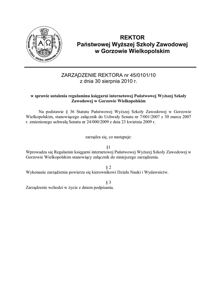 REKTOR Państwowej Wyższej Szkoły Zawodowej w Gorzowie Wielkopolskim ZARZĄDZENIE REKTORA nr 45/0101/10 z dnia 30 sierpnia 2010 r. w sprawie ustalenia regulaminu księgarni internetowej Państwowej Wyższej Szkoły Zawodowej w Gorzowie Wielkopolskim Na podstawie § 36 Statutu Państwowej Wyższej Szkoły Zawodowej w Gorzowie Wielkopolskim, stanowiącego załącznik do Uchwały Senatu nr 7/001/2007 z 30 marca 2007 r. zmienionego uchwałą Senatu nr 24/000/2009 z dnia 23 kwietnia 2009 r. zarządza się, co następuje: §1 Wprowadza się Regulamin księgarni internetowej Państwowej Wyższej Szkoły Zawodowej w Gorzowie Wielkopolskim stanowiący załącznik do niniejszego zarządzenia. §2 Wykonanie zarządzenia powierza się kierownikowi Działu Nauki i Wydawnictw. §3 Zarządzenie wchodzi w życie z dniem podpisania.