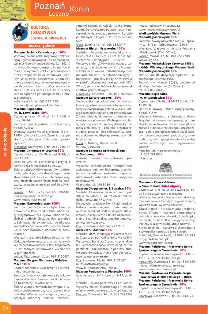 KULTURA I ROZRYWKA CULTURE & GOING OUT muzea, galerie Muzeum Technik Ceramicznych: 50% Wystawy: fajans kolski (u¿ytkowy i dekoracyjny, rêcznie malowany) – od pocz¹tku powstania Fabryki Freudenreichów (w 1842 r.) do wyrobów wspó³czesnych, fajans i ceramika z 38 wytwórni polskich produkuj¹cych przed II wojn¹ œw. (m.in. Baranówka, Æmielów, W³oc³awek, Boles³awiec, Chodzie¿), prace autorskie rêcznie malowane, osobliwe zbiory tzw. lavinitu z W³oc³awka z zak³adu Krupki i Perlicza z I po³. XX w., zbiory archeologiczne z gotyckiego zamku i ratusza kolskiego. Ko³o, Kajki 44, tel. 063 2721559 [email protected], www.kolo.pl/mtc Muzeum Regionalne im. H. £awniczaka: 50% Czynne: pn–czw 10–16, pt 10–17, I i III nd m-ca 10–14. Siedziba: gmach poklasztorny trynitarzy z I po³. XVIII w. Wystawy: „Dzieje miasta Krotoszyn” (1415– 1945), „Kultura ludowa Ziemi Krotoszyñskiej”, „Krotoszyn w malarstwie, rysunku i grafice”. Krotoszyn, Ma³y Rynek 1, tel. 062 7226147 Muzeum Okrêgowe w Lesznie: 50% Czynne: wt i czw 13–18, œr i pt 9–14, sb i nd 10–14. Siedziba: XVIII-w. pastorówka i przyleg³a kamieniczka mieszczañska z XIX w. Zbiory: galeria XVIII w. portretów trumiennych, galeria portretu dworskiego, malarstwa polskiego XIX i XX w. o tematyce wiejskiej, zbiory dotycz¹ce historii regionu, bractwa kurkowego, zbiory starodruków z XVII– XIX w. Leszno, pl. Metziga 17, tel.065 5296140 [email protected] www.muzeum.leszno.pl Muzeum Martyrologiczne: 100% Siedziba: miejsce pamiêci – by³e obozy hitlerowskie w latach 1941–1945, obóz pracy przymusowej dla ¯ydów, obóz karnoœledczy podleg³y Gestapo. Poprzez obóz w ¯abikowie kierowano ludzi do obozów koncentracyjnych m.in. w Oœwiêcimiu, GrossRosen, Sachsenhausen, Ravensbrück, Mauthausen. Wystawy: na terenie by³ego obozu karnoœledczego dokumentuj¹ i upamiêtniaj¹ walkê i mêczeñstwo ludnoœci z tzw. Kraju Warty i ludzi ró¿nych narodowoœci wiêzionych w tych obozach. Luboñ, Niez³omnych 2, tel. 061 8130681 Muzeum Misyjne Misjonarzy Oblatów M.N.: 100% Czynne: codziennie. Zwiedzanie po uprzednim umówieniu siê. Siedziba: Dwie wyodrêbnione sale w kompleksie Wy¿szego Seminarium Duchownego Misjonarzy Oblatów M.N. Zbiory: Wyroby rzemios³a ludowego i artyku³ów codziennego u¿ytku z ró¿nych terenów Afryki (Kamerun, Madagaskar, Lesoto), Ameryki Pó³nocnej (Indianie, Eskimosi), 94 Ameryki £aciñskiej, Azji (Sri Lanka, Hongkong). Oprowadzanie po zabytkowym pocysterskim klasztorze, barokowym koœciele parafialnym z krypt¹ oraz czêœci seminarium. Obra, Szkolna 12, tel. 068 3842047 Muzeum Historii Przemys³u: 100% Siedziba: klasycystyczna manufaktura sukiennicza A.G. Fiedlera, z I po³. XIX w. (powierzchnia 5 kondygnacji – 1862 m2). Wystawy sta³e: „XIX-wieczne napêdy, wynalazcy, pracuj¹ce maszyny”, „Przemys³ w kaliskim w okresie industrializacji ziem polskich XIX w.”, „Zabytkowe maszyny – bonneterie – projekty mody XX w. PWSSP w £odzi”, „Fortepiany firm polskich XIX– XX w.”, jedyna w Polsce kolekcja koronek i haftów przemys³owych. Opatówek, Koœcielna 1, tel. 062 7618626 Muzeum Kultury Ludowej: 30% Siedziba: Skansen po³o¿ony na 14 ha w malowniczej dolinie £obozonki na terenie cmentarzyska cia³opalnego z ok. VI w. p.n.e., którego czêœæ udostêpniona jest zwiedzaj¹cym. Zbiory: obiekty dawnego budownictwa wiejskiego z pó³nocnej Wielkopolski – chaty, zagrody, wiatraki, remizê stra¿ack¹ oraz ma³¹ architekturê – kapliczki przydro¿ne, studnie, piwnice, piec chlebowy. W sezonie w skansenie odbywaj¹ siê imprezy folklorystyczne. Osiek n. Noteci¹, Dworcowa 8 tel. 067 2866090 Muzeum Edmunda Bojanowskiego w Grabonogu: 50% Siedziba: odrestaurowany dworek z po³. XVIII w. Wystawy: archeologiczna, etnograficzna zwi¹zana z regionem Biskupizny, drewniana rzeŸba ludowa, malarstwo i grafika, obok dworku internat z tanimi miejscami noclegowymi. Grabonóg, tel. 065 5739146 Muzeum Okrêgowe im. S. Staszica: 30% Siedziba: Kamienica mieszczañska z II po³. XIX w. W latach 1934–39 obiekt by³ siedzib¹ Konsulatu RP w Pile. Ekspozycje: pradzieje Ziemi Nadnoteckiej, historia miasta i regionu, mebli wnêtrza mieszkalne od po³. XVIII w. do pocz. XX w., rzemios³o artystyczne i sztuka u¿ytkowa – srebro, ceramika, szk³o, ponadto tematyczne wystawy czasowe. Pi³a, Browarna 7, tel. 067 2127137 Muzeum S. Staszica: 50% Siedziba: dom, w którym mieszka³a rodzina Staszica od po³. XVII w. do koñca XVIII w. Wystawa: „Stanis³aw Staszic – ¿ycie i dzie³a” – prezentacja epoki, w której ¿y³, zestaw pami¹tek i dokumentów z podró¿y, zbiór eksponatów zwi¹zanych z jego geologicznymi zainteresowaniami. Pi³a, Browarna 18, tel. 067 2131567 [email protected] www.muzeumstaszica.i-pila.pl Muzeum Regionalne w Pleszewie: 100% Czynne: wt, œr 9–17, czw, pt 9–14, sb 9– 12. Siedziba – zajazd pocztowy z I po³. XIX w. Wystawy zmienne: archeologia i historia miasta i okolic, galeria sztuki wspó³czesnej. Pleszew, Poznañska 34, tel. 062 7428359 [email protected] www.muzeum-pleszew.isnet.pl Wielkopolskie Muzeum Walk Niepodleg³oœciowych: 50% Siedziba: dawny odwach z XVIII w., spalony w 1945 r. – odbudowany 1950 r. Wystawy: czasowe – historia Poznania i Wielkopolski (XIX i XX w.). Poznañ, WoŸna 12, tel. 061 8517288 [email protected] Muzeum Poznañskiego Czerwca 1956 r. – Oddz. Wielkopolskiego Muzeum Walk Niepodleg³oœciowych: 50% Zbiory: pami¹tki dotycz¹ce wydarzeñ „Poznañskiego Czerwca 1956”. Poznañ, œw. Marcin 80/82, wejœcie od al. Niepodleg³oœci 14 (CK Zamek) tel. 061 8529464 Muzeum Regionalne im. W. Dutkiewicz: 50% Czynne: wt–sb 9–16, nd 14–17 (IV–IX), 13– 16 (X–III). Siedziba: Dawny ratusz klasycystyczny, z I po³. XIX w. Wystawy: historyczna obrazuj¹ca dzieje RogoŸna od czasów najdawniejszych (archeologia, archiwalia, realia – pami¹tki cechowe i bractwa strzeleckiego), przyrodnicza – zbiory zoologiczne (