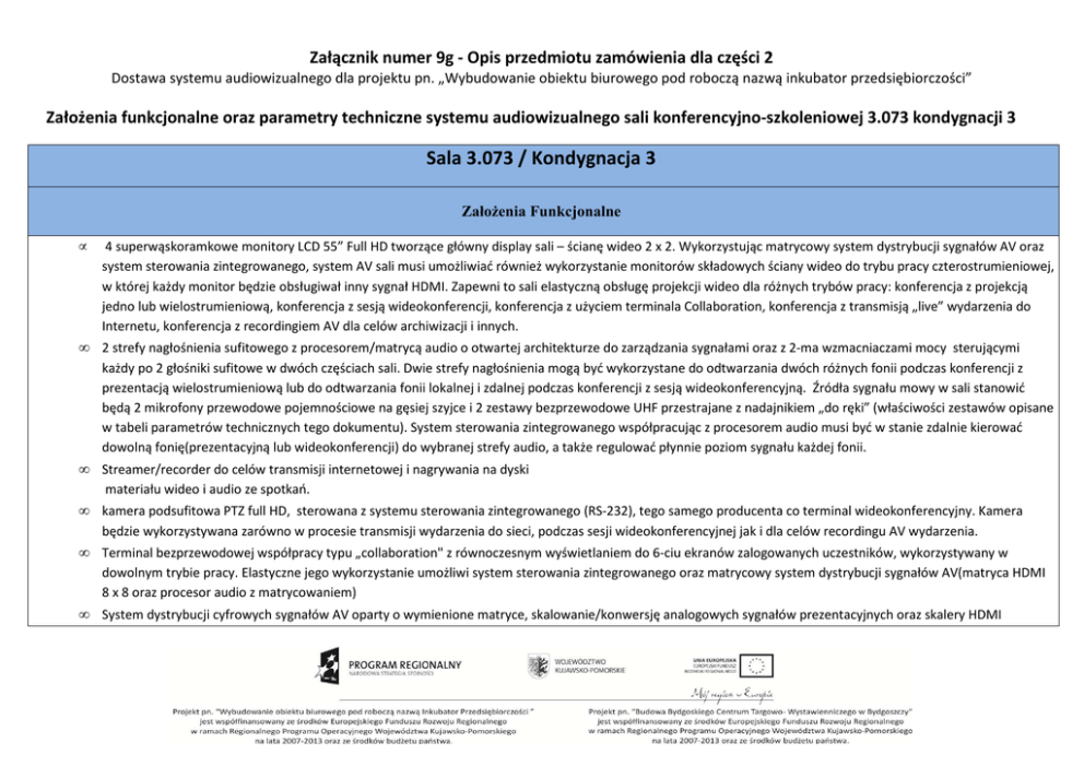 Załącznik numer 9g - Opis przedmiotu zamówienia dla części 2 Dostawa systemu audiowizualnego dla projektu pn. „Wybudowanie obiektu biurowego pod roboczą nazwą inkubator przedsiębiorczości” Założenia funkcjonalne oraz parametry techniczne systemu audiowizualnego sali konferencyjno-szkoleniowej 3.073 kondygnacji 3 Sala 3.073 / Kondygnacja 3 Założenia Funkcjonalne • 4 superwąskoramkowe monitory LCD 55” Full HD tworzące główny display sali – ścianę wideo 2 x 2. Wykorzystując matrycowy system dystrybucji sygnałów AV oraz system sterowania zintegrowanego, system AV sali musi umożliwiać również wykorzystanie monitorów składowych ściany wideo do trybu pracy czterostrumieniowej, w której każdy monitor będzie obsługiwał inny sygnał HDMI. Zapewni to sali elastyczną obsługę projekcji wideo dla różnych trybów pracy: konferencja z projekcją jedno lub wielostrumieniową, konferencja z sesją wideokonferencji, konferencja z użyciem terminala Collaboration, konferencja z transmisją „live” wydarzenia do Internetu, konferencja z recordingiem AV dla celów archiwizacji i innych. • 2 strefy nagłośnienia sufitowego z procesorem/matrycą audio o otwartej architekturze do zarządzania sygnałami oraz z 2-ma wzmacniaczami mocy sterującymi każdy po 2 głośniki sufitowe w dwóch częściach sali. Dwie strefy nagłośnienia mogą być wykorzystane do odtwarzania dwóch różnych fonii podczas konferencji z prezentacją wielostrumieniową lub do odtwarzania fonii lokalnej i zdalnej podczas konferencji z sesją wideokonferencyjną. Źródła sygnału mowy w sali stanowić będą 2 mikrofony przewodowe pojemnościowe na gęsiej szyjce i 2 zestawy bezprzewodowe UHF przestrajane z nadajnikiem „do ręki” (właściwości zestawów opisane w tabeli parametrów technicznych tego dokumentu). System sterowania zintegrowanego współpracując z procesorem audio musi być w stanie zdalnie kierować dowolną fonię(prezentacyjną lub wideokonferencji) do wybranej strefy audio, a także regulować płynnie poziom sygnału każdej fonii. • Streamer/recorder do celów transmisji internetowej i nagrywania na dyski materiału wideo i audio ze spotkań. • kamera podsufitowa PTZ full HD, sterowana z systemu sterowania zintegrowanego (RS-232), tego samego producenta co terminal wideokonferencyjny. Kamera będzie wykorzystywana zarówno w procesie transmisji wydarzenia do sieci, podczas sesji wideokonferencyjnej jak i dla celów recordingu AV wydarzenia. • Terminal bezprzewodowej współpracy typu „collaboration" z równoczesnym wyświetlaniem do 6-ciu ekranów zalogowanych uczestników, wykorzystywany w dowolnym trybie pracy. Elastyczne jego wykorzystanie umożliwi system sterowania zintegrowanego oraz matrycowy system dystrybucji sygnałów AV(matryca HDMI 8 x 8 oraz procesor audio z matrycowaniem) • System dystrybucji cyfrowych sygnałów AV oparty o wymienione matryce, skalowanie/konwersję analogowych sygnałów prezentacyjnych oraz skalery HDMI up/down, dostosowujące parametry przychodzącego sygnału wideo do informacji z ramki EDID obsługiwanego wyświetlacza. • Terminal wideokonferencyjny HD bez mostka, z kamerą własną oraz dodatkową zewnętrzną kamerą podsufitową, sterowaną za pomocą systemu sterowania zintegrowanego. System AV tej sali w warstwie sygnałowej i sterującej musi elastycznie obsługiwać tryb „Wideokonferencja” z wykorzystaniem: a)dodatkowej kamery podsufitowej, b) jednostrumieniowej projekcji wideo na dużym displaju 2 x 2, c) czterostrumieniowej projekcji wideo z niezależną pracą monitorów składowych ściany wideo , d)drugiej strefy nagłośnienia dla fonii przychodzącej wideokonferencji. • System sterowania zintegrowanego realizujący pełną obsługę systemu AV dla wszystkich trybów pracy, wykorzystywać ma panel sterujący/kontroler 7”, wbudowany w ścianę sali oraz tablet 8” oprogramowany i przystosowany do pracy jako przenośny, bezprzewodowy panel sterujący. Systemy sterowania dla sal parteru i kondygnacji 3 muszą być produktami tego samego producenta. Oprogramowanie i interfejsy systemu sterowania muszą umożliwić (poprzez zakładki layoutu paneli dotykowych) kontrolę warstw: wideo(routing źródeł), audio(routing źródeł i regulacja poziomów fonii), światła(wybór sceny świetlnej lub wyłączenie światła), załączania i wyłączania warstw składowych oraz całości systemu AV, a także automatyczną obsługę przy użyciu makroprogramów wszystkich podstawowych trybów pracy. • 2 Przyłącza stołowe AV z wyciąganymi kablami HDMI, VGA oraz fonicznym z wtykiem 3,5mm stereo(wersja bez retraktorów). Dodatkowe gniazda w puszkach przyłącza to: RJ45, XLR(F), 2 x 230V. Tabela parametrów technicznych podaje zestaw dodatkowych kabli i złączy w relacji przyłącza stołowe – szafa rackowa , które Dostawca systemu AV musi przewidzieć w swojej wycenie. • • Szafa rackowa 60 x 60 24U na kółkach jako centrala systemowa. Sala 3.073 posiada podłogę techniczną oraz modułowy sufit powieszony, zatem prowadzenie okablowań systemu AV jest proste (Uzupełnienie torów kablowych w zainstalowanych przez generalnego wykonawcę inwestycji puszkach podłogowych, budowa nowych tras pionowych przy szafie rackowej oraz prowadzenie nowych okablowań w przestrzeni międzystropowej). Schemat blokowy warstwy audio i wideo dla sali przedstawiony jest na "Rys. nr 3: Schemat blokowy transmisji AV sala konferencyjna 3.073 kondygnacji 3.” System sterowania ma wykorzystywać wersję kontrolera wbudowanego w ścienny panel sterujący 7”. Do wbudowania panela/kontrolera w ścianę należy użyć oddzielnie zamawiany back - box systemowy. Do załączania i wyłączania urządzeń i systemu sterowania należy użyć (tak jak w salach parteru) systemowy moduł 8 przekaźników 230V 10A, umieszczony razem z innymi elementami systemu zasilania w panelu rozdziału napięć 3U szafy rackowej. Cechy 