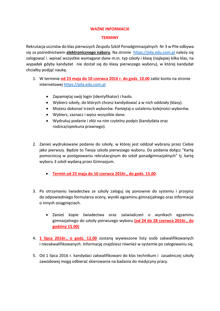 WAŻNE INFORMACJE TERMINY Rekrutacja uczniów do klas pierwszych Zespołu Szkół Ponadgimnazjalnych Nr 3 w Pile odbywa się za pośrednictwem elektronicznego naboru. Na stronie https://pila.edu.com.pl należy się zalogować i wpisać wszystkie wymagane dane m.in. typ szkoły i klasę (najlepiej kilka klas, na wypadek gdyby kandydat nie dostał się do klasy pierwszego wyboru), w której kandydat chciałby podjąć naukę. 1. W terminie od 23 maja do 10 czerwca 2016 r. do godz. 10.00 załóż konto na stronie internetowej https://pila.edu.com.pl Zapamiętaj swój login (identyfikator) i hasło. Wybierz szkoły, do których chcesz kandydować a w nich oddziały (klasy). Możesz dokonać trzech wyborów. Pamiętaj o ustaleniu kolejności wyborów. Wybierz, zaznacz i wpisz wszystkie dane. Wydrukuj podanie i złóż na nim czytelny podpis (kandydata oraz rodzica/opiekuna prawnego). 2. Zanieś wydrukowane podanie do szkoły, w której jest oddział wybrany przez Ciebie jako pierwszy. Będzie to Twoja szkoła pierwszego wyboru. Do podania dołącz "Kartę pomocniczą w postępowaniu rekrutacyjnym do szkół ponadgimnazjalnych" tj. kartę wyboru 3 szkół wydaną przez Gimnazjum. Termin od 23 maja do 10 czerwca 2016r., do godz. 15.00. 3. Po otrzymaniu świadectwa ze szkoły zaloguj się ponownie do systemu i przepisz do odpowiedniego formularza oceny, wyniki egzaminu gimnazjalnego oraz informacje o innych osiągnięciach. Zanieś kopie świadectwa oraz zaświadczeń o wynikach egzaminu gimnazjalnego do szkoły pierwszego wyboru (od 24 do 28 czerwca 2016r., do godziny 15.00) 4. 1 lipca 2016r., o godz. 12.00 zostaną wywieszone listy osób zakwalifikowanych i niezakwalifikowanych. Informację znajdziesz również w systemie po zalogowaniu się. 5. Od 1 lipca 2016 r. kandydaci zakwalifikowani do klas technikum i zasadniczej szkoły zawodowej mogą odbierać skierowania na badania do medycyny pracy. 6. Aby potwierdzić wolę podjęcia nauki w szkole, do której zostałeś zakwalifikowany, do dnia 25 lipca 2016 r., do godz. 13.00 dostarcz do tej szkoły oryginał świadectwa ukończenia gimnazjum i oryginały zaświadczeń o wynikach egzaminu. 7. Do dnia 25 lipca 2016 r., do godz. 13.00 musisz dostarczyć z medycyny pracy zgodę na podjęcie nauki w wybranym zawodzie. 8. 26 lipca 2016 r. o godz. 13.00 wywieszone zostaną listy osób przyjętych oraz listy wolnych miejsc.