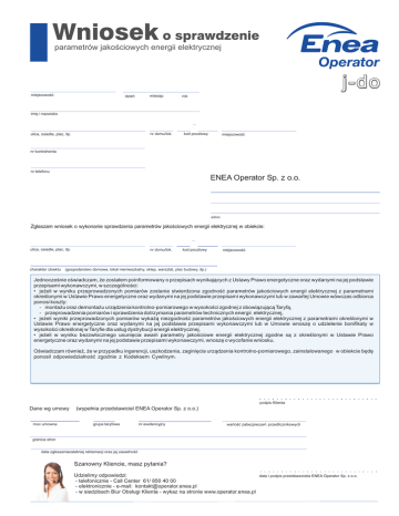 parametrów jakoœciowych energii elektrycznej j-do miejscowoœæ dzieñ miesi¹c rok imiê i nazwisko nr domu/lok. ulica, osiedle, plac, itp. kod pocztowy miejscowoœæ nr kontrahenta nr telefonu ENEA Operator Sp. z o.o. adres Zg³aszam wniosek o wykonanie sprawdzenia parametrów jakoœciowych energii elektrycznej w obiekcie: ulica, osiedle, plac, itp. charakter obiektu nr domu/lok. kod pocztowy miejscowoœæ (gospodarstwo domowe, lokal niemieszkalny, sklep, warsztat, plac budowy, itp.) Jednoczeœnie oœwiadczam, ¿e zosta³em poinformowany o przepisach wynikaj¹cych z Ustawy Prawo energetyczne oraz wydanymi na jej podstawie przepisami wykonawczymi, w szczególnoœci: • je¿eli w wyniku przeprowadzonych pomiarów zostanie stwierdzona zgodnoœæ parametrów jakoœciowych energii elektrycznej z parametrami okreœlonymi w Ustawie Prawo energetyczne oraz wydanymi na jej podstawie przepisami wykonawczymi lub w zawartej Umowie wówczas odbiorca ponosi koszty: - monta¿u oraz demonta¿u urz¹dzenia kontrolno-pomiarowego w wysokoœci zgodnej z obowi¹zuj¹c¹ Taryf¹, - przeprowadzenia pomiarów i sprawdzenia dotrzymania parametrów technicznych energii elektrycznej, • je¿eli wyniki przeprowadzonych pomiarów wyka¿¹ niezgodnoœæ parametrów jakoœciowych energii elektrycznej z parametrami okreœlonymi w Ustawie Prawo energetyczne oraz wydanymi na jej podstawie przepisami wykonawczymi lub w Umowie wnoszê o udzielenie bonifikaty w wysokoœci okreœlonej w Taryfie dla us³ug dystrybucji energii elektrycznej, • je¿eli w wyniku bezzw³ocznego usuniêcia awarii parametry jakoœciowe energii elektrycznej zgodne s¹ z okreœlonymi w Ustawie Prawo energetyczne oraz wydanymi na jej podstawie przepisami wykonawczymi, wnoszê o wycofanie wniosku. Oœwiadczam równie¿, ¿e w przypadku ingerencji, uszkodzenia, zaginiêcia urz¹dzenia kontrolno-pomiarowego, zainstalowanego w obiekcie bêdê ponosi³ odpowiedzialnoœæ zgodnie z Kodeksem Cywilnym. podpis Klienta Dane wg umowy moc umowna (wype³nia przedstawiciel ENEA Operator Sp. z o.o.) grupa taryfowa nr ewidencyjny wartoœæ zabezpieczeñ przedlicznikowych granica stron data zg³oszeniaostatniej reklamacji oraz jej zasadnoœæ Szanowny Kliencie, masz pytania? Udzielimy odpowiedzi: - telefonicznie - Call Center 61/ 850 40 00 - elektronicznie - e-mail: [email protected] - w siedzibach Biur Obs³ugi Klienta - wykaz na stronie www.operator.enea.pl data i podpis przedstawiciela ENEA Operator Sp. z o.o. INFORMACJA TECHNICZNA (wype³nia pracownik ENEA Operator Sp. z o.o.) Identyfikacja sieciowego uk³adu zasilania – reklamowanego miejsca dostawy energii elektrycznej nazwa GPZ nazwa linii zasilaj¹cej SN nr stacji transformatorowej SN/nn 2 linia napowietrzna / kablowa 1 m, o d³ugoœci mm przekrój 2 m, mm przekrój 2 m, przy³¹cze napowietrzne / kablowe o d³ugoœci przekrój mm 1 informacje dodatkowe diagnoza przyczyn wystêpowania zak³óceñ parametrów energii elektrycznej diagnozê dokonano na podstawie zastosowane œrodki poprawy parametrów energii elektrycznej przewidywane œrodki poprawy parametrów energii elektrycznej uzasadniona - bonifikata reklamacja uzasadniona - brak bonifikaty 2 nieuzasadniona - koszty sprawdzenia uwagi dodatkowe wysokoœæ bonifikaty dzieñ miesi¹c rok opracowa³ pracownik ENEA Operator Sp. z o.o. (podpis) dzieñ miesi¹c rok zatwierdzi³ pracownik ENEA Operator Sp. z o.o. (podpis) okres obowi¹zywania bonifikaty dzieñ miesi¹c rok opracowa³ pracownik ENEA Operator Sp. z o.o. (podpis) dzieñ miesi¹c rok zatwierdzi³ dyrektor (podpis) liczba za³¹czników 1 w³aœciwe zakreœliæ 2 w³aœciwe zaznaczyæ data przekazania do komórki obs³ugi klienta dzieñ miesi¹c rok